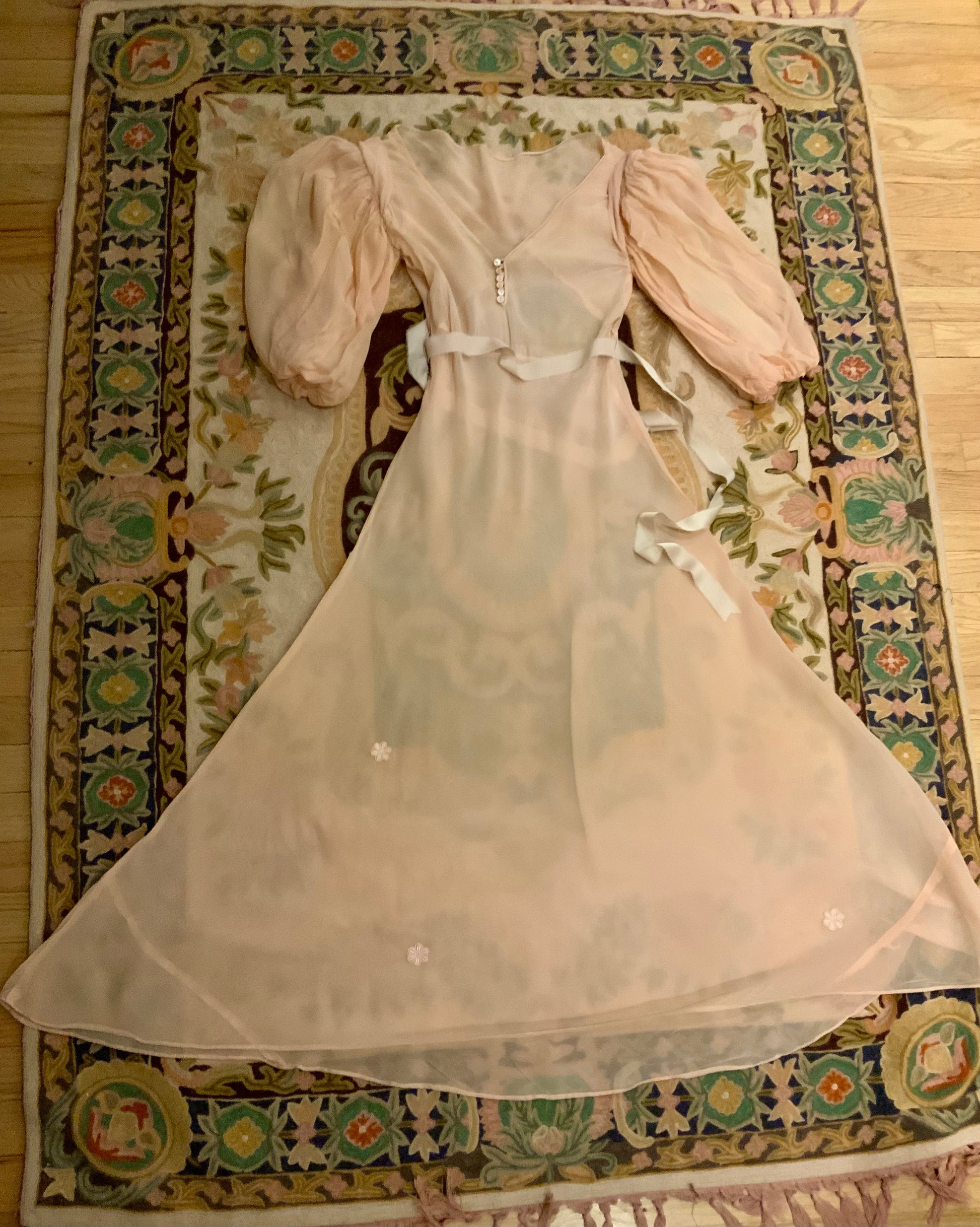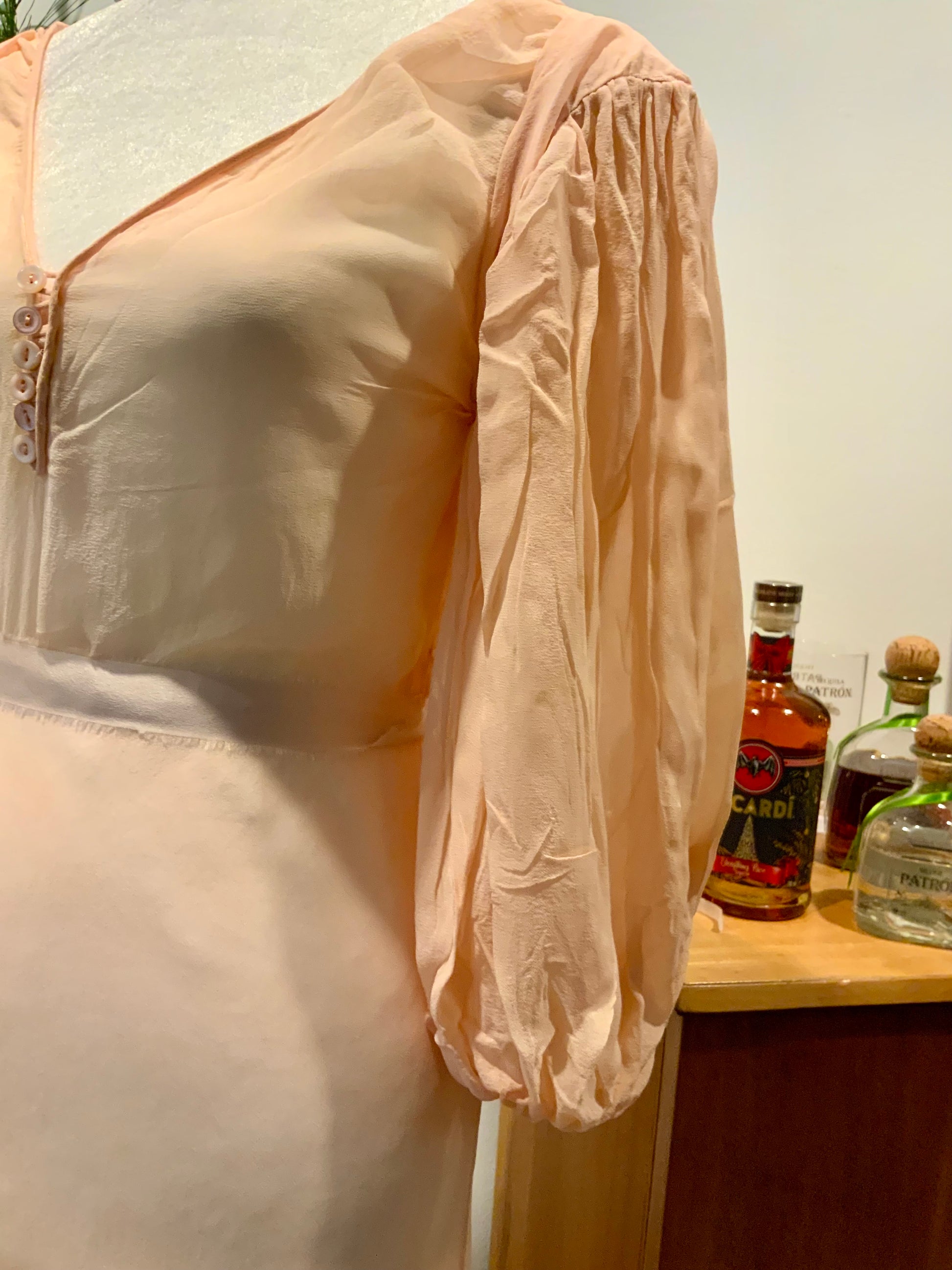 1930s Peach Silk Chiffon Gown — Bias-Cut with Bishop Sleeves