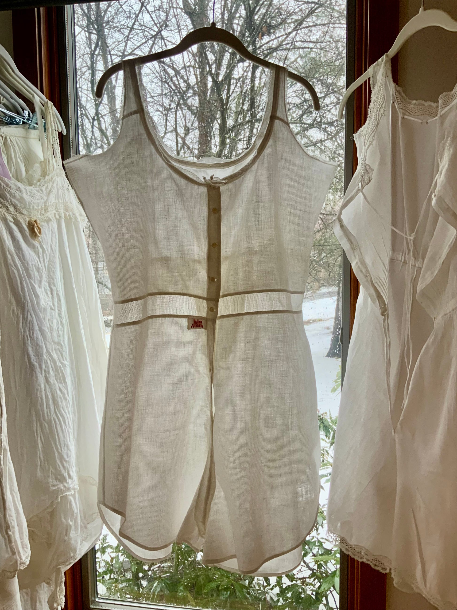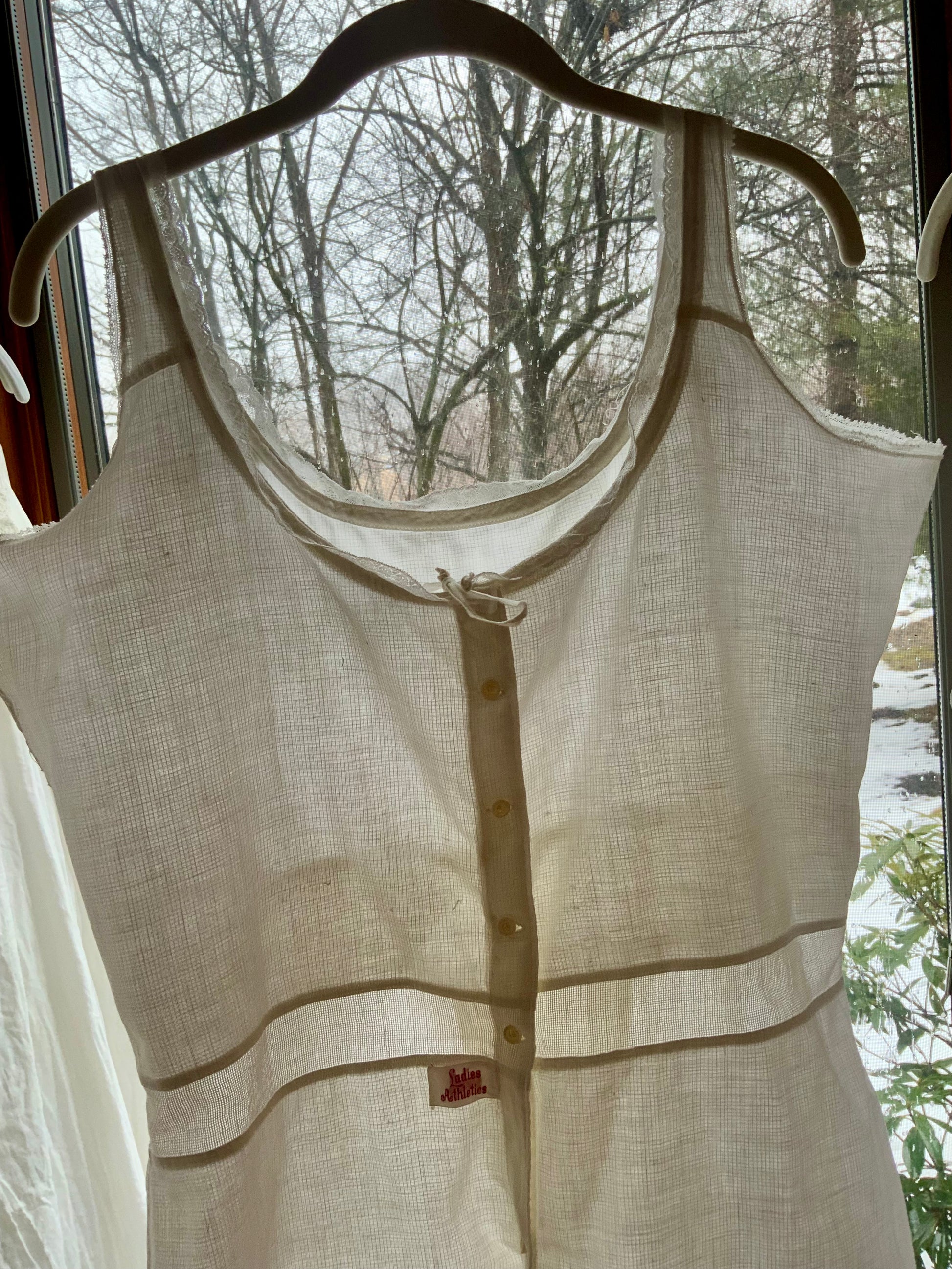 An antique women’s athletic union suit dating to the 1910s–early 1920s, made from lightweight breathable cotton and featuring the charming original “Ladies Athletics” label.