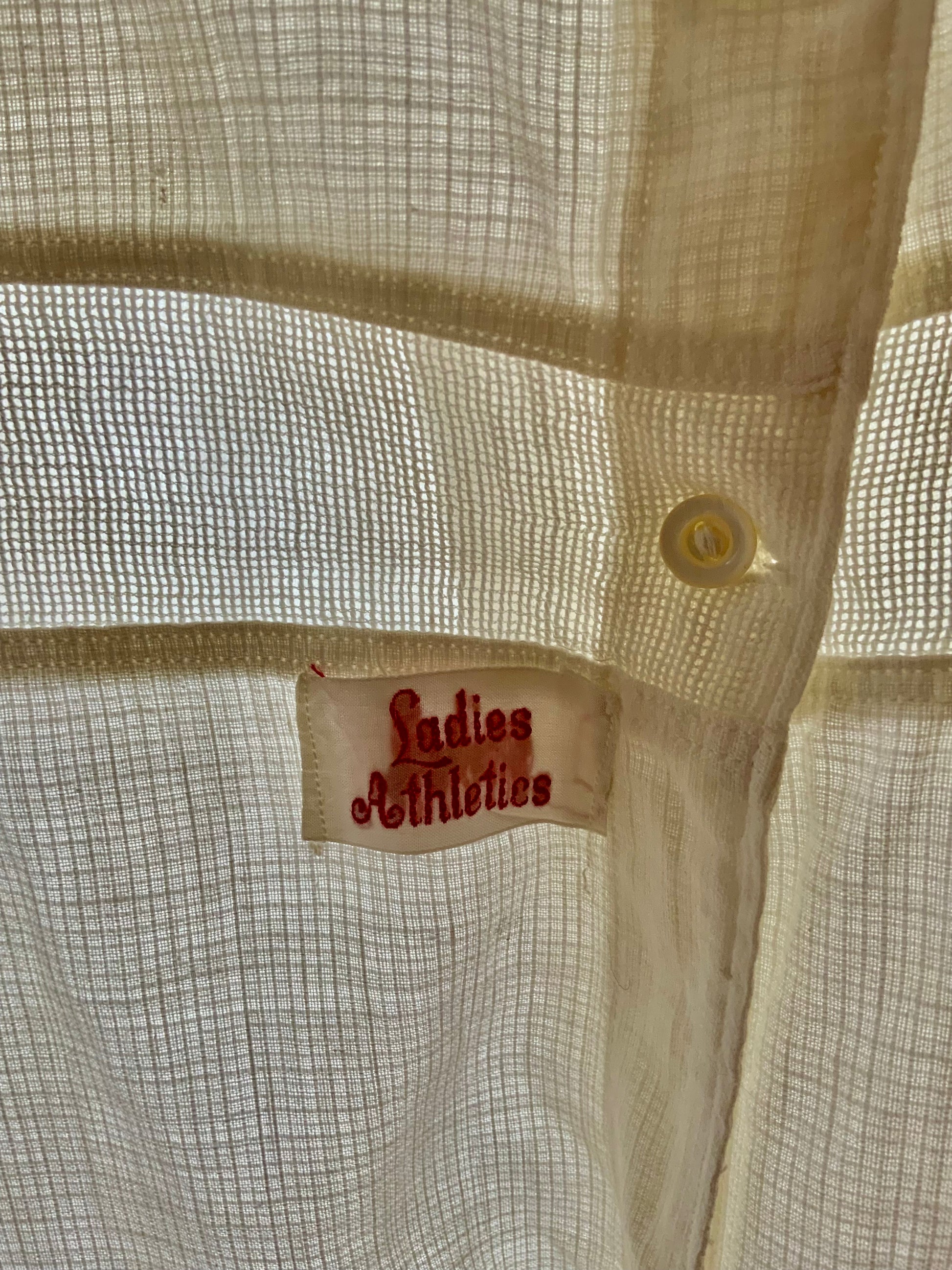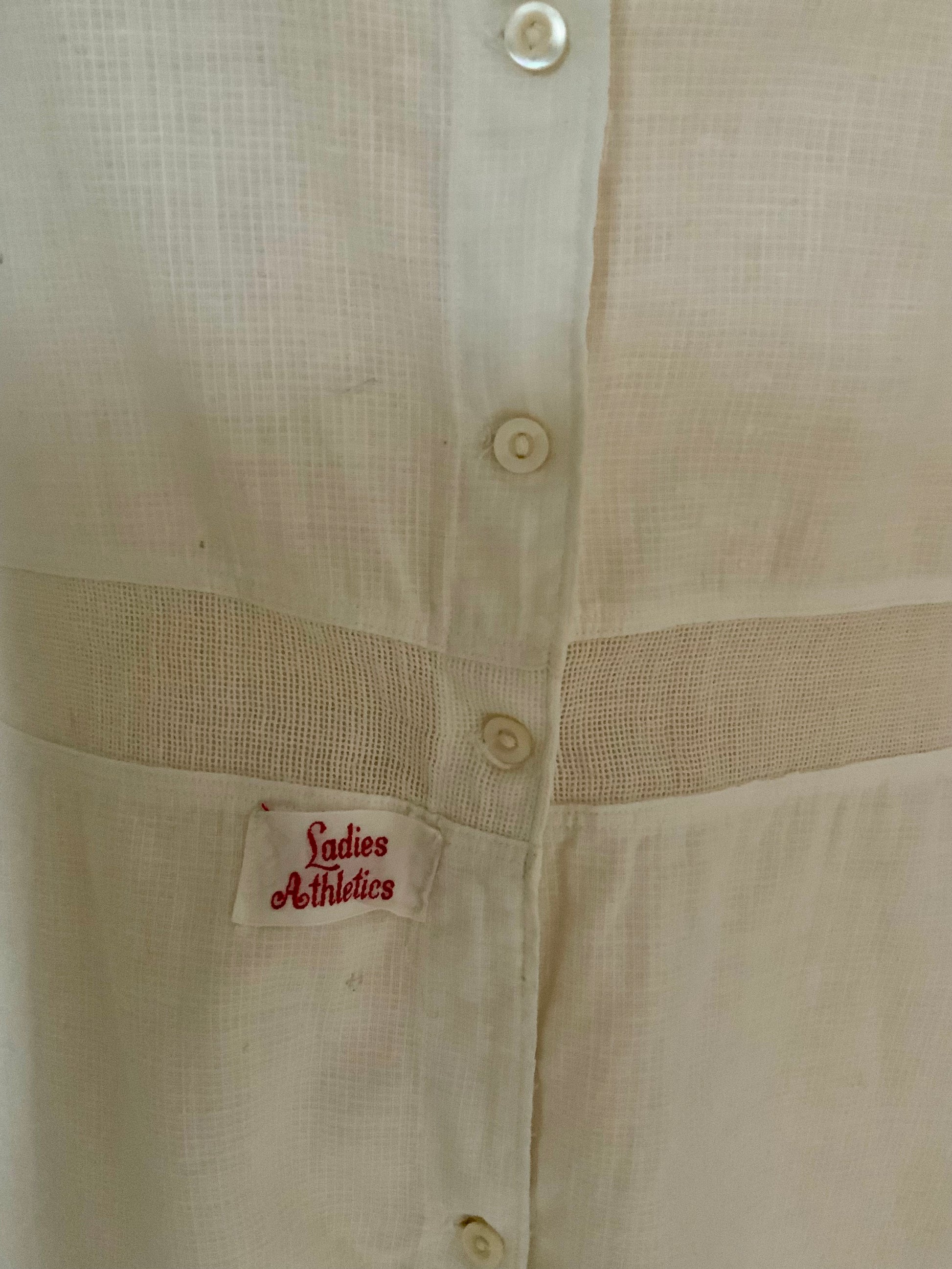 The fabric is a beautiful lightweight cotton with a subtle grid texture, allowing breathability during physical activity. The construction is simple yet elegant, with small original buttons and the rare red embroidered Ladies Athletics label.