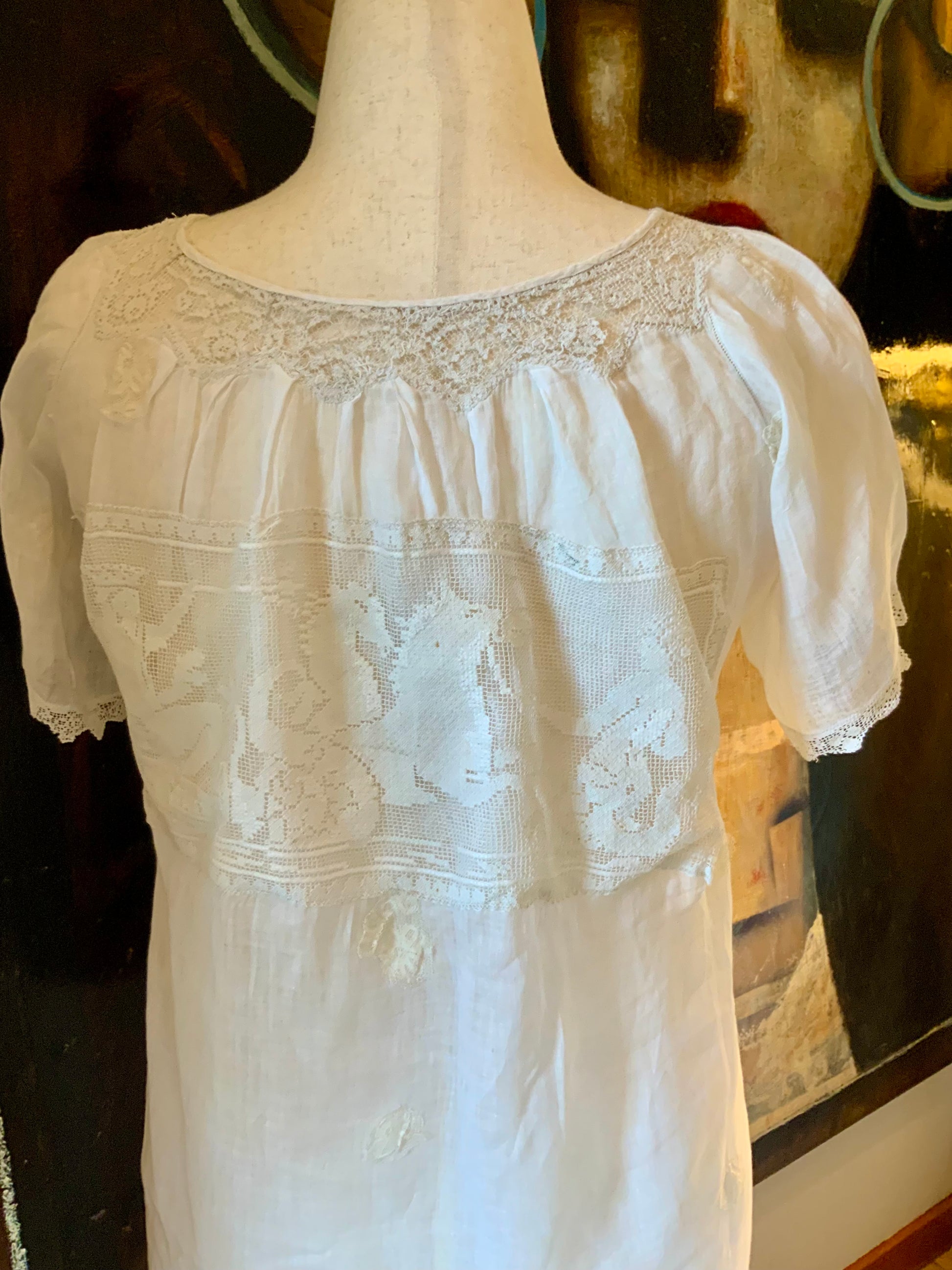 Antique Edwardian Cotton Nightgown “Carmela” Hand Repaired with Filet Lace Appliqués – Restored Heirloom Piece-ED81