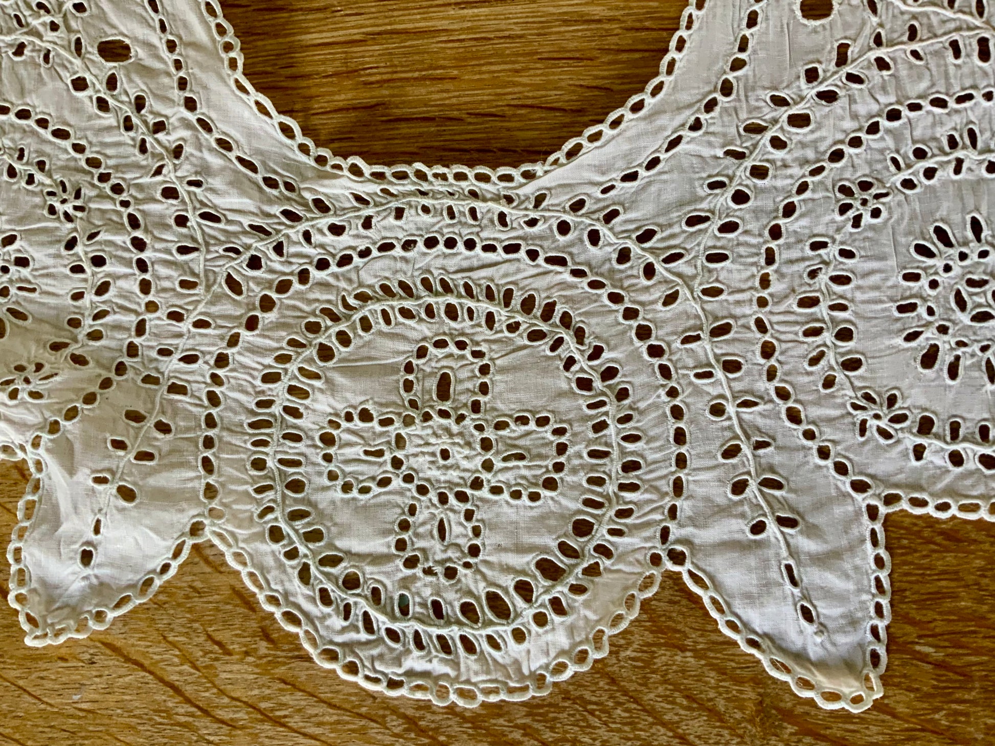 A charming antique Edwardian collar crafted in fine cotton with delicate cutwork embroidery, also known as broderie anglaise.