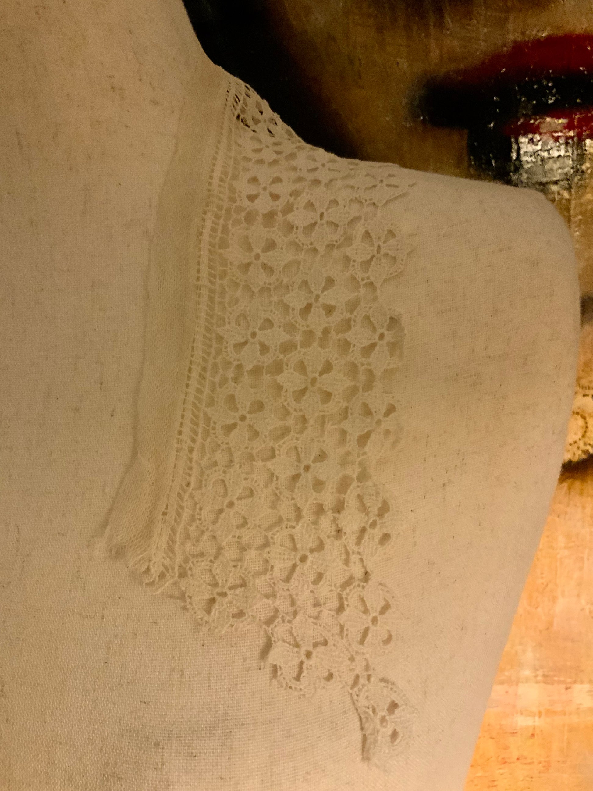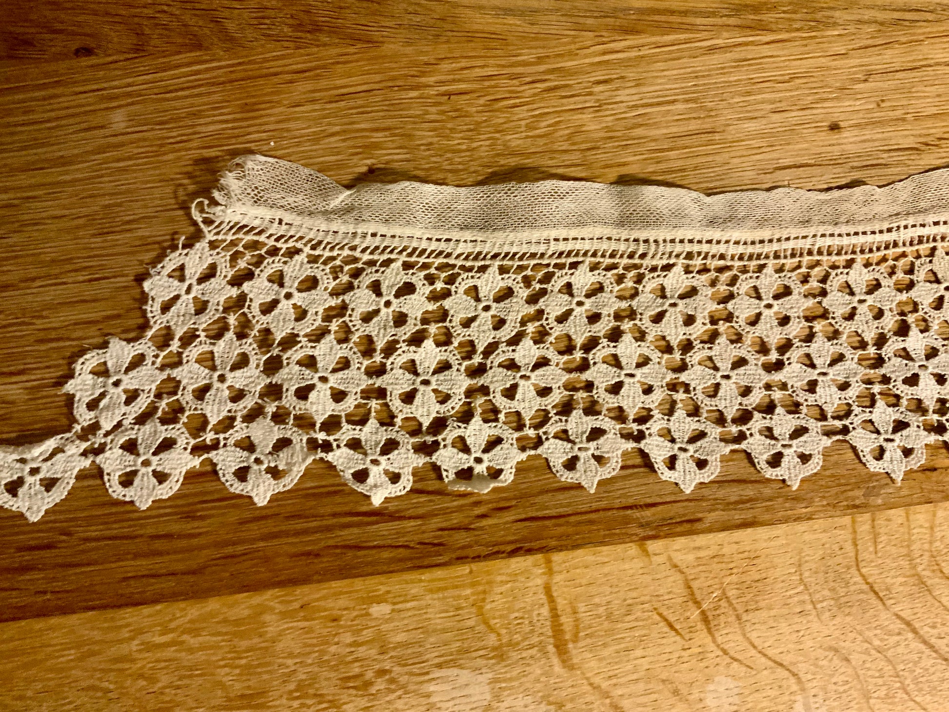 The lace shows the charm of age, with a soft structure and a slightly irregular handmade feel that speaks to its early construction.