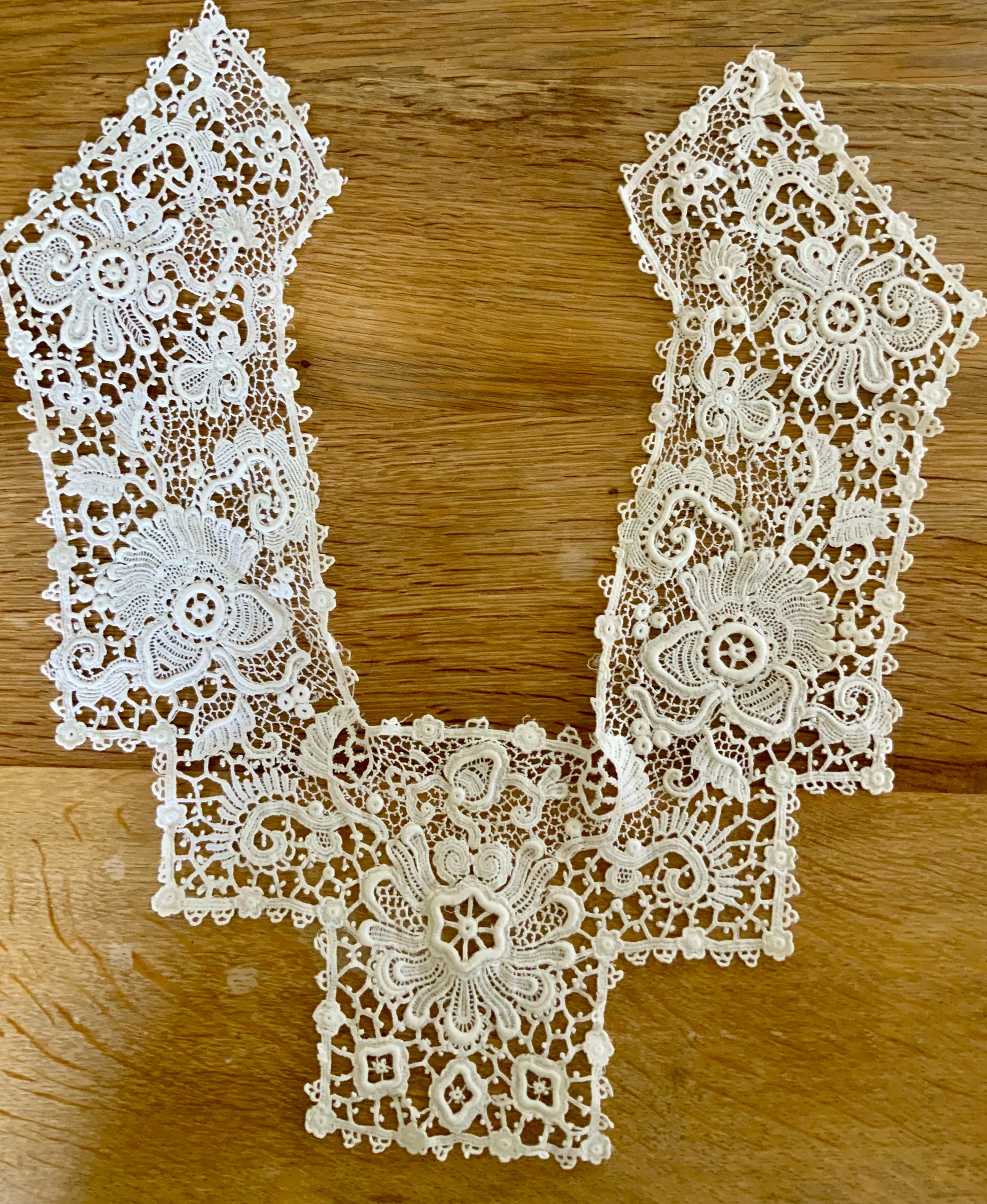 An exceptional antique lace collar featuring bold floral motifs and an intricate openwork ground, reminiscent of guipure and Irish crochet lace traditions.