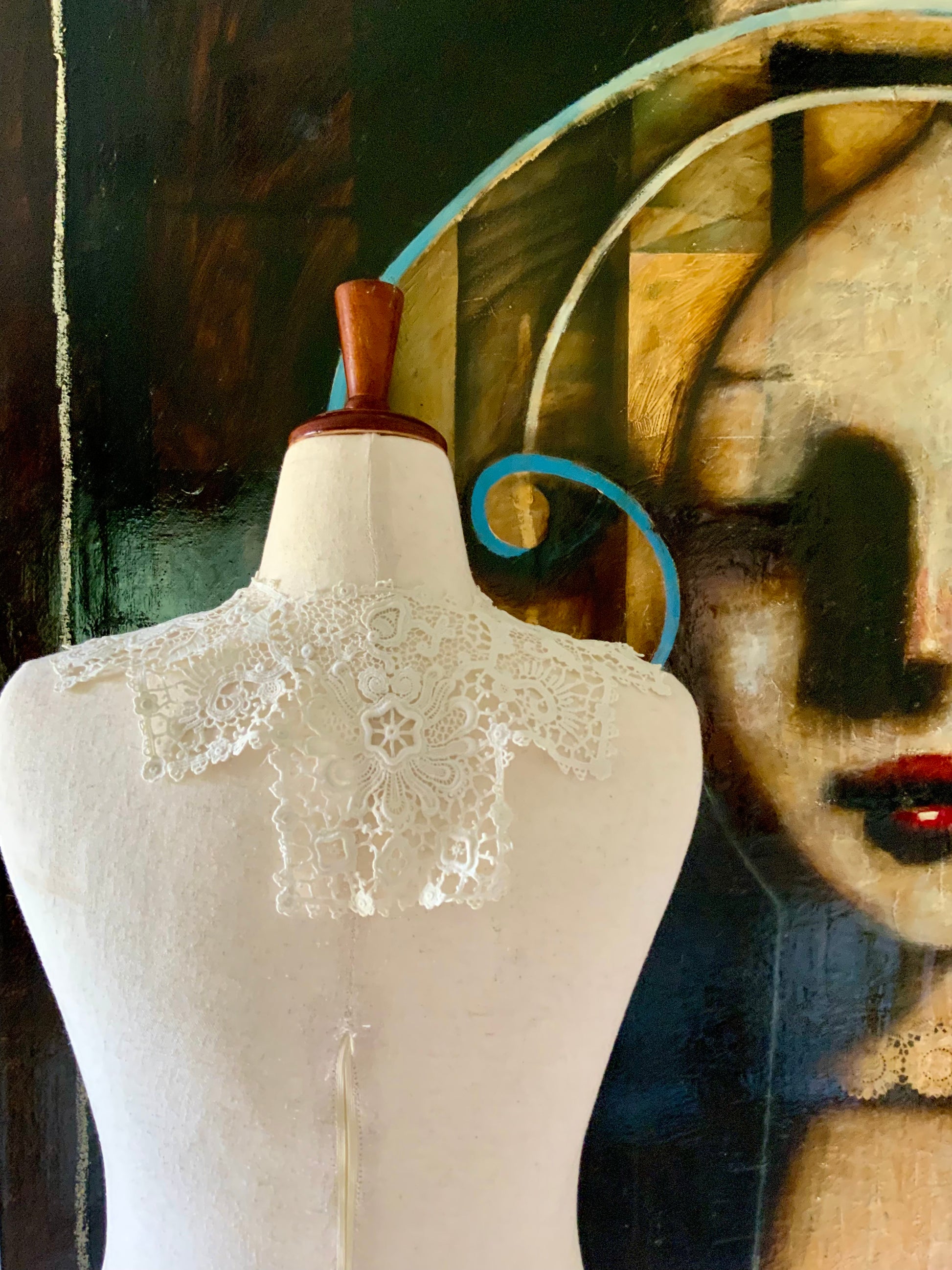 Unlike more delicate collars, this piece carries a stronger visual impact, making it ideal as a statement layer over both antique and modern garments. It transforms even the simplest silhouette into something distinctive and refined.