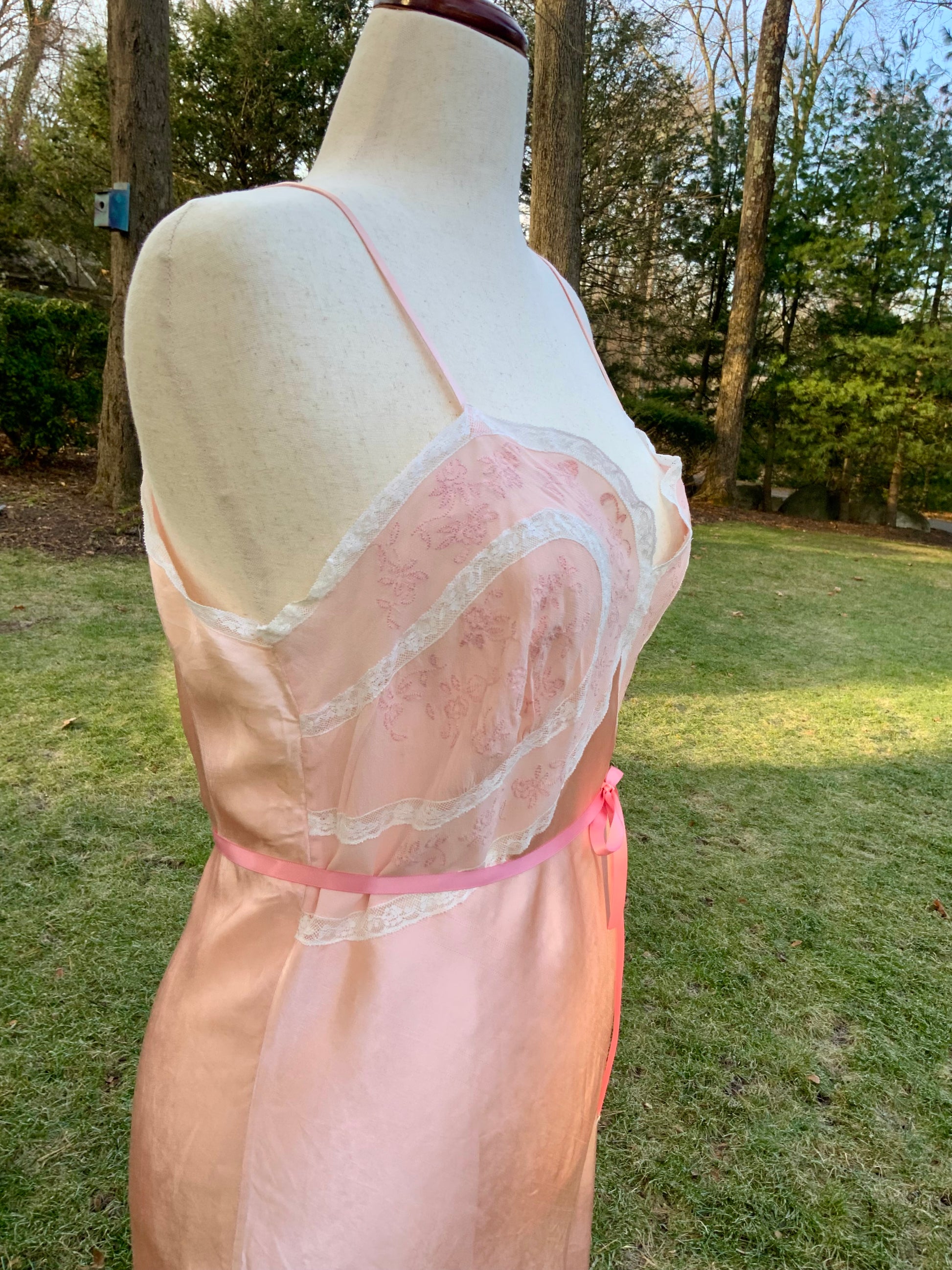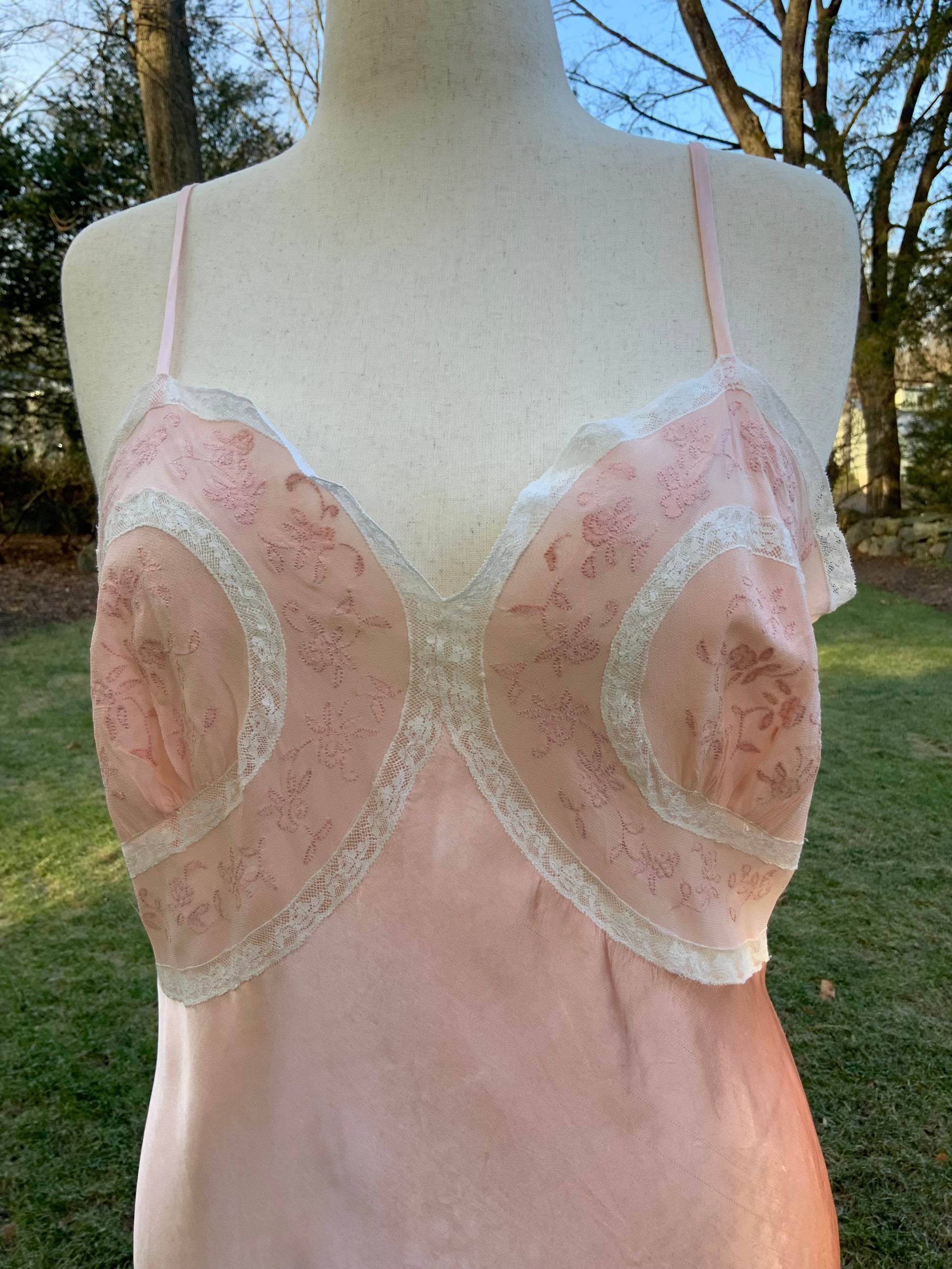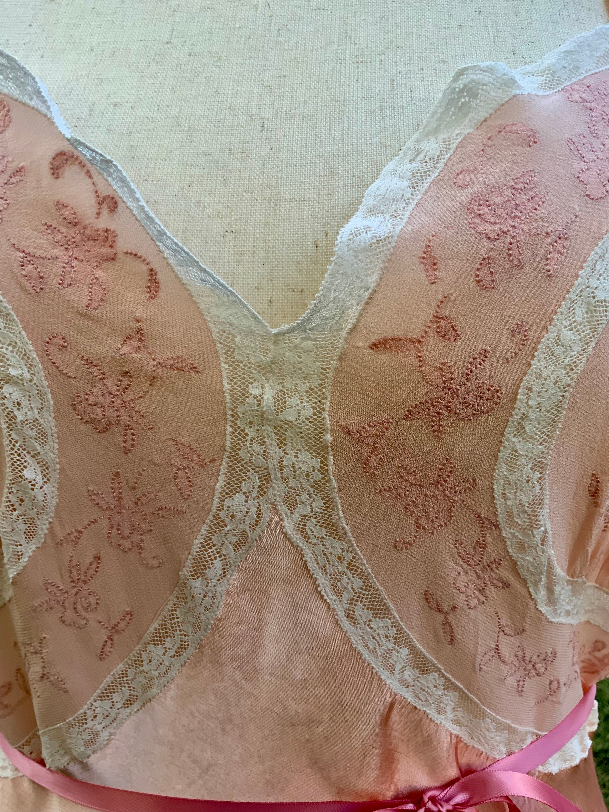 1930s Blush Satin & Chiffon Slip Dress – Floral Embroidery & Lace Panels - 30BA