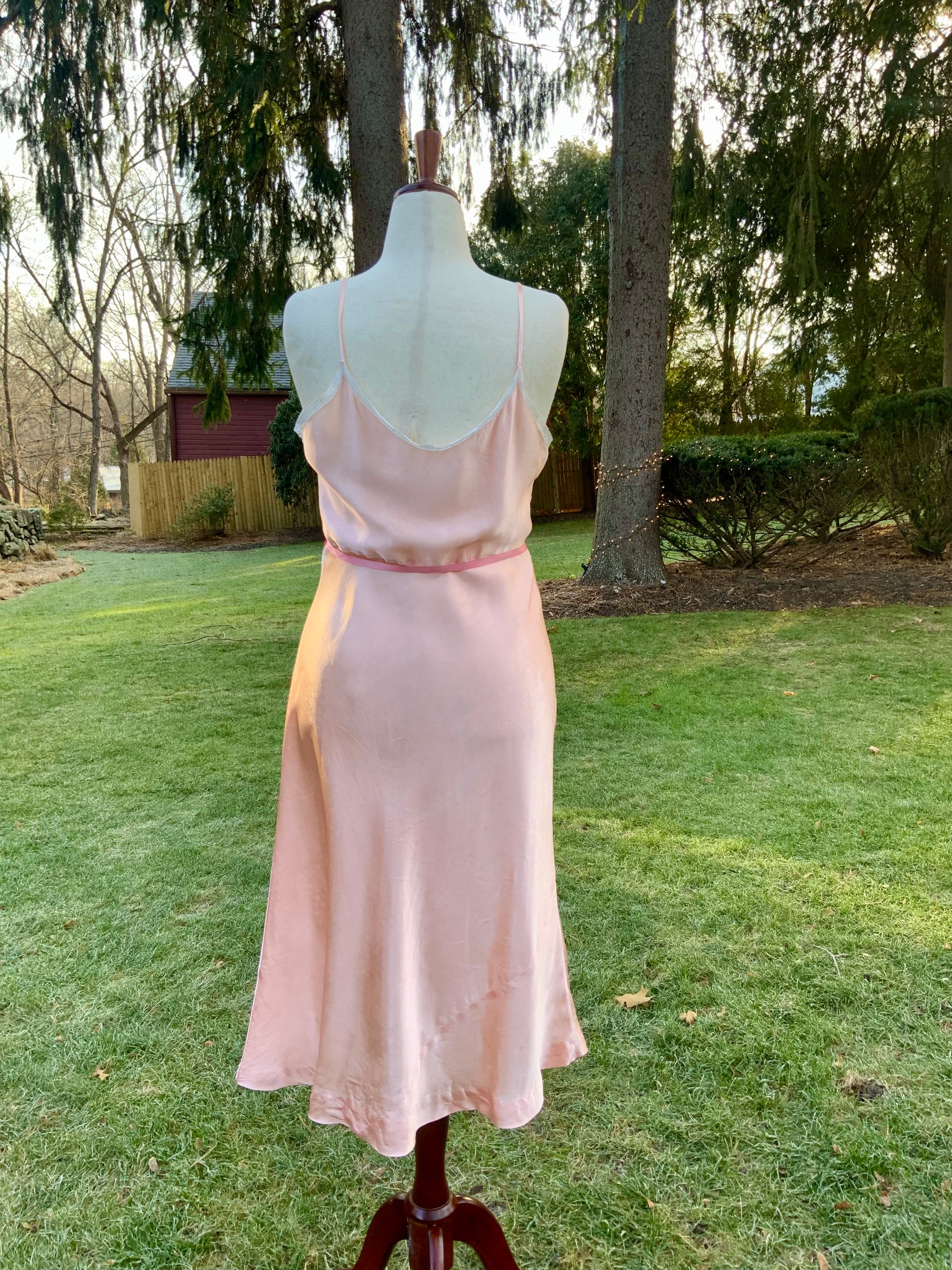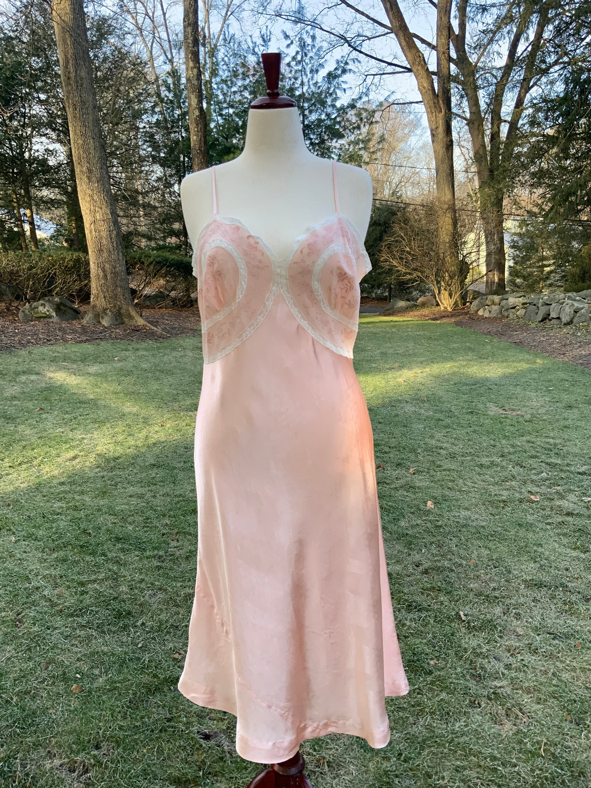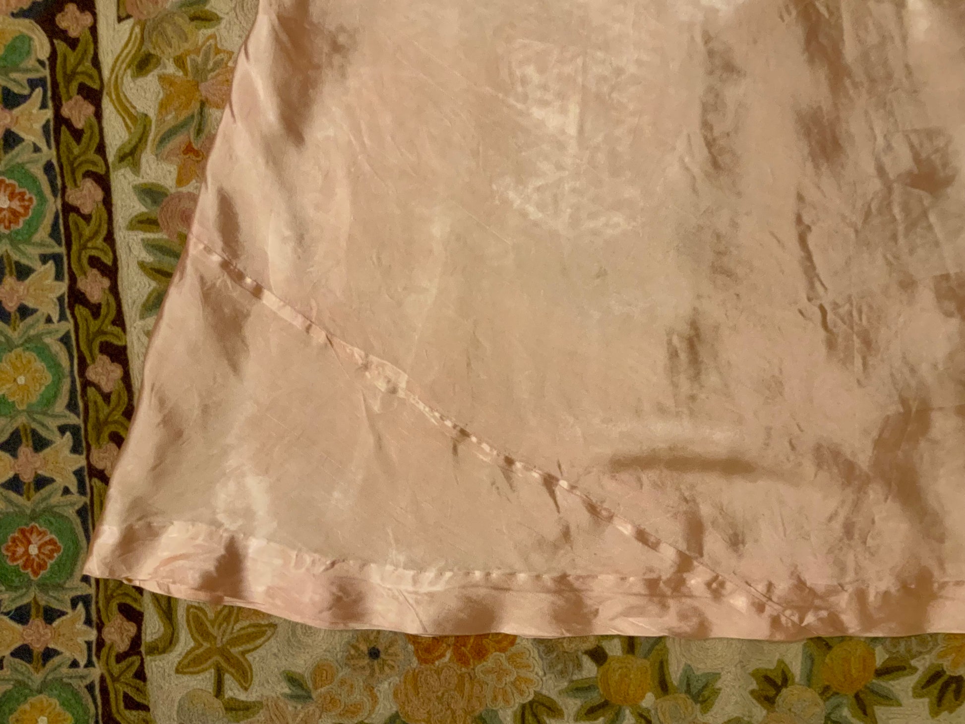 This exquisite blush silk slip is a rare Art Deco treasure, crafted in the early 1930s in a soft satin cut on the bias for that signature fluid drape.