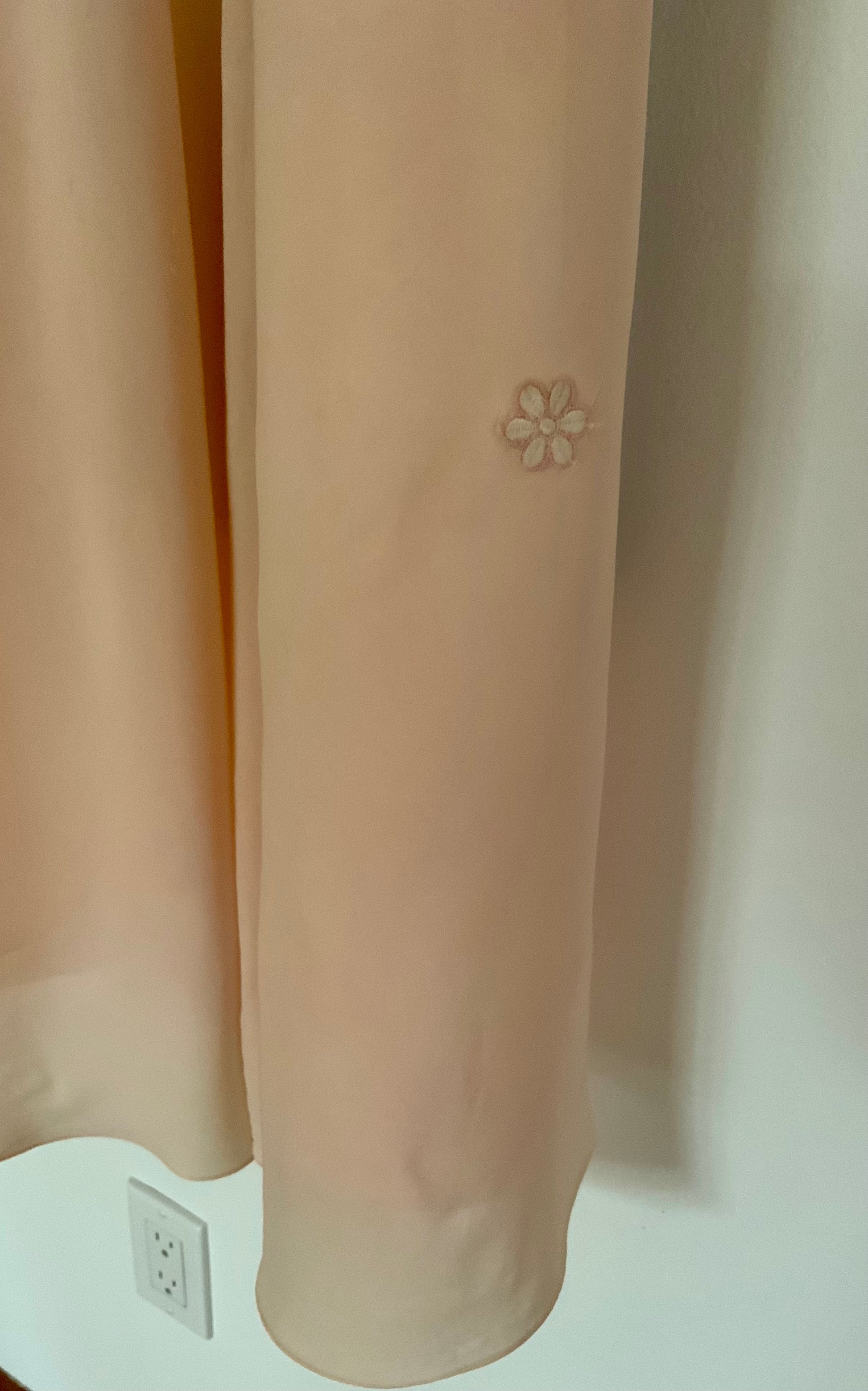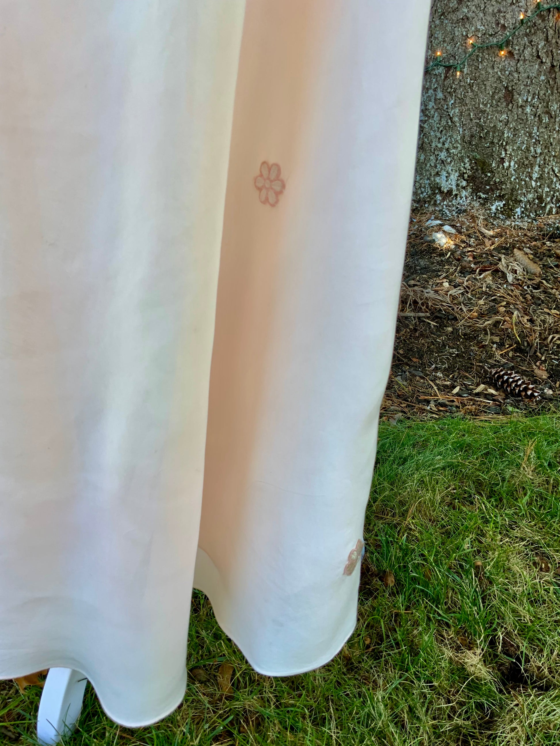Restored with subtle vintage floral appliqués near the hem, preserving the beauty of the original piece while maintaining full wearability.