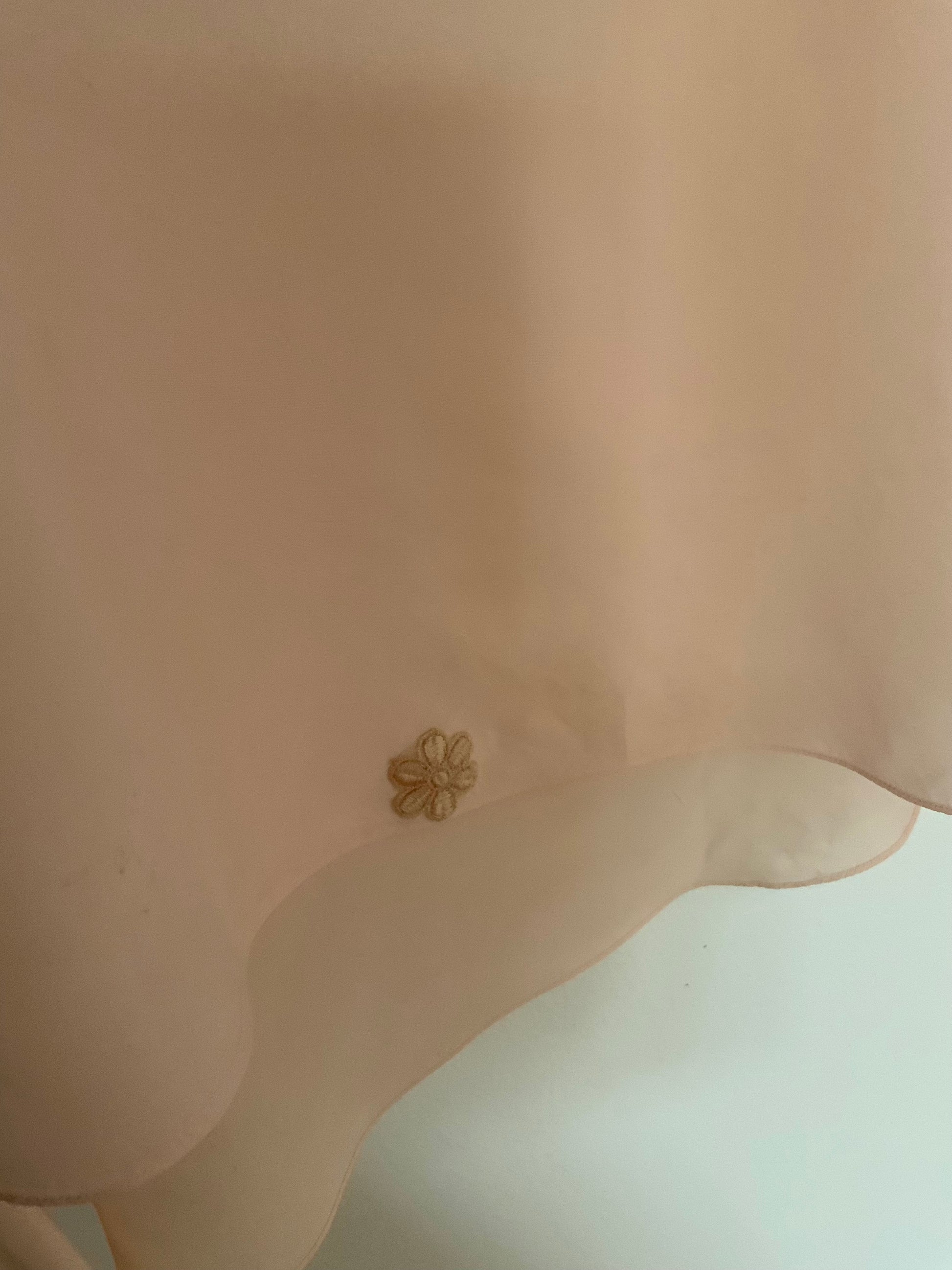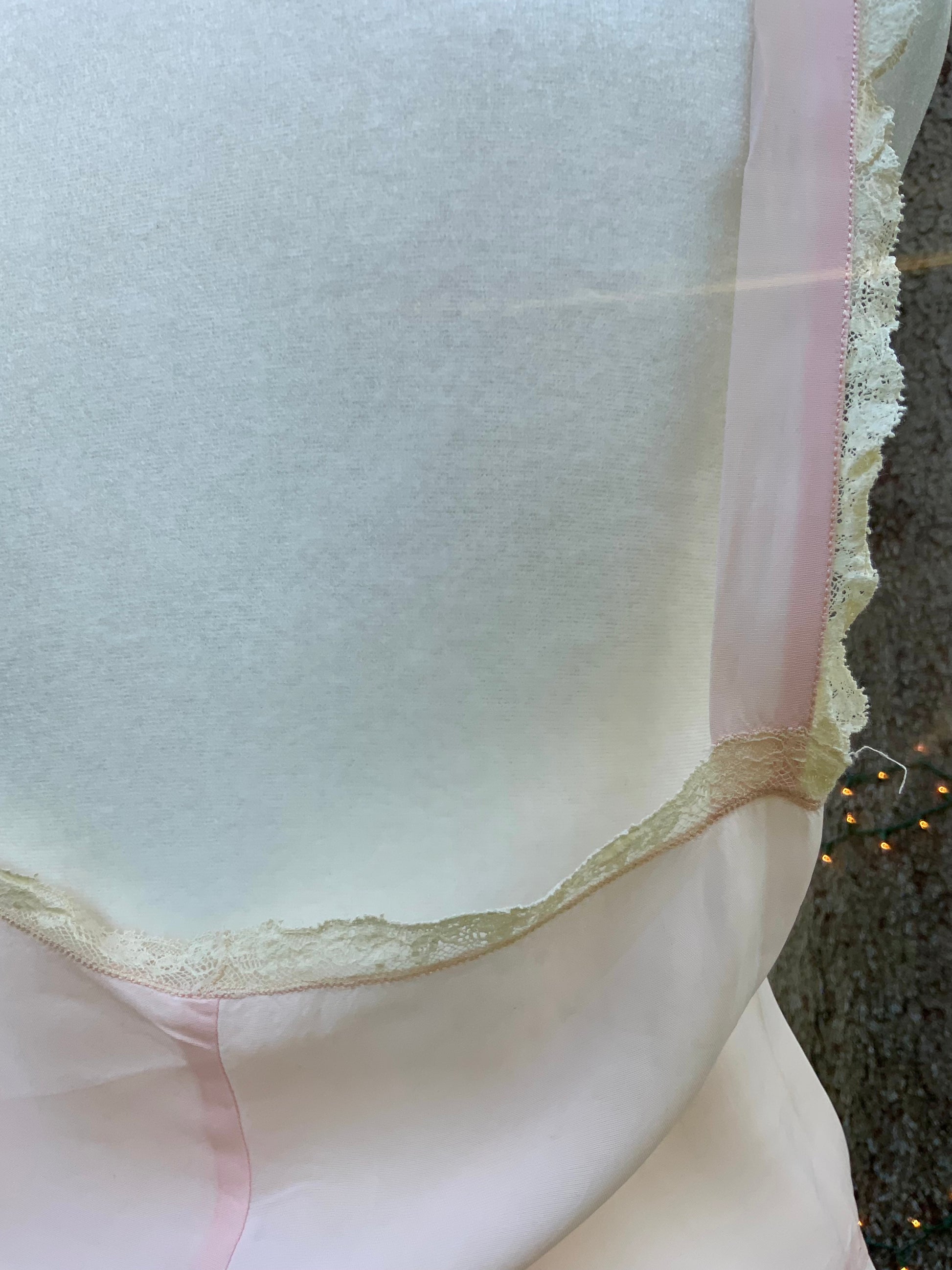 A breathtaking Art Deco nightgown from the early–mid 1930s, crafted in soft blush rayon with exquisite geometric panel work. The bodice features embroidered floral motifs framed by Deco diamond insets of plissé and pale buttercream lace. Cut on the bias for that iconic 1930s drape and movement.