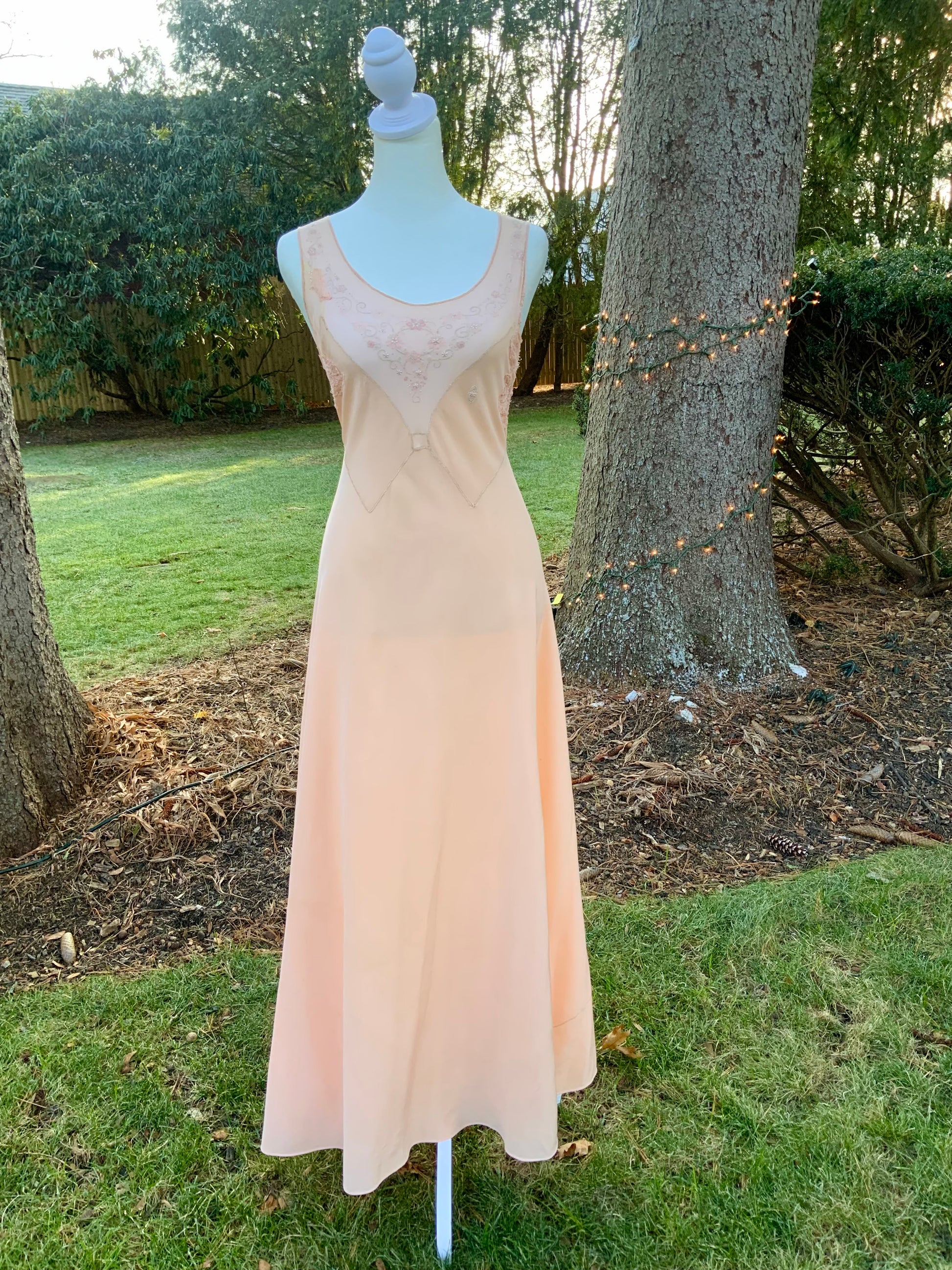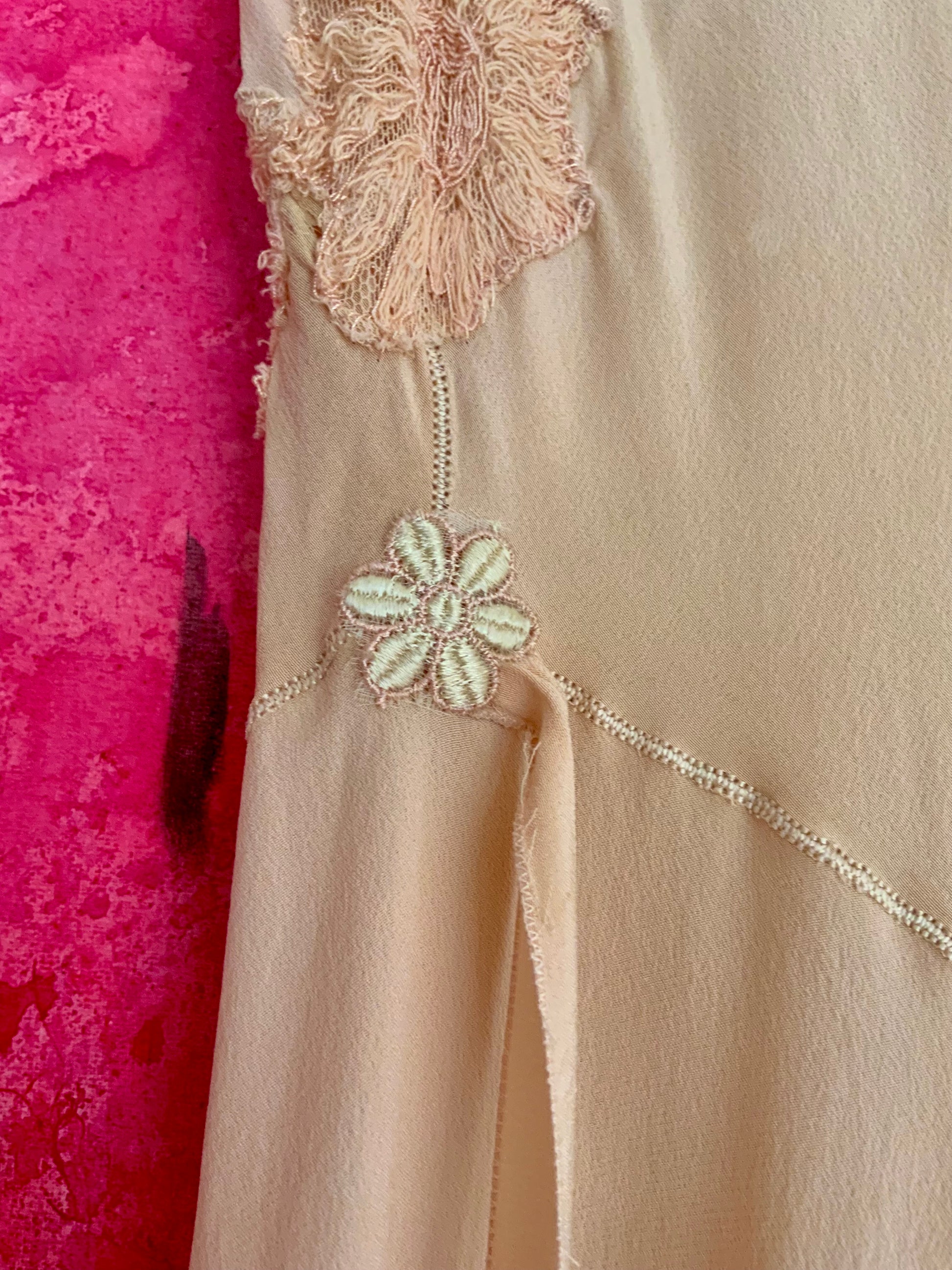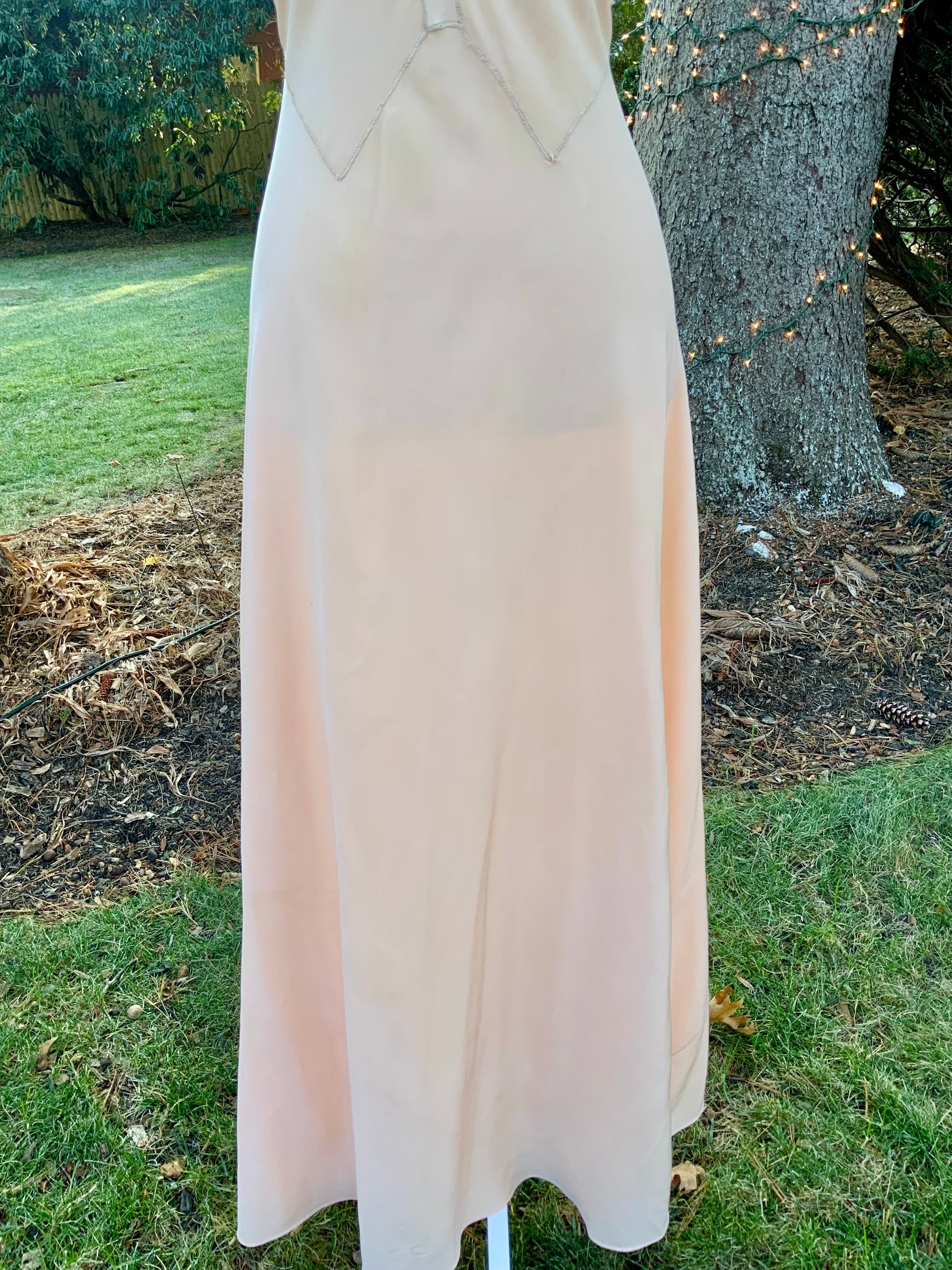 1930s Peach Rayon Nightgown with Art Deco Embroidery & Restored Lace Appliqués – Bias Cut Vintage Lingerie - 30AZ