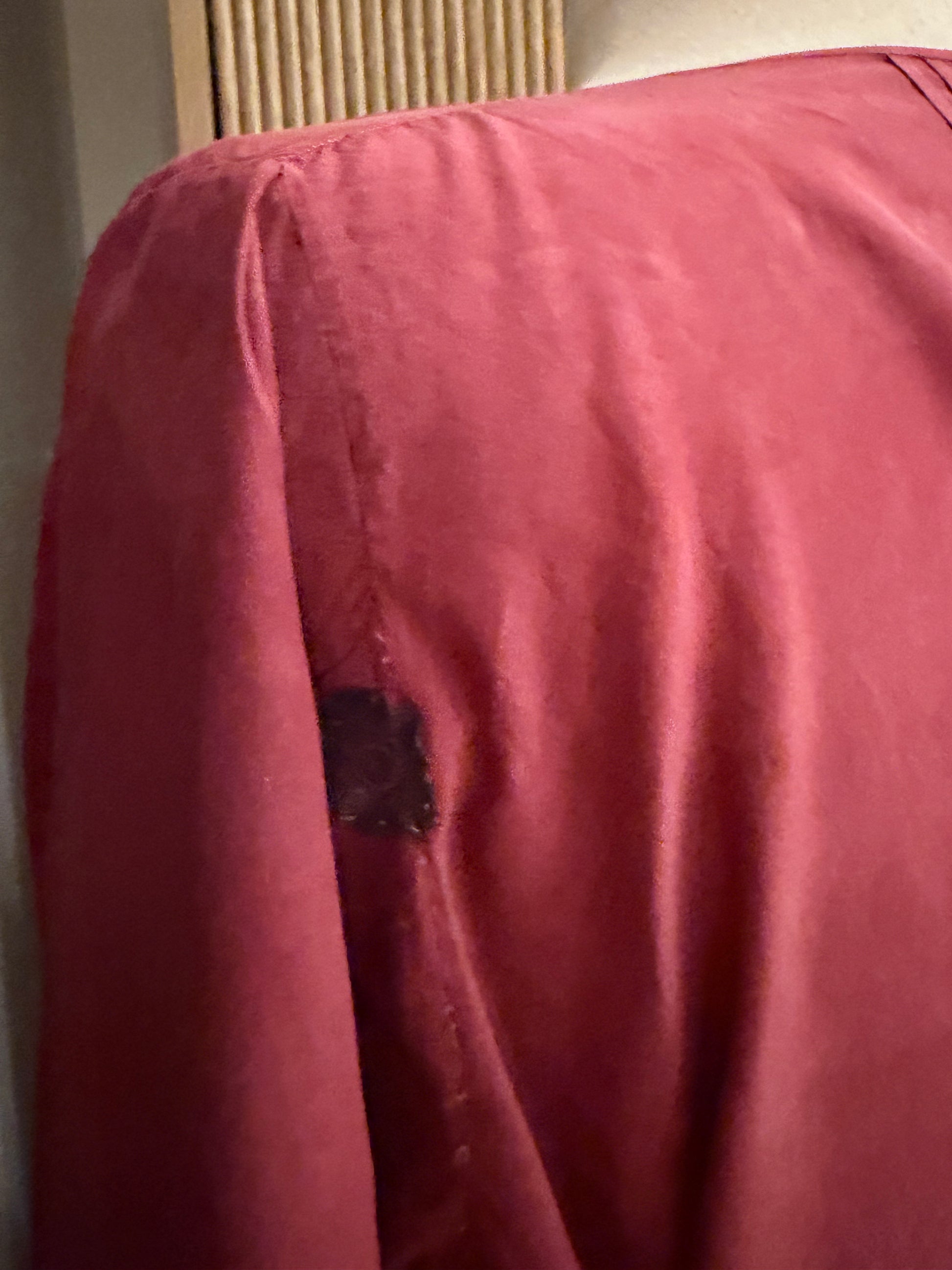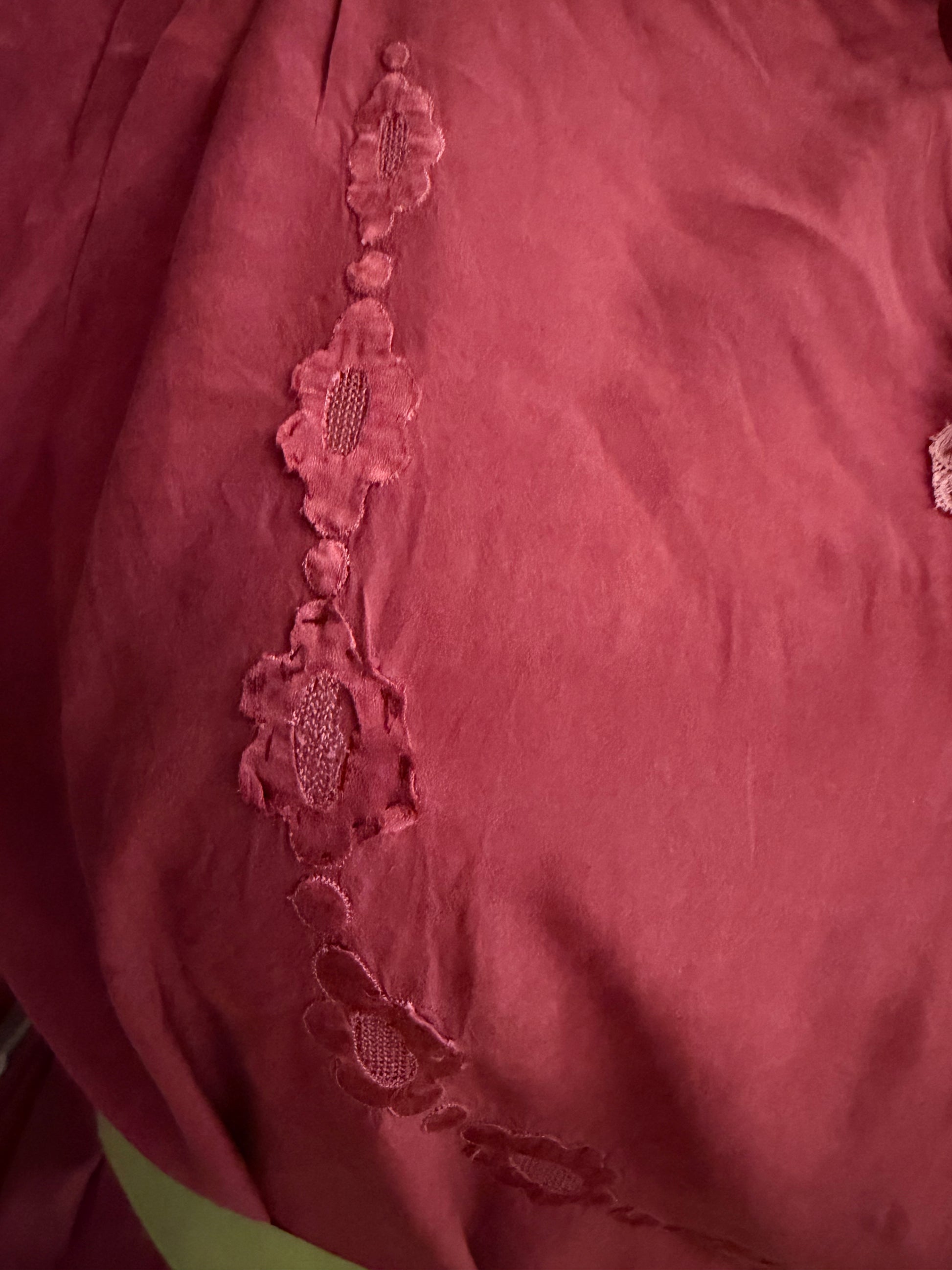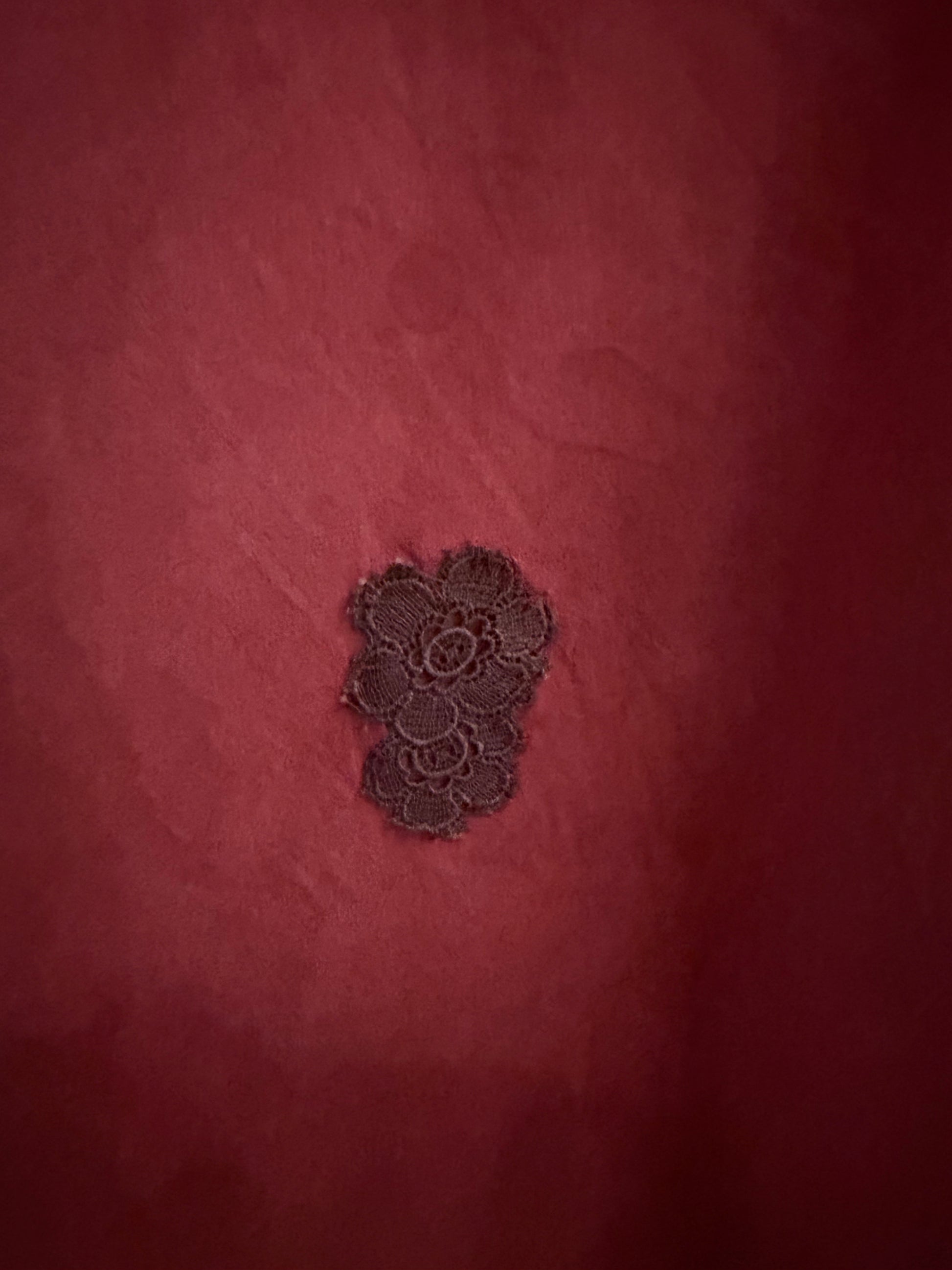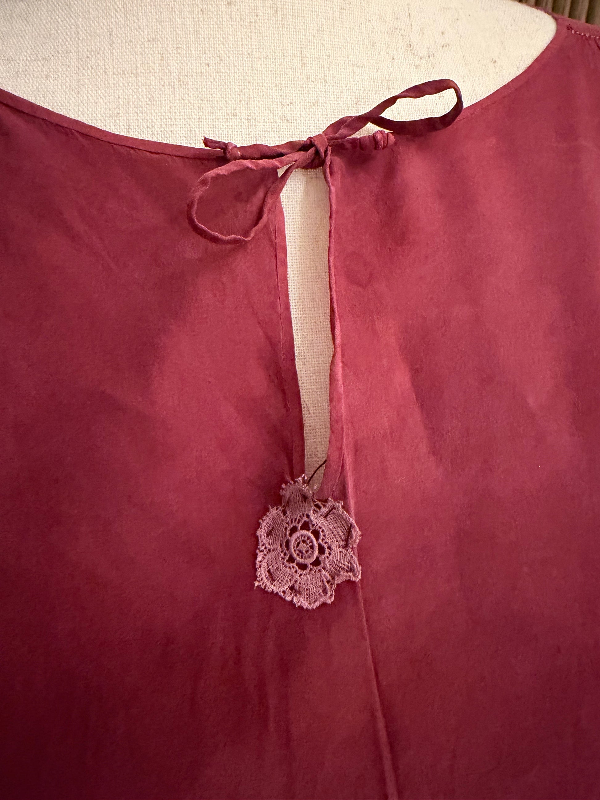 Originally ivory, this garment has been hand-dyed twice by me first on bordeaux and then using natural tea and coffee, creating a rich, nuanced antique rose / wine tone with soft tonal variations throughout. Each area absorbed the dye differently, resulting in a one-of-a-kind, painterly finish that enhances its vintage character and depth.