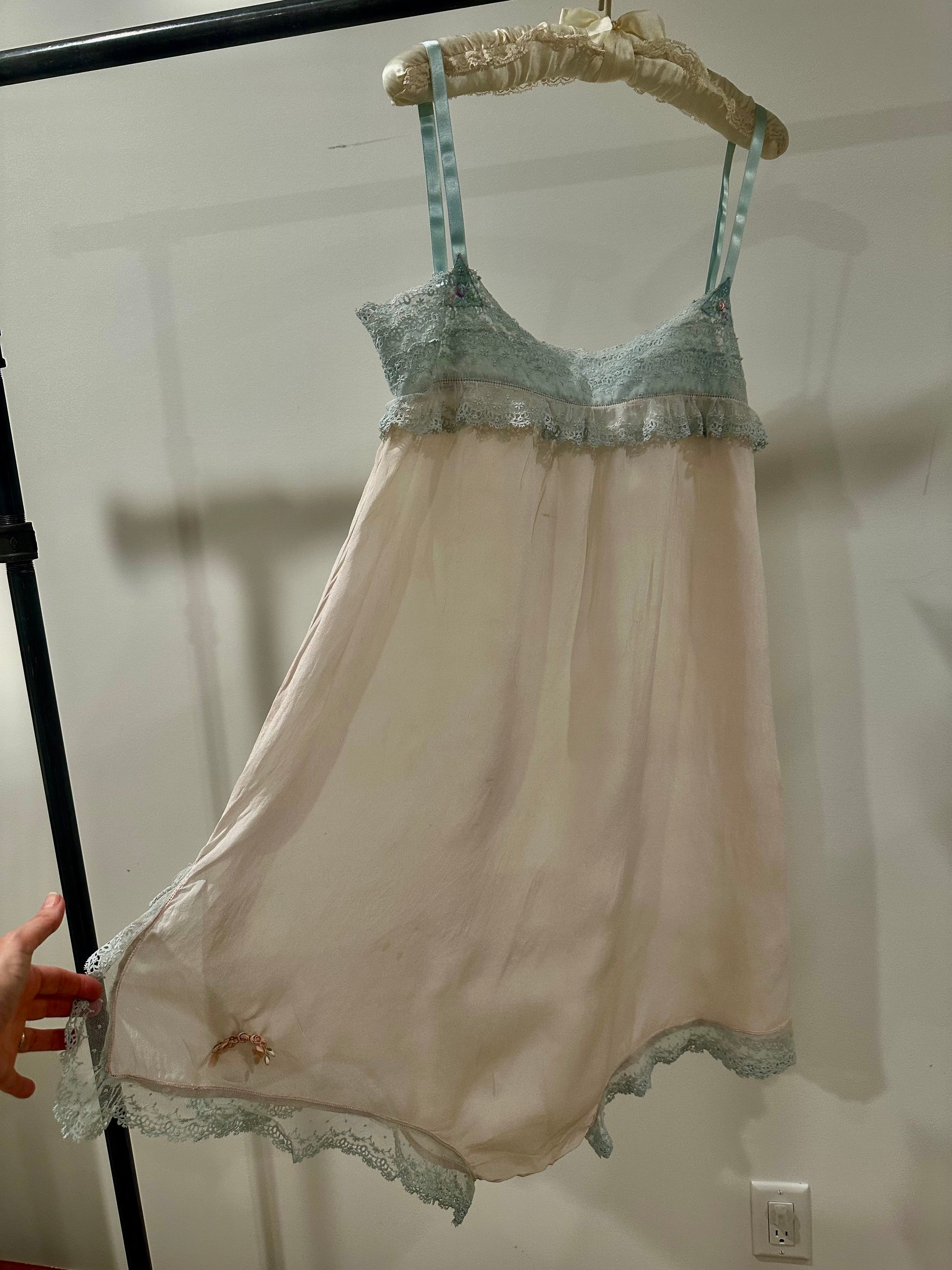 The silhouette is classic 1928–1934 lingerie: airy, lightly flared, and designed to float with the body. The blush silk paired with powder-blue lace makes this a magnificent “something blue” bridal piece, ideal for getting-ready photos, a honeymoon trousseau, or a romantic collection of heirloom lingerie.