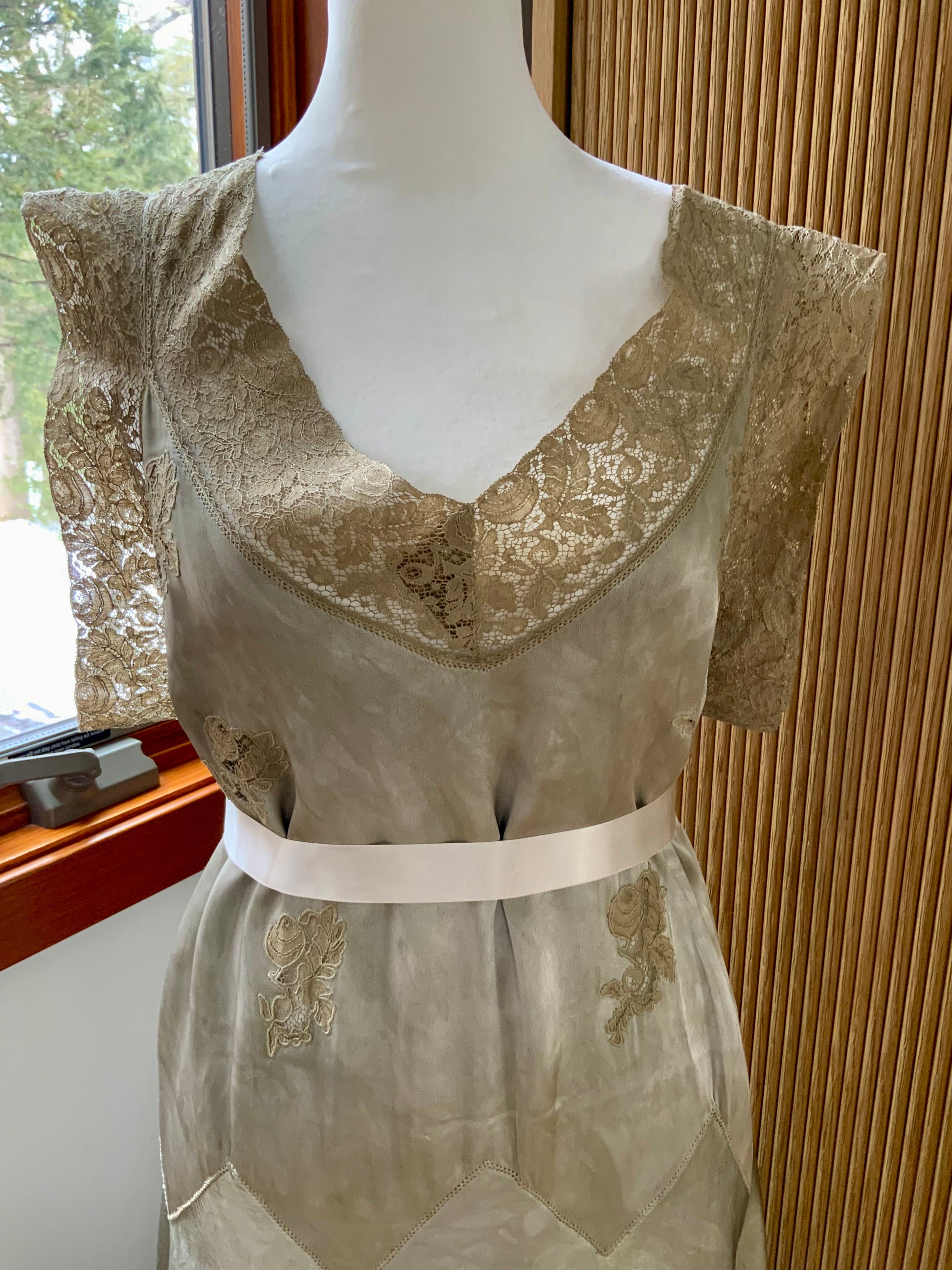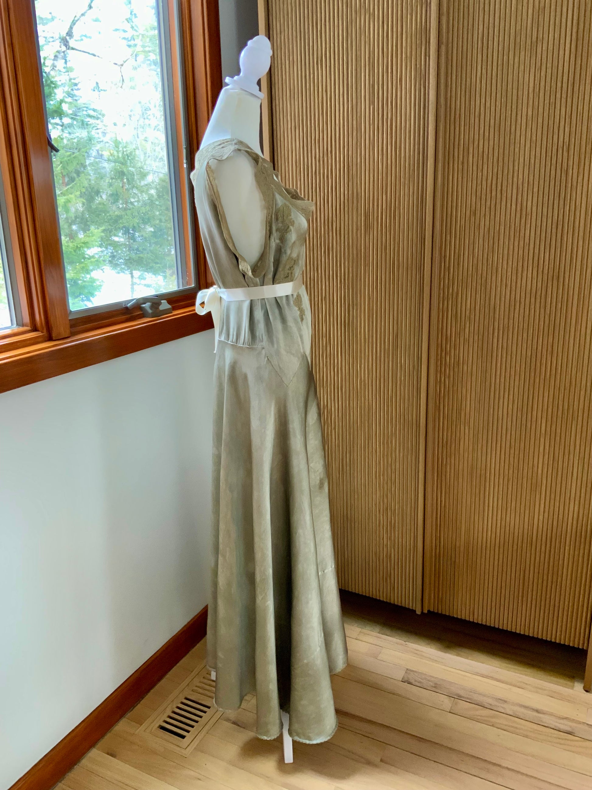 An extraordinary late 1920s to early 1930s silk satin gown, hand-dyed in a soft celadon sage tone and finished with delicate lace cap sleeves and embroidered appliqué