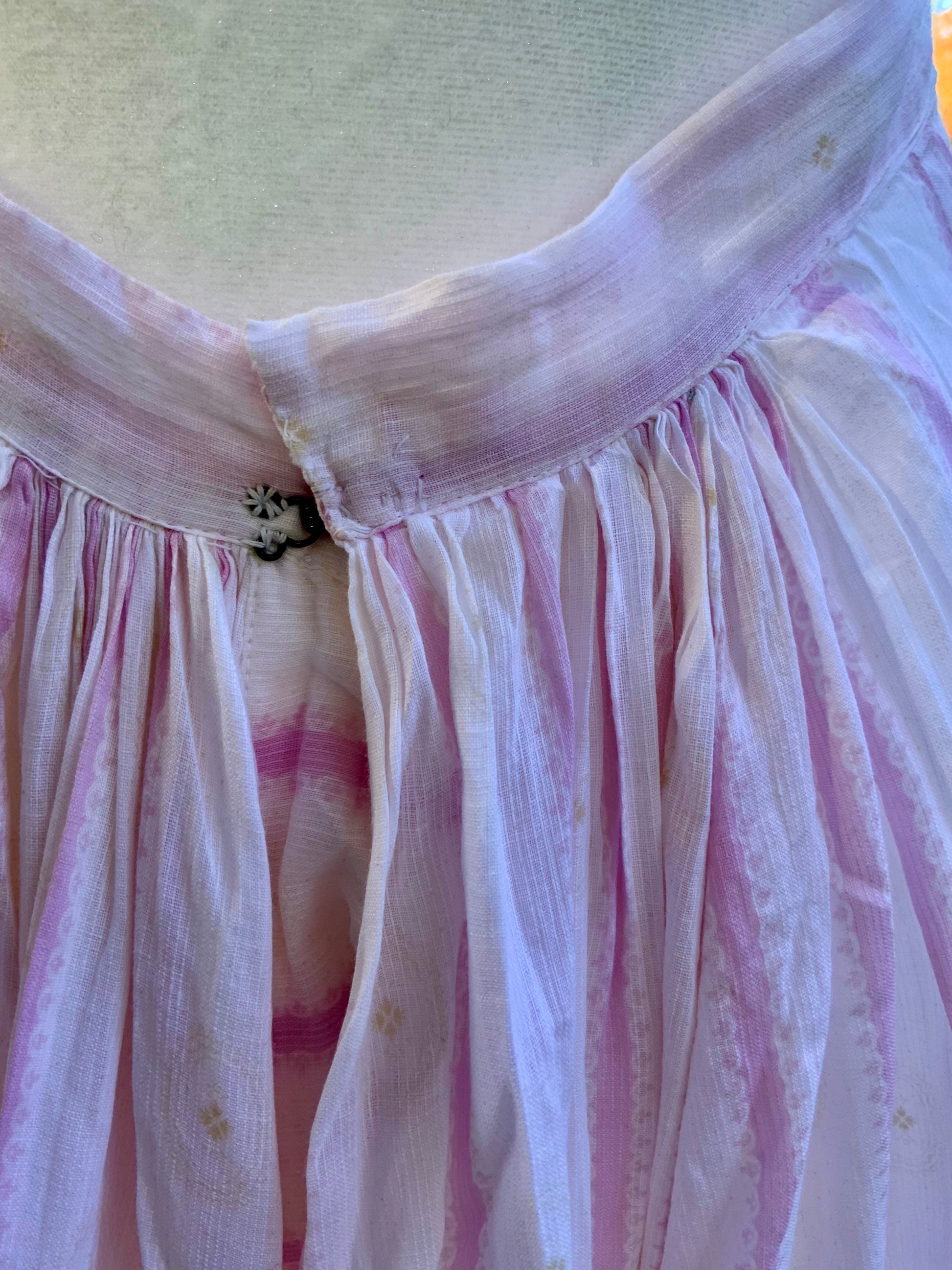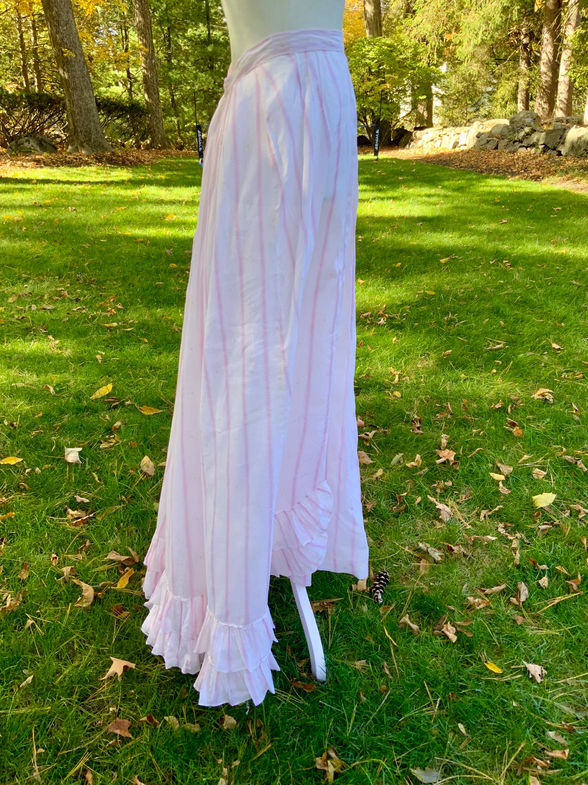 Made of fine cotton voile or lawn, light and soft to the touch, with woven pink stripes and tiny dotted designs throughout. The skirt flares gracefully toward the hem, finished with a double ruffle flounce that adds volume and movement. Originally worn as a decorative petticoat beneath sheer lawn or muslin dresses, this piece was meant to be seen — a symbol of subtle luxury and femininity at the turn of the century.