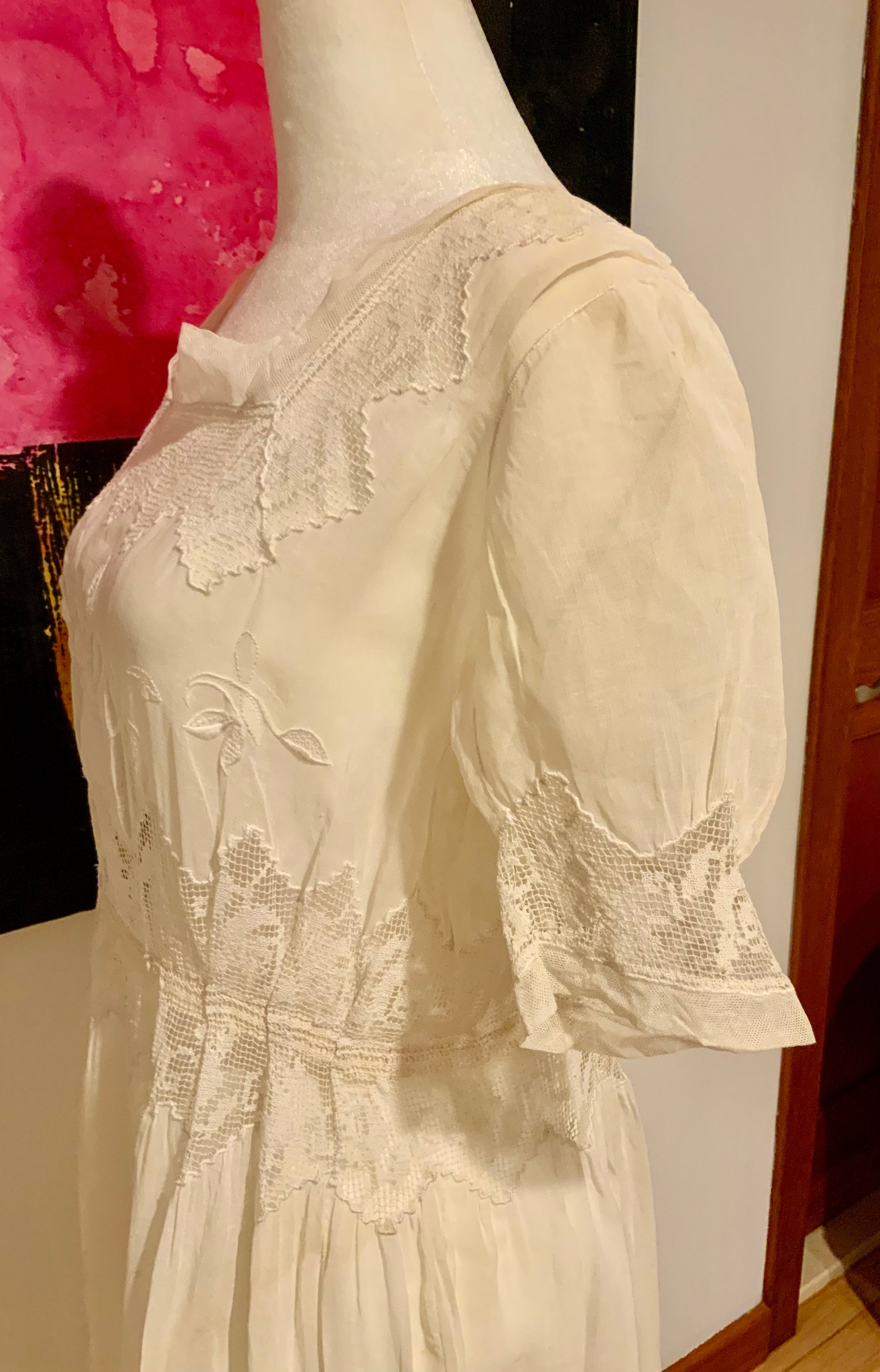 The square neckline and airy short sleeves capture the era’s feminine elegance — perfect for summer gatherings or garden teas of the early 1900s. A museum-quality piece that remains wearable today layered over a simple silk or nude slip.