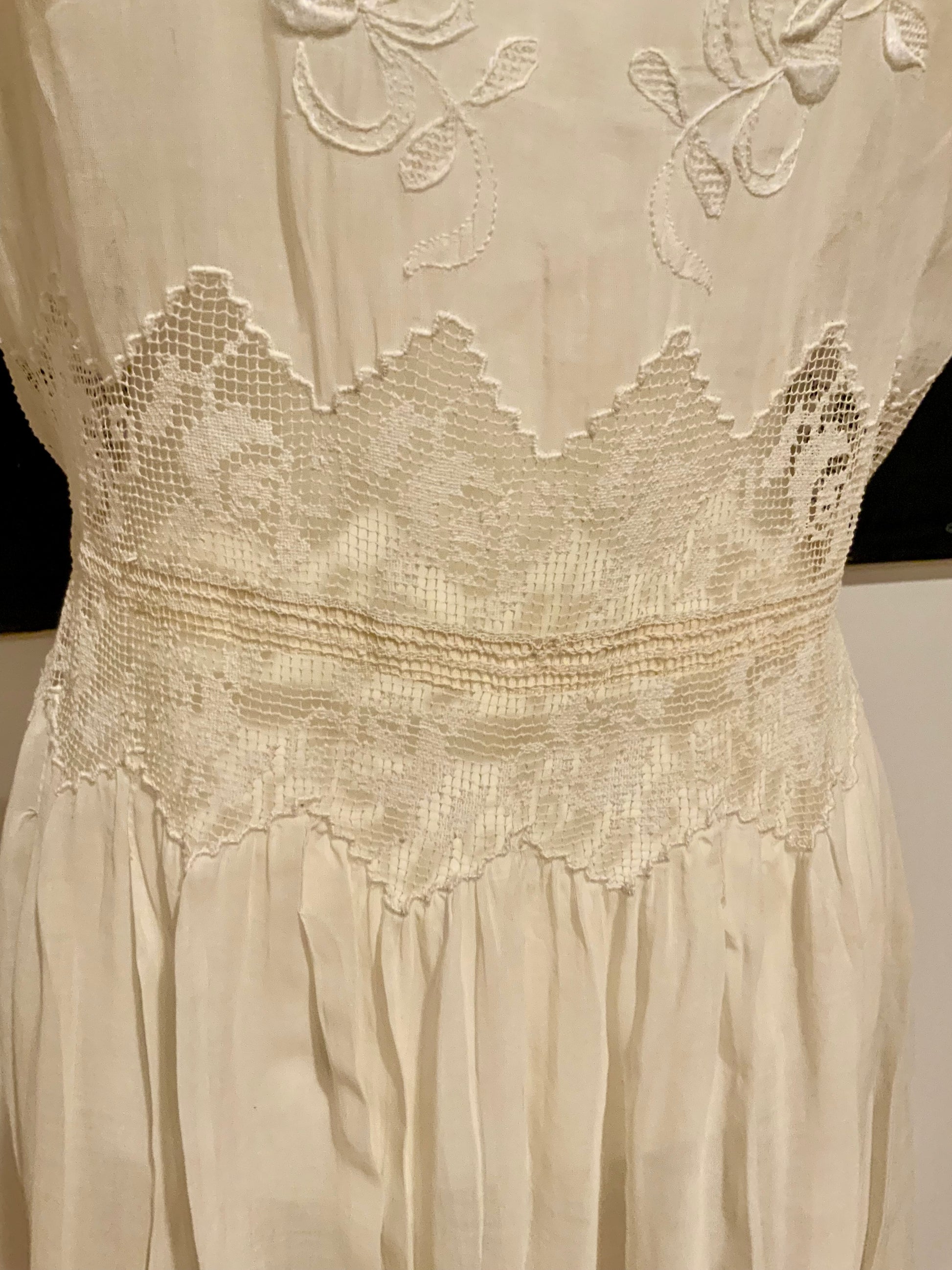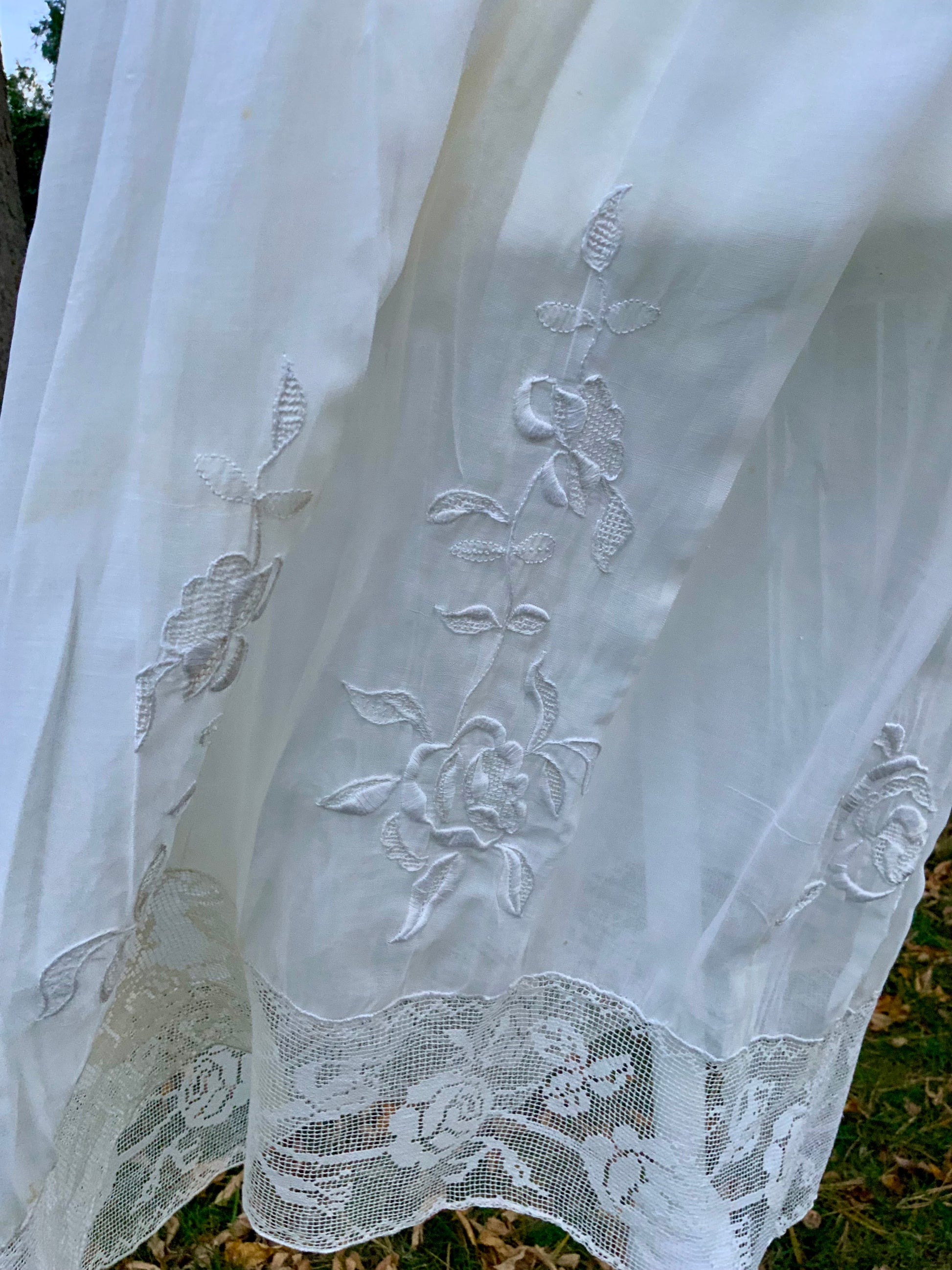 An extraordinary Edwardian tea or afternoon dress, crafted in the lightest cotton voile and adorned with handmade bobbin and filet laces. The bodice features exquisite floral whitework embroidery framed by geometric Valenciennes lace inserts, while the hem and sleeves are finished with romantic rose-patterned filet lace.