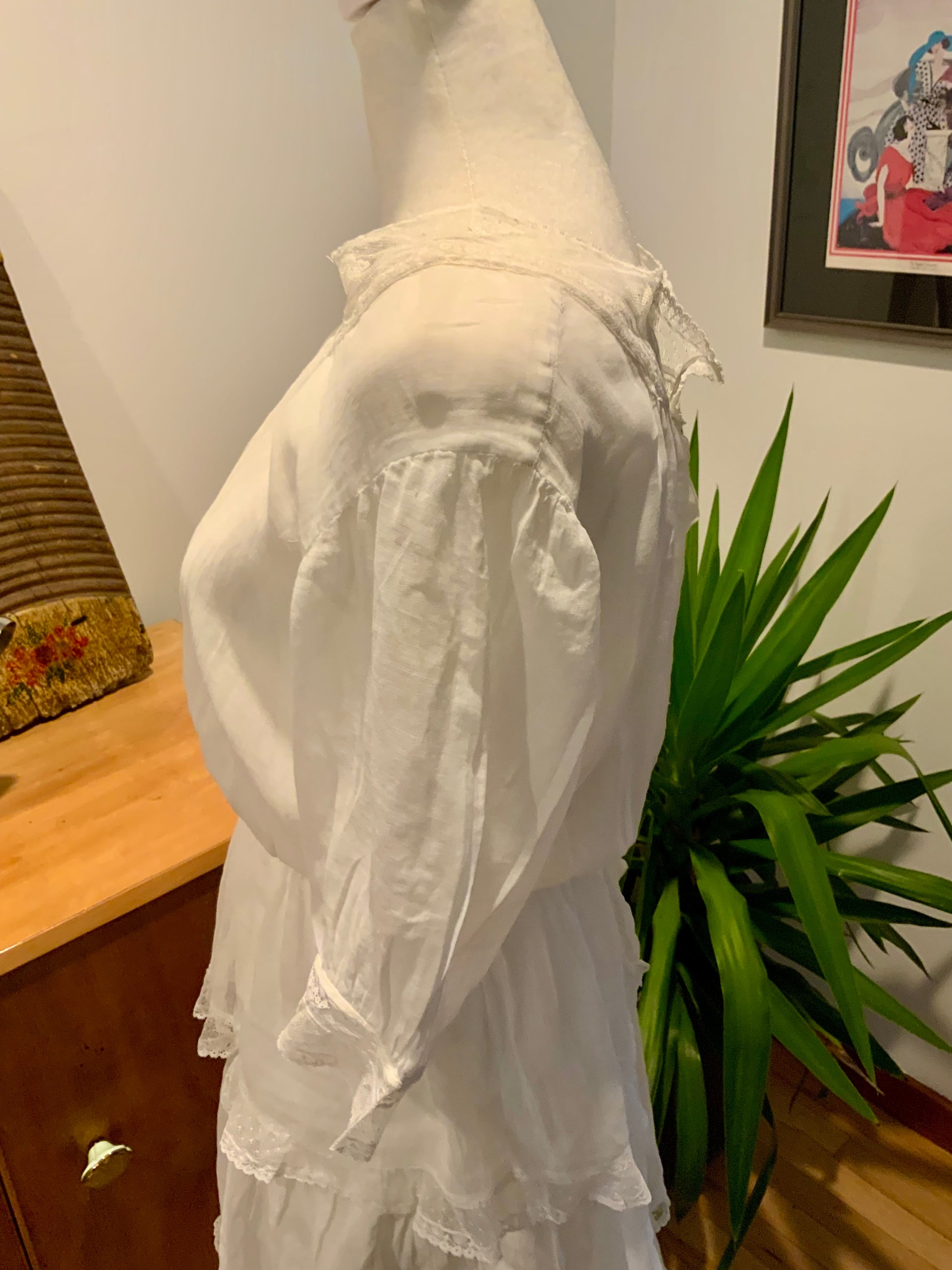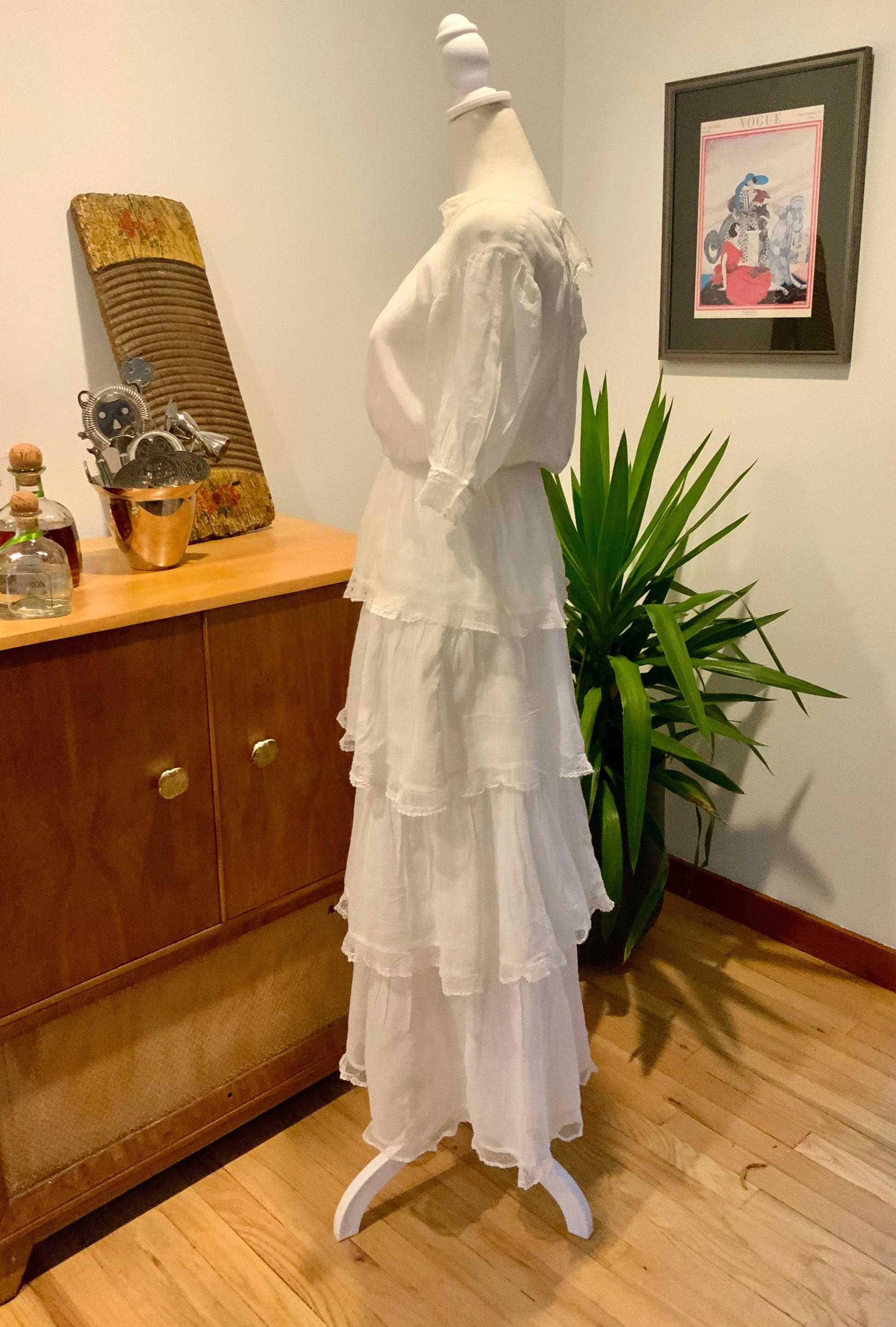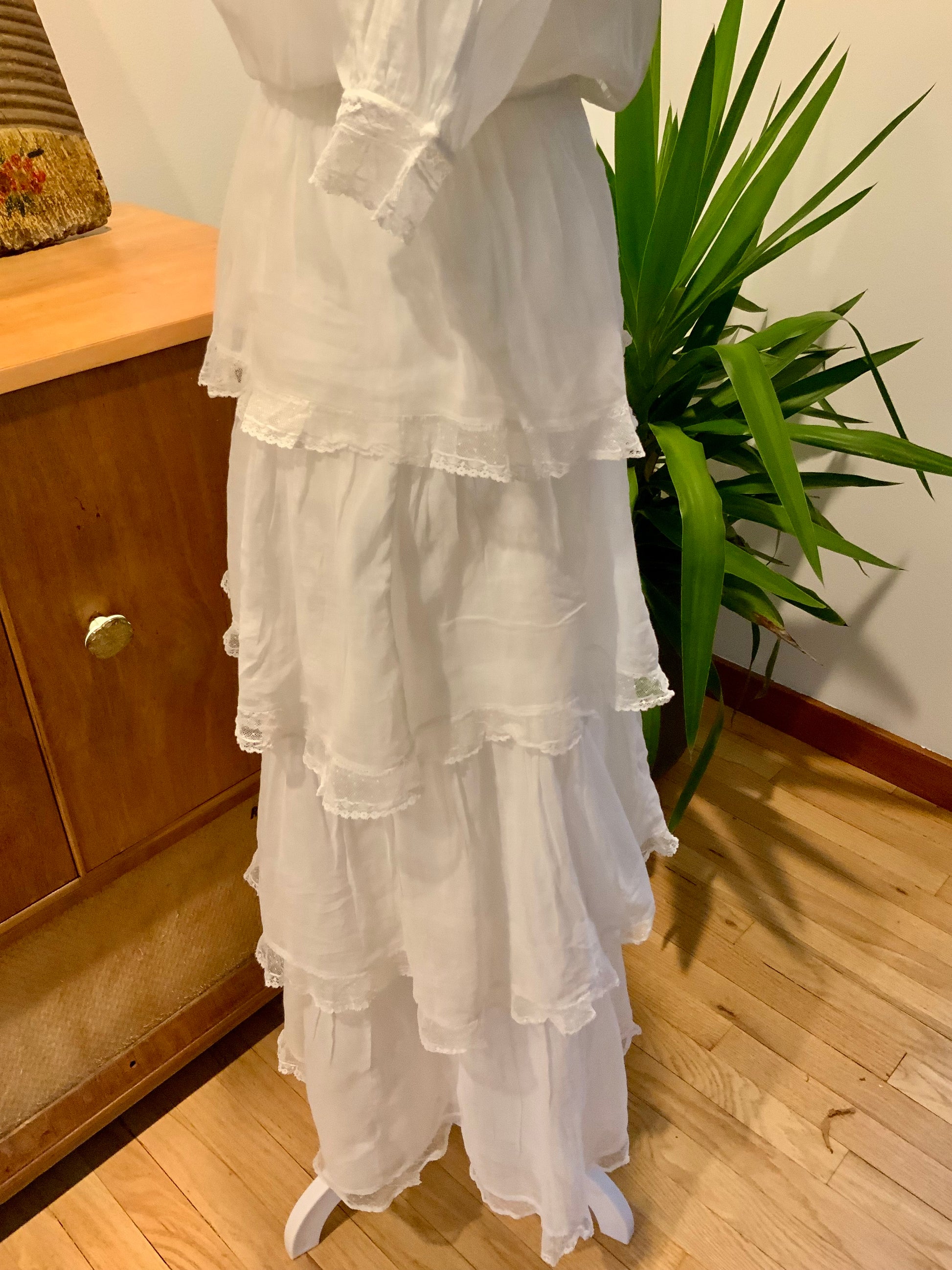 The design features five cascading skirt tiers edged in lace, a lace-trimmed high neckline, and half sleeves finished with inset lace cuffs. The waist gathers softly for shape, giving the dress its signature ethereal drape. Entirely hand-sewn and finished, with small back buttons and delicate pintucks at the shoulders, this is a rare example of wearable Edwardian craftsmanship.