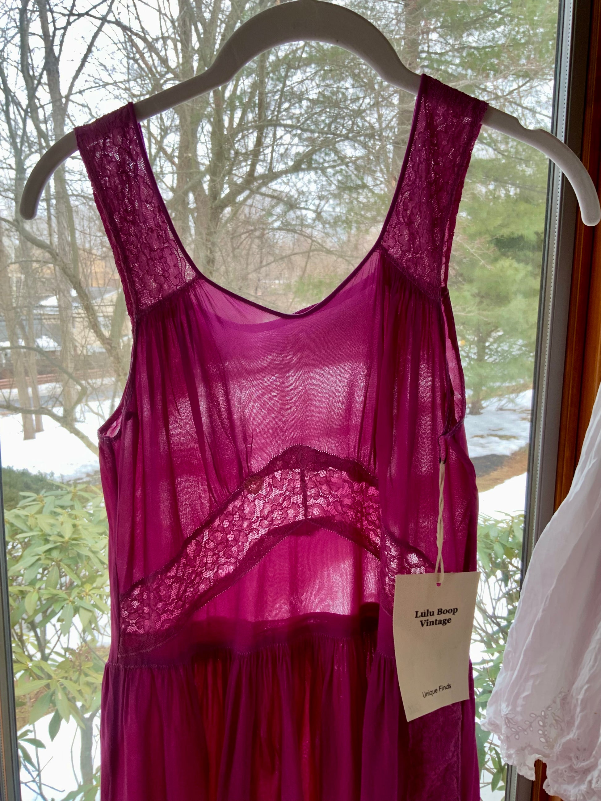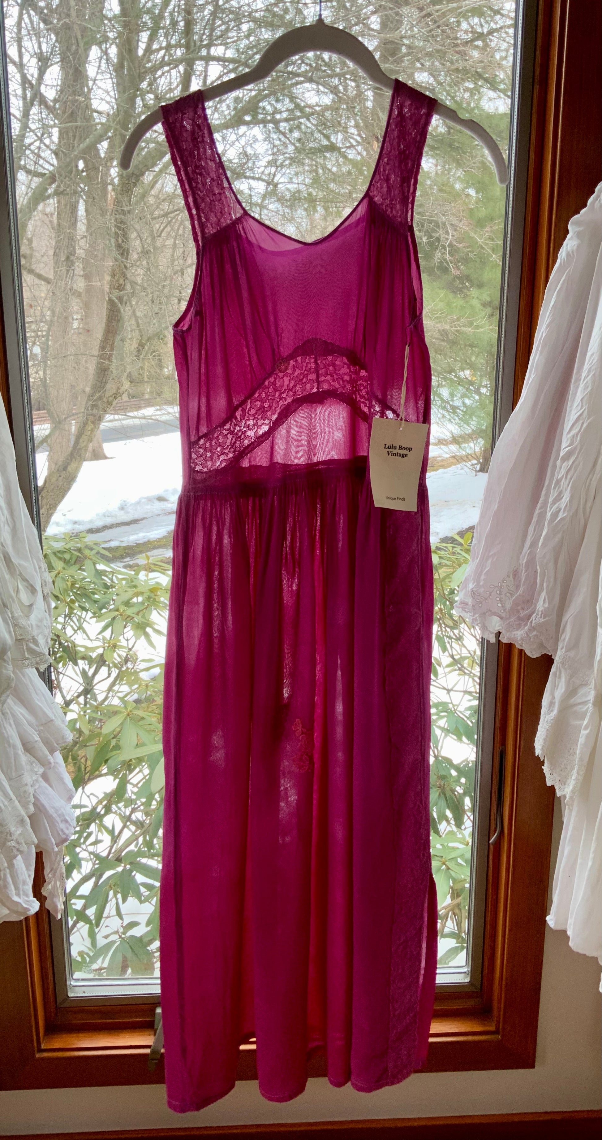 The gown has been carefully transformed by Lulu Boop Vintage through a second hand-dye process, resulting in its current rich fuchsia