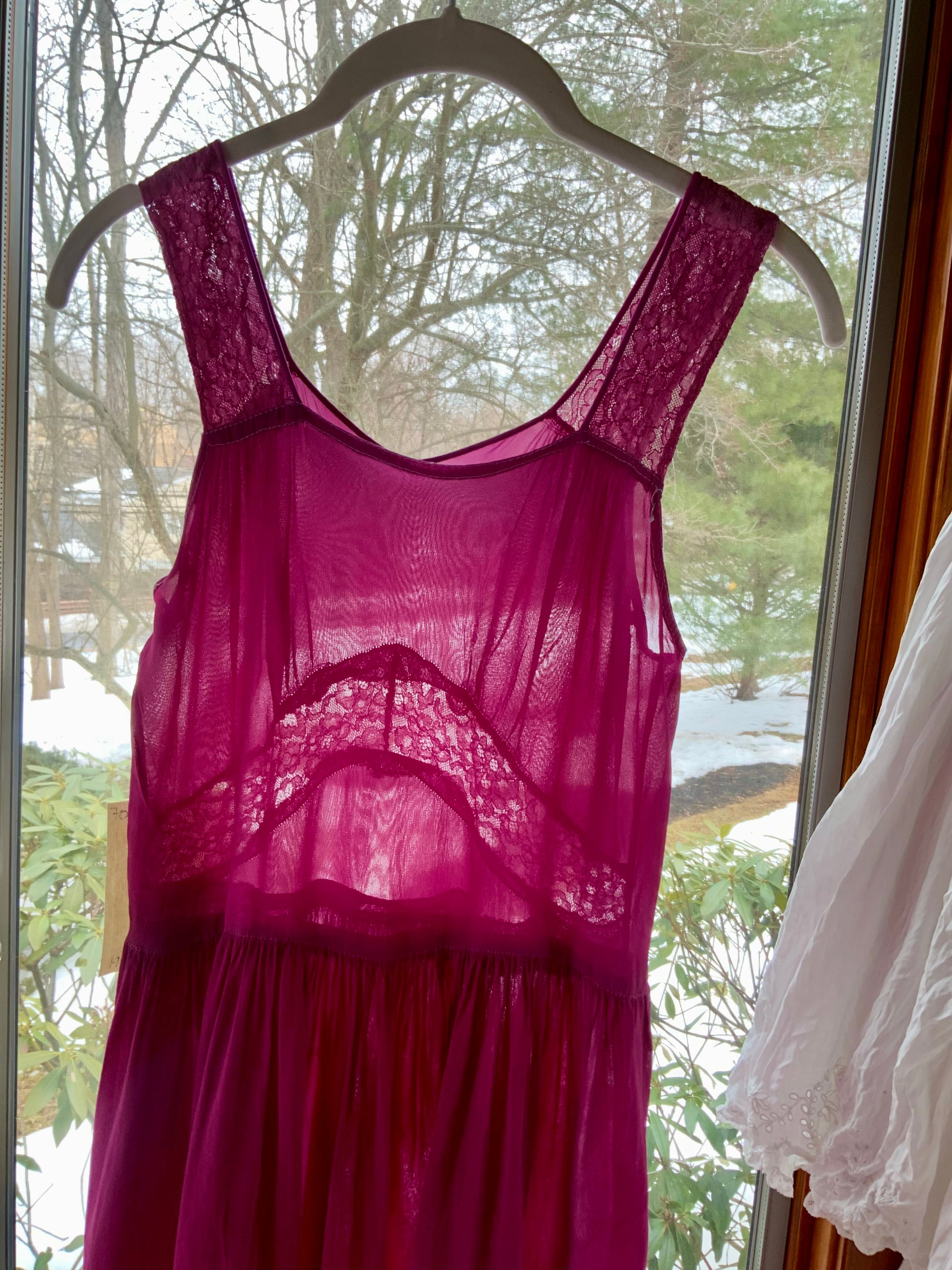 Vintage 1970s Sheer Chiffon Boudoir Gown Hand Dyed Fuchsia Lace Empire Waist XS Lingerie Dress - 70D