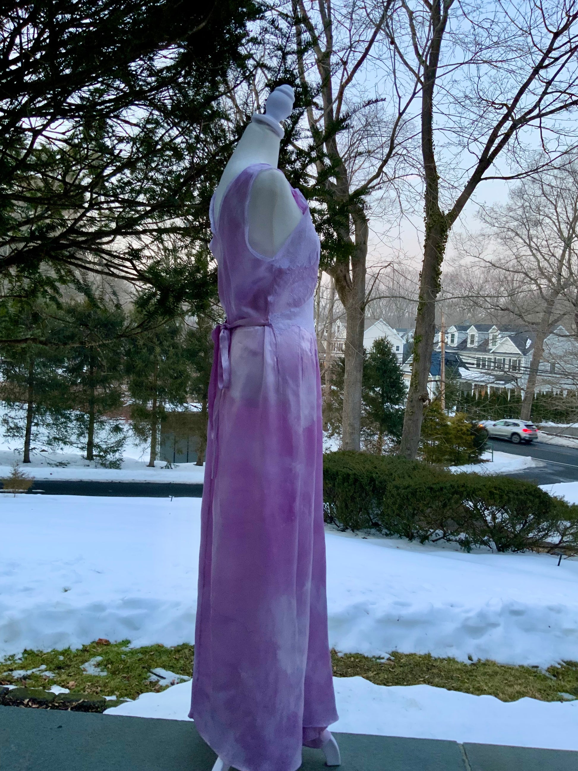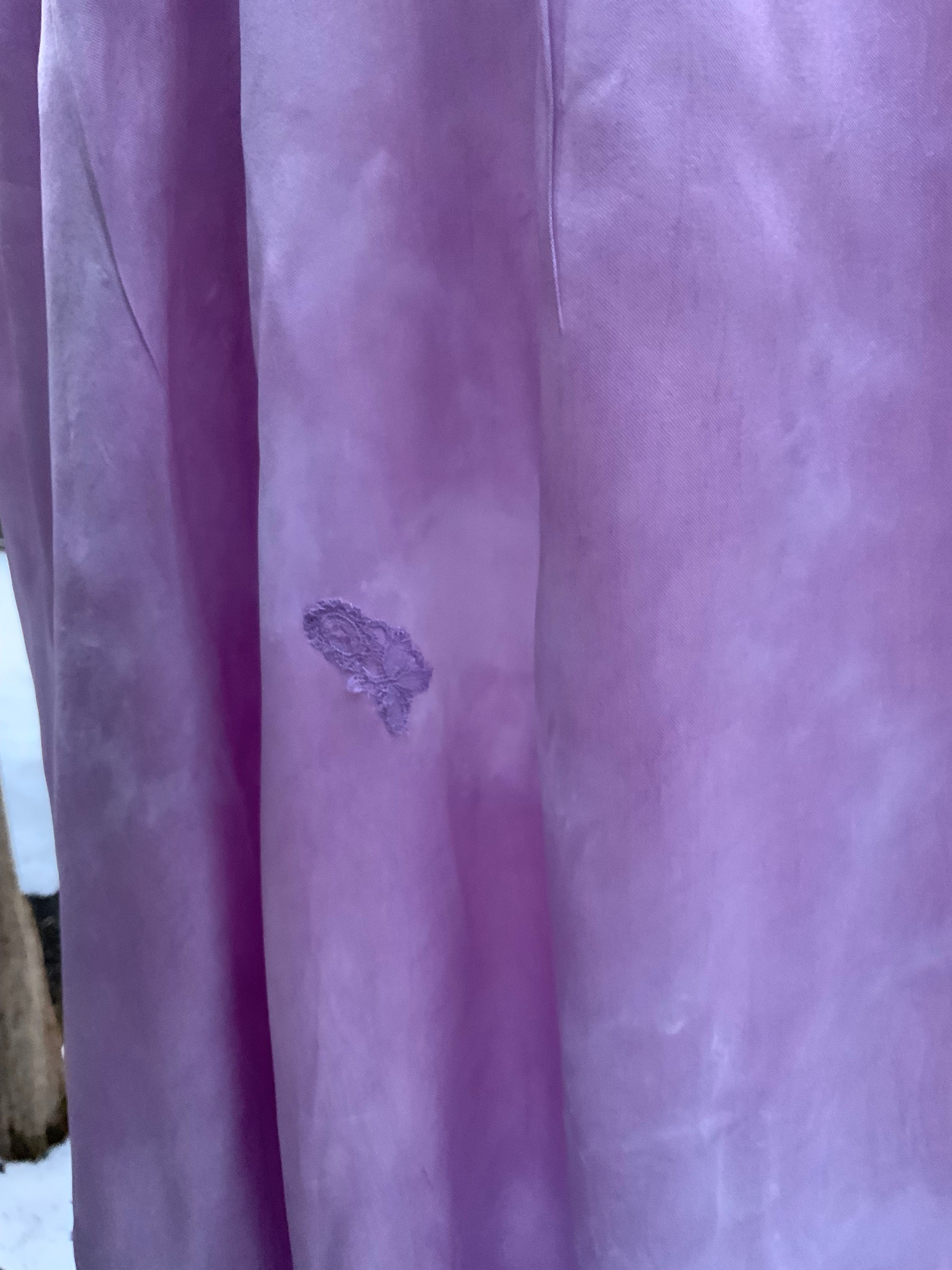 The satin has been hand dyed to create a layered watercolor effect, ranging from pale lavender to deeper violet tones. The tonal variation enhances the natural drape of the fabric and gives the piece a soft, ethereal