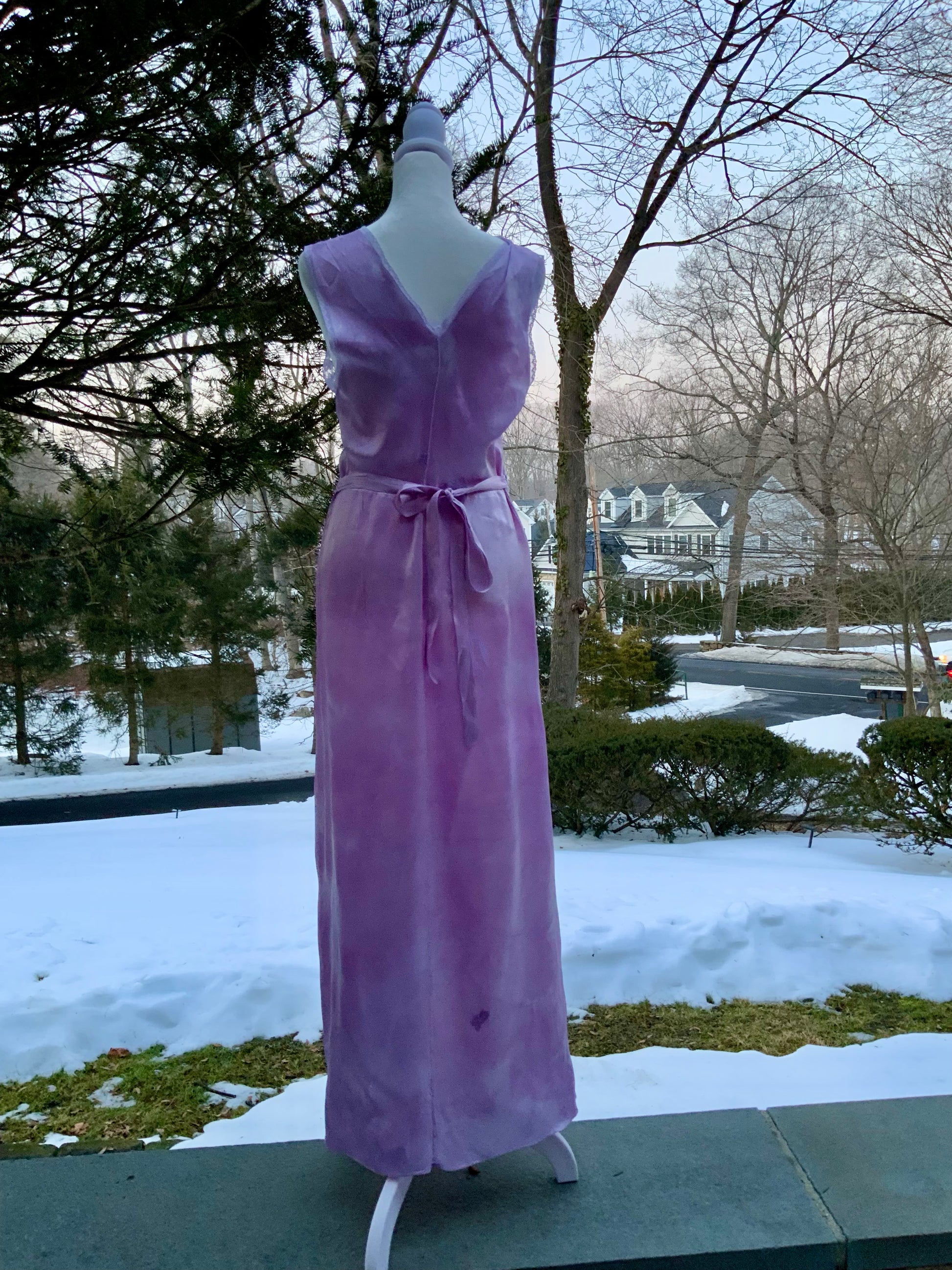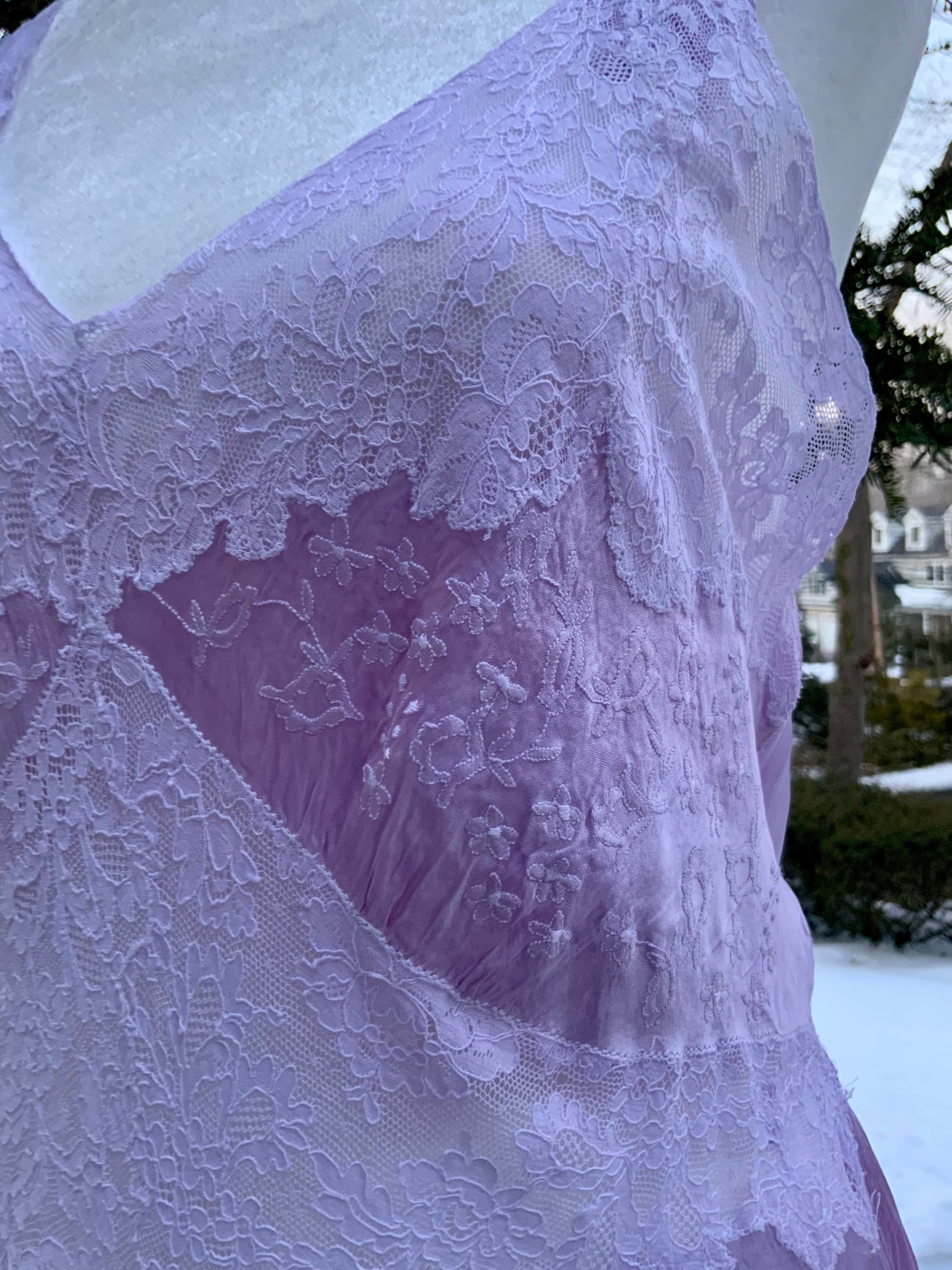 A romantic 1970s satin and lace gown, hand dyed in soft tonal lilac hues.