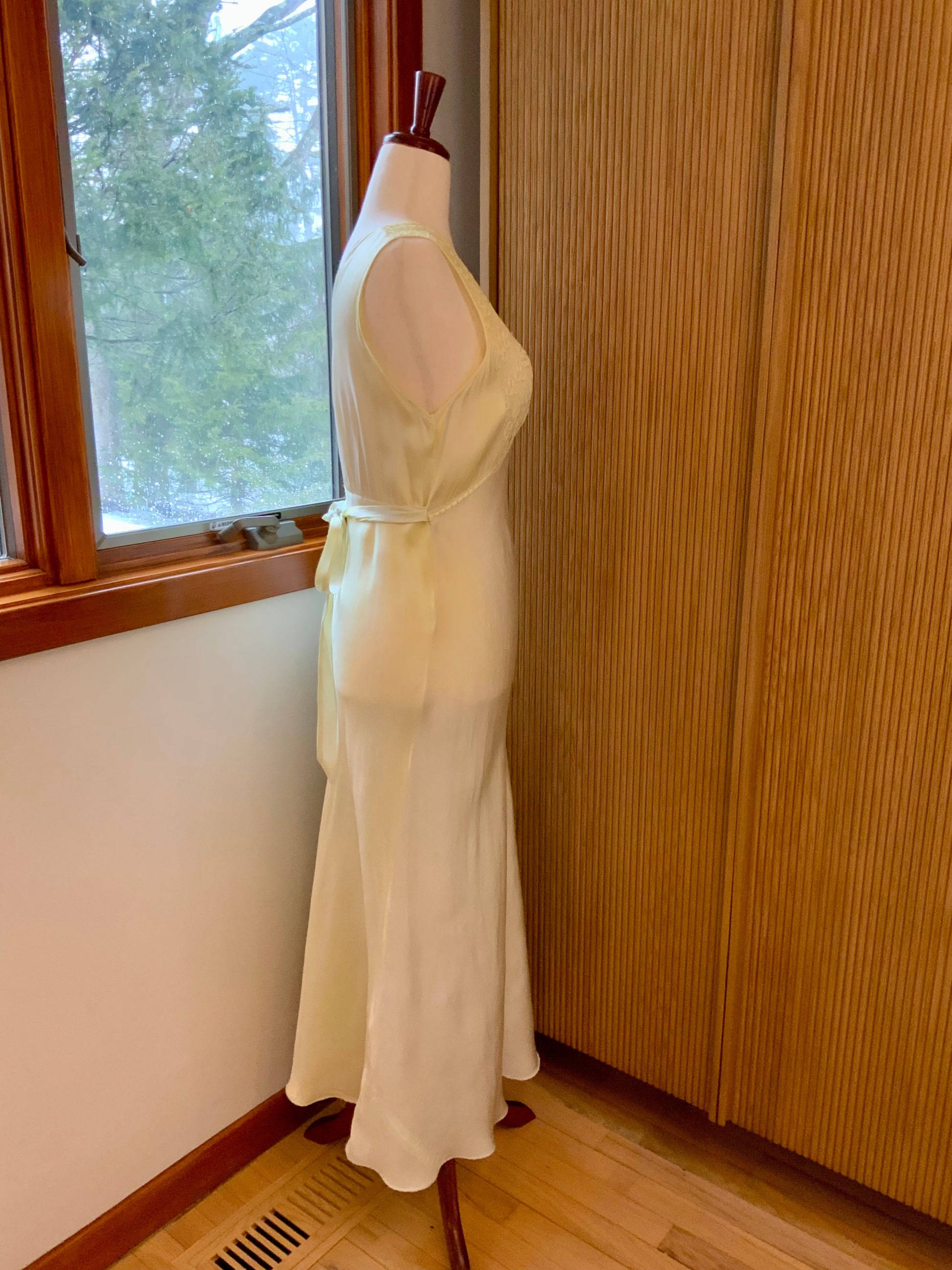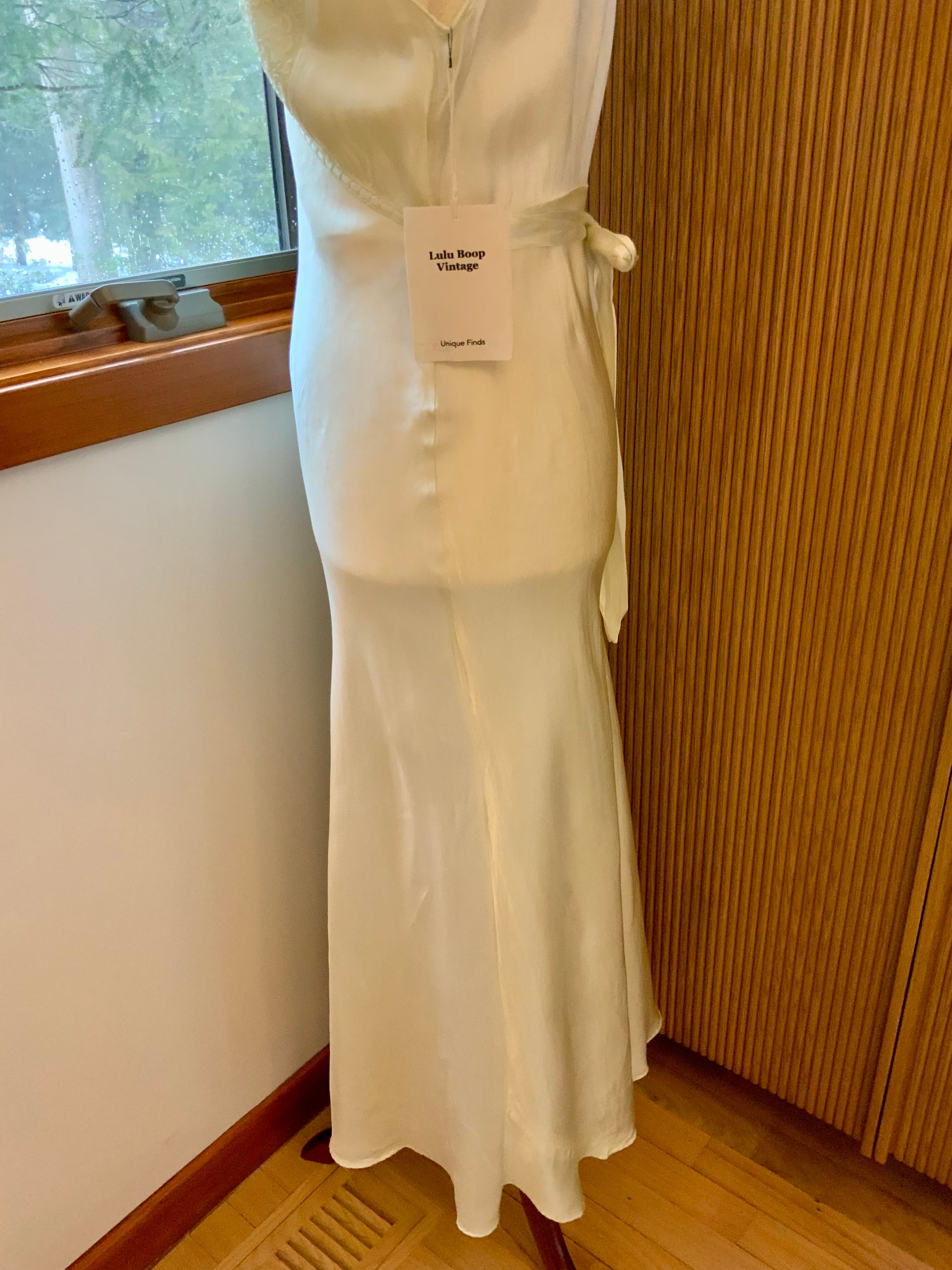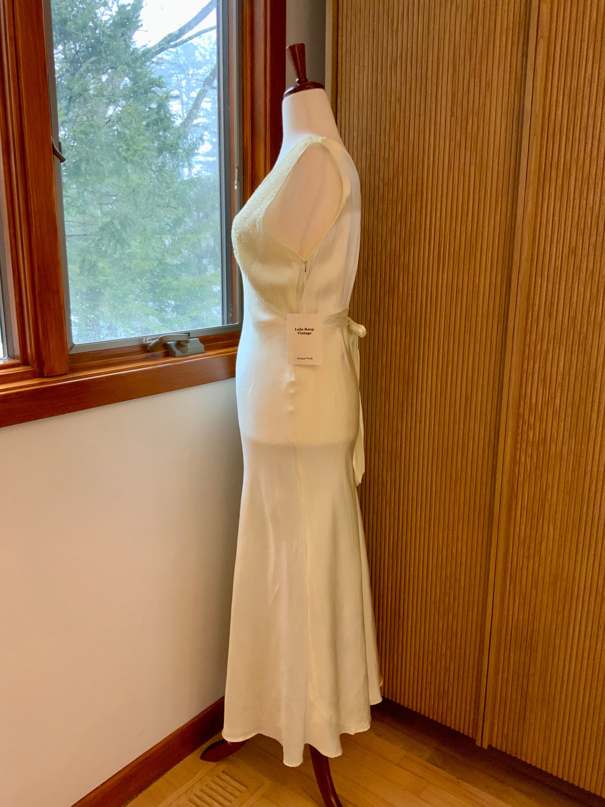 The silhouette drapes effortlessly along the body, creating that unmistakable 1940s inspired shape — feminine, elongated, and refined. The lace overlay at the bodice is delicately embroidered with circular motifs, adding texture and subtle depth while remaining understated.