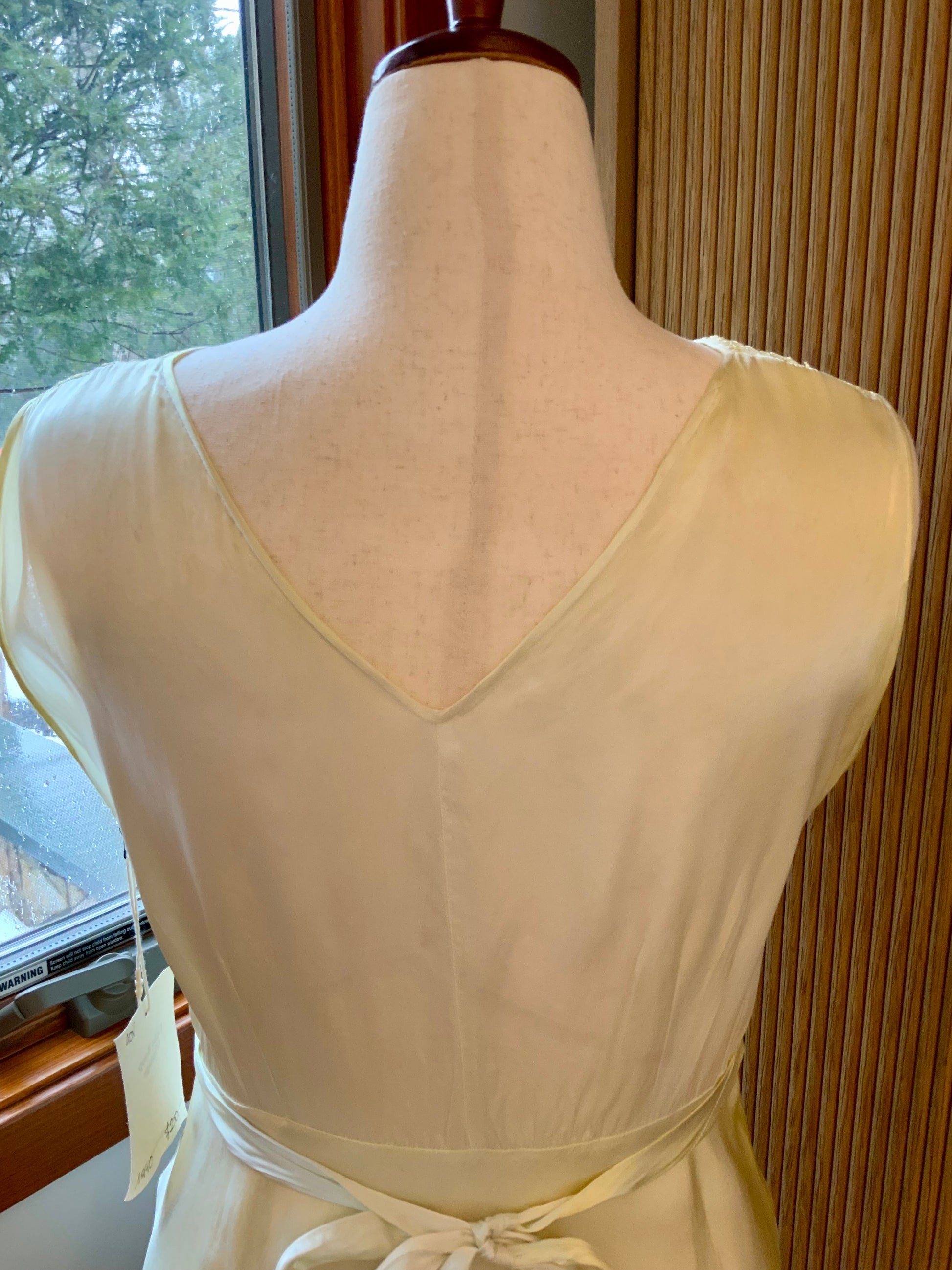 The waist tie allows for adjustable shaping, making it wearable as both an intimate evening piece or styled as an outer dress.