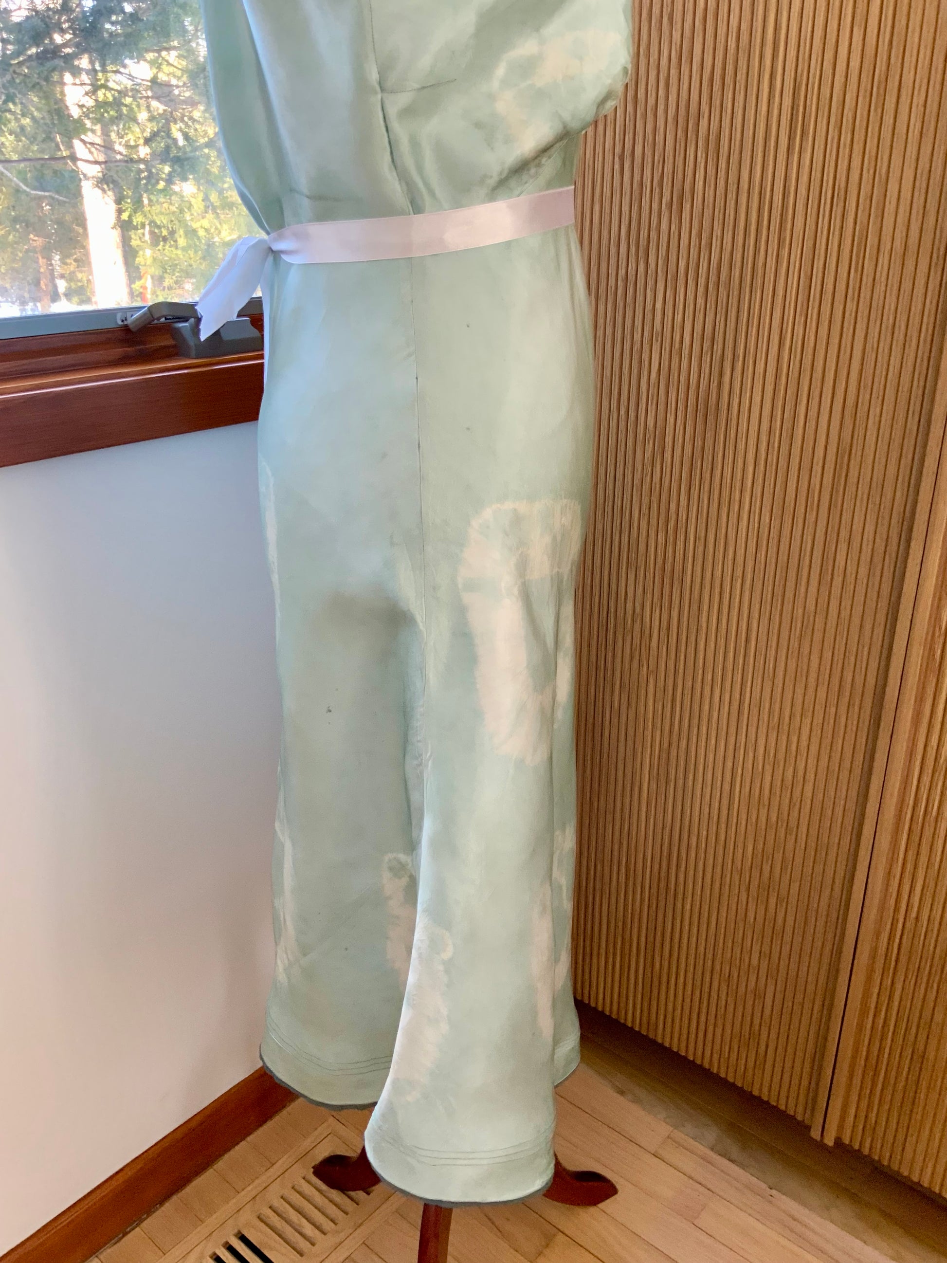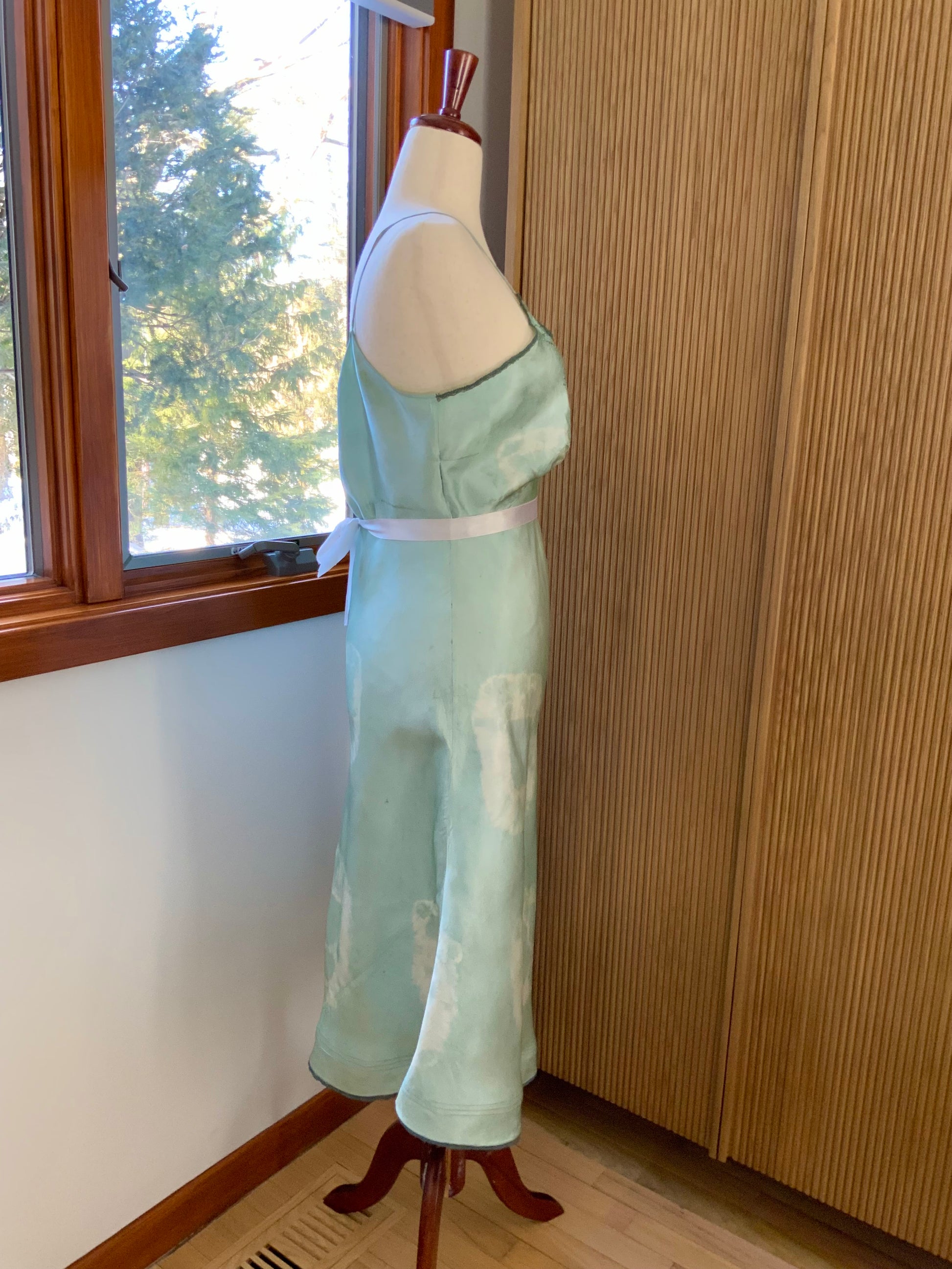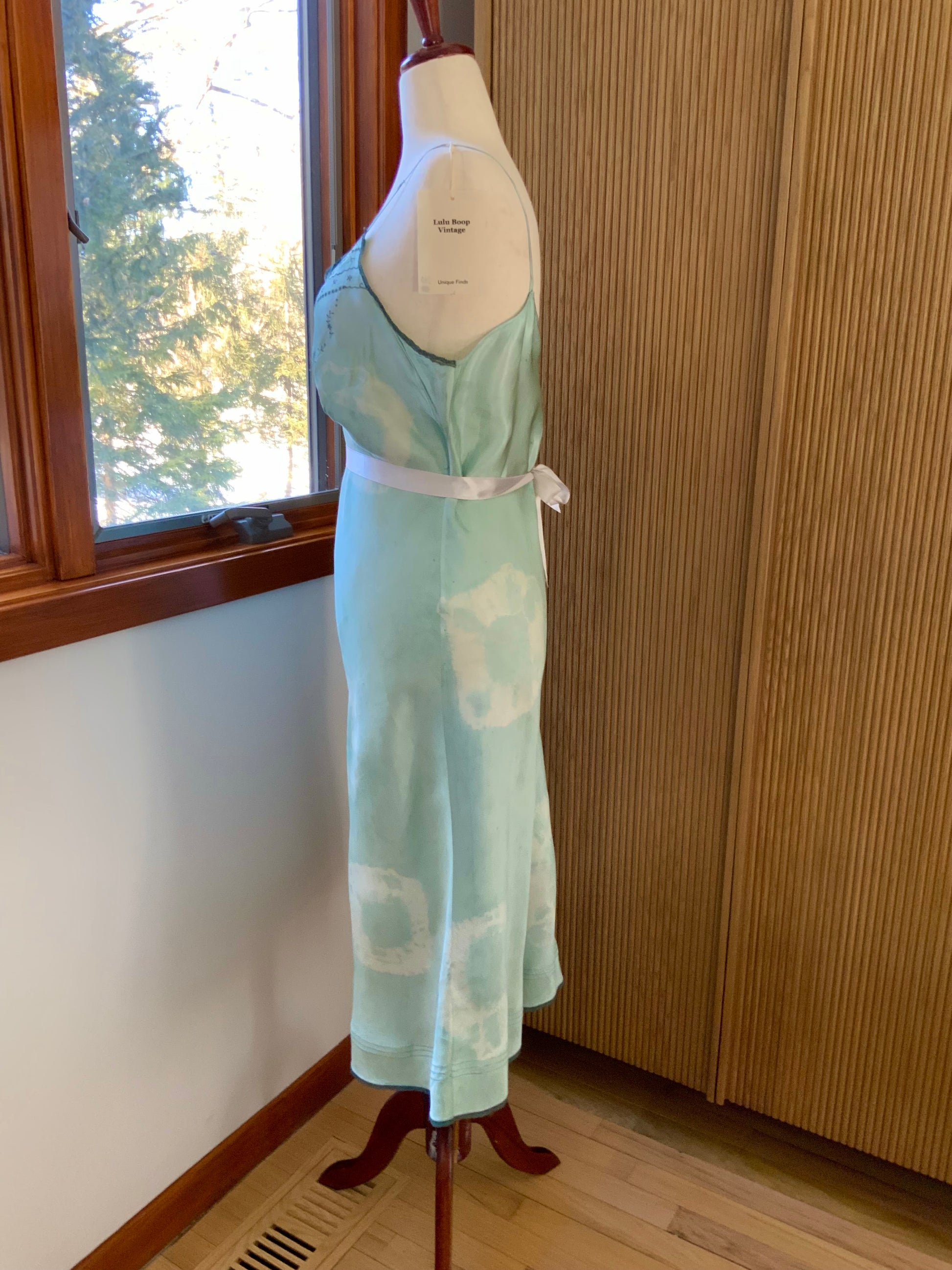 A beautifully revived late 1930s to early 1940s silk satin slip or nightgown, hand-dyed in a soft celadon green tone.