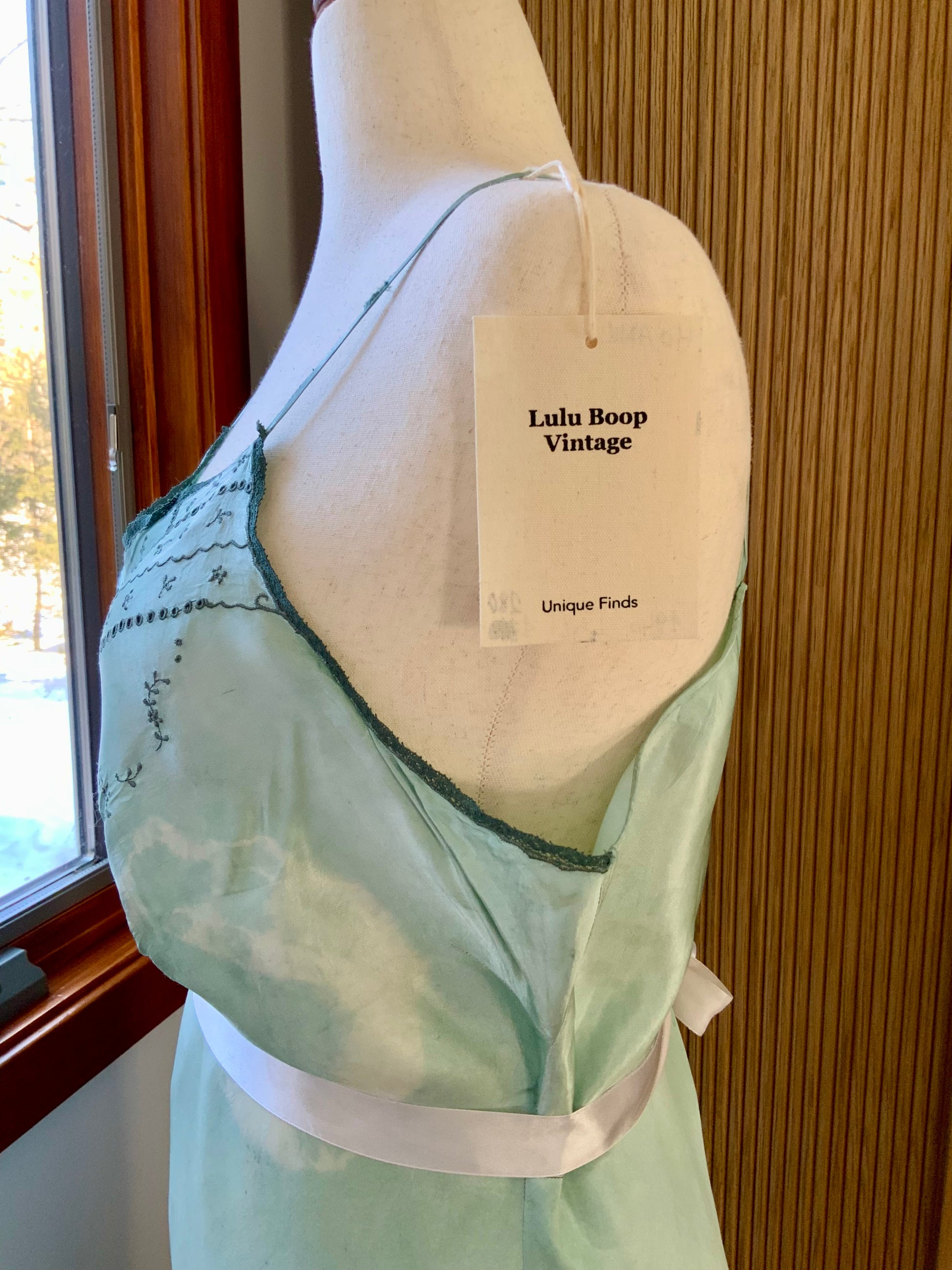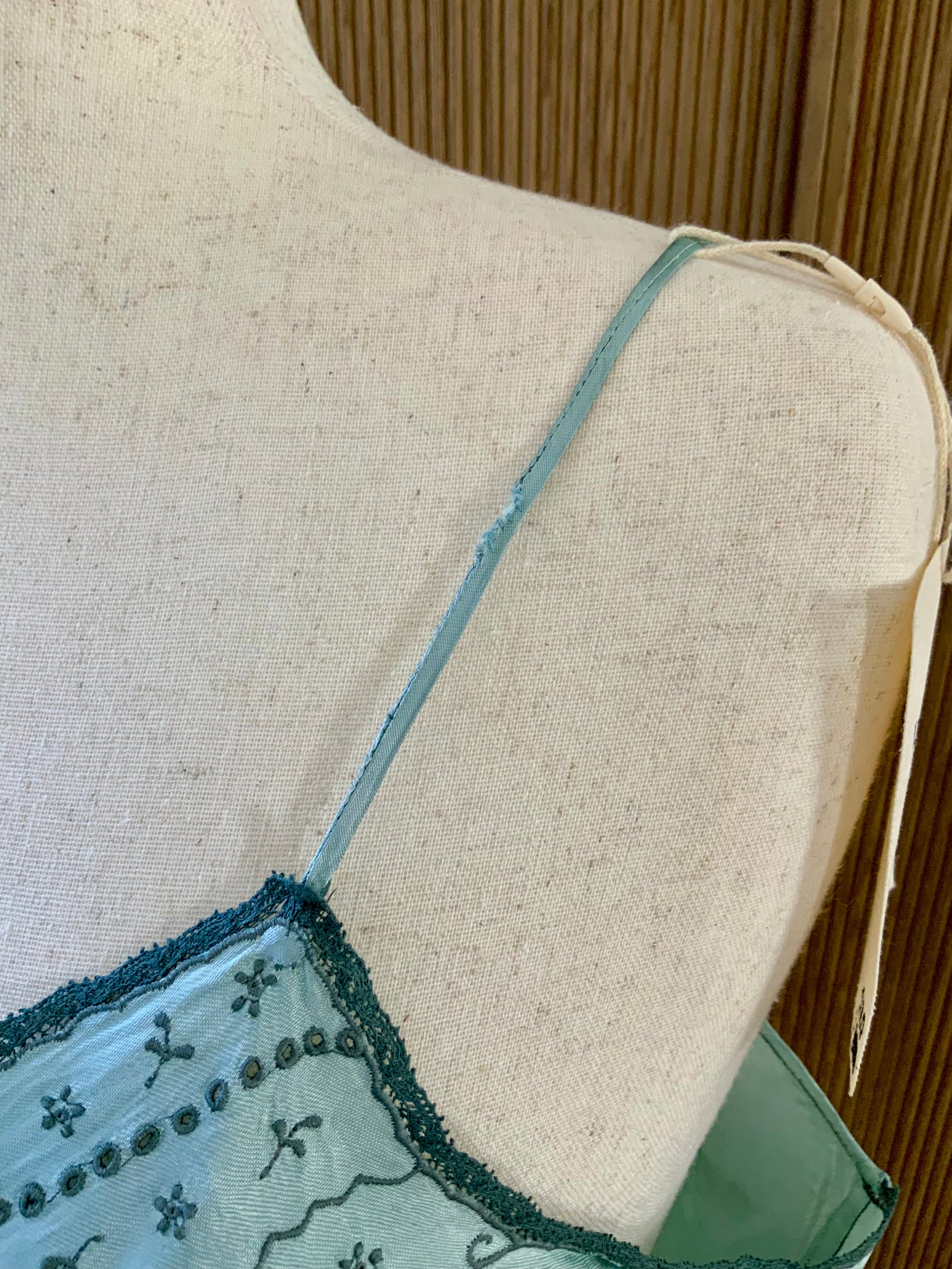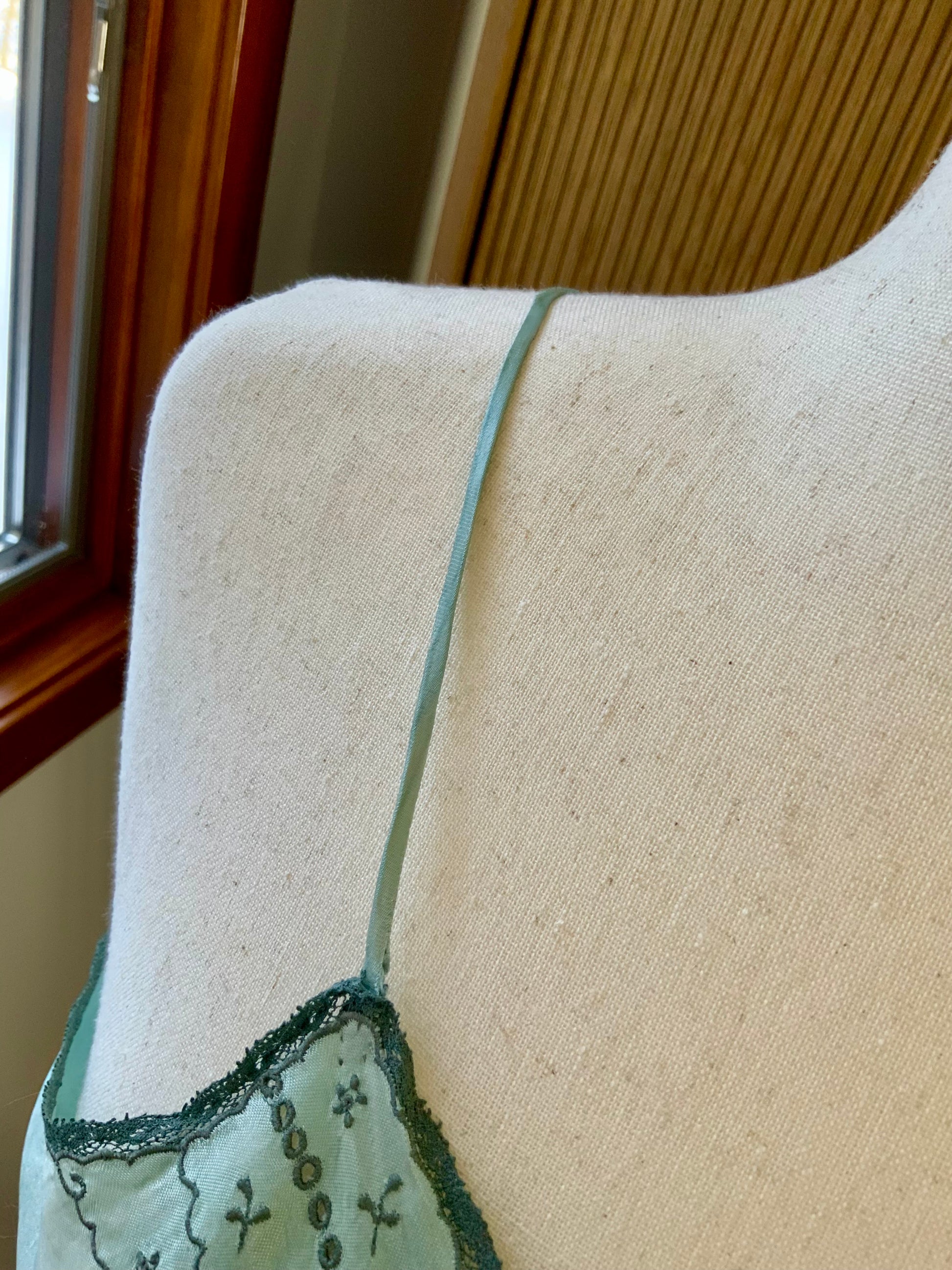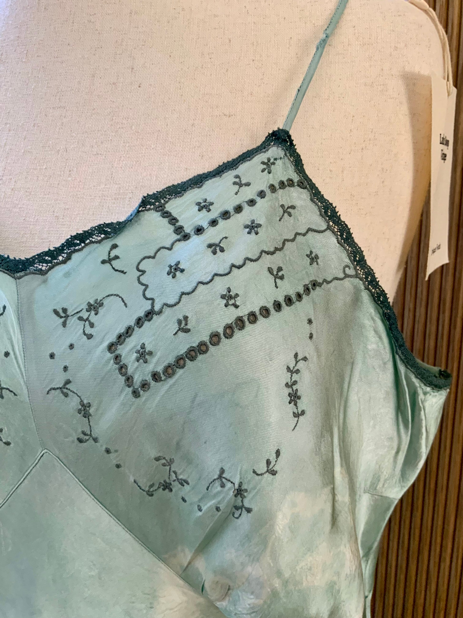 A beautifully revived late 1930s to early 1940s silk satin slip or nightgown, hand-dyed in a soft celadon green tone.