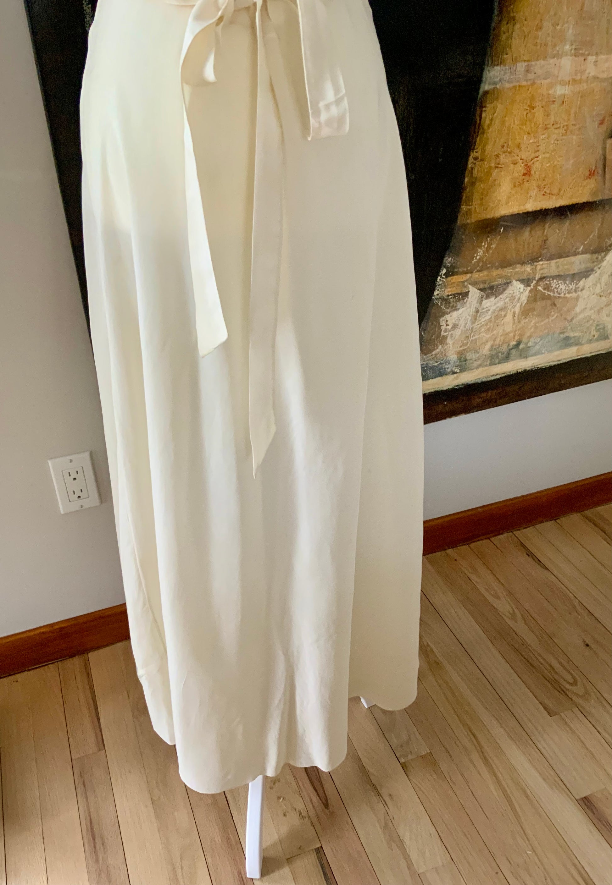 A side waist tie allows gentle shaping while maintaining the relaxed silhouette typical of high-quality boudoir garments of the period. The silk is luminous yet understated, with a smooth, cool hand and graceful flow.