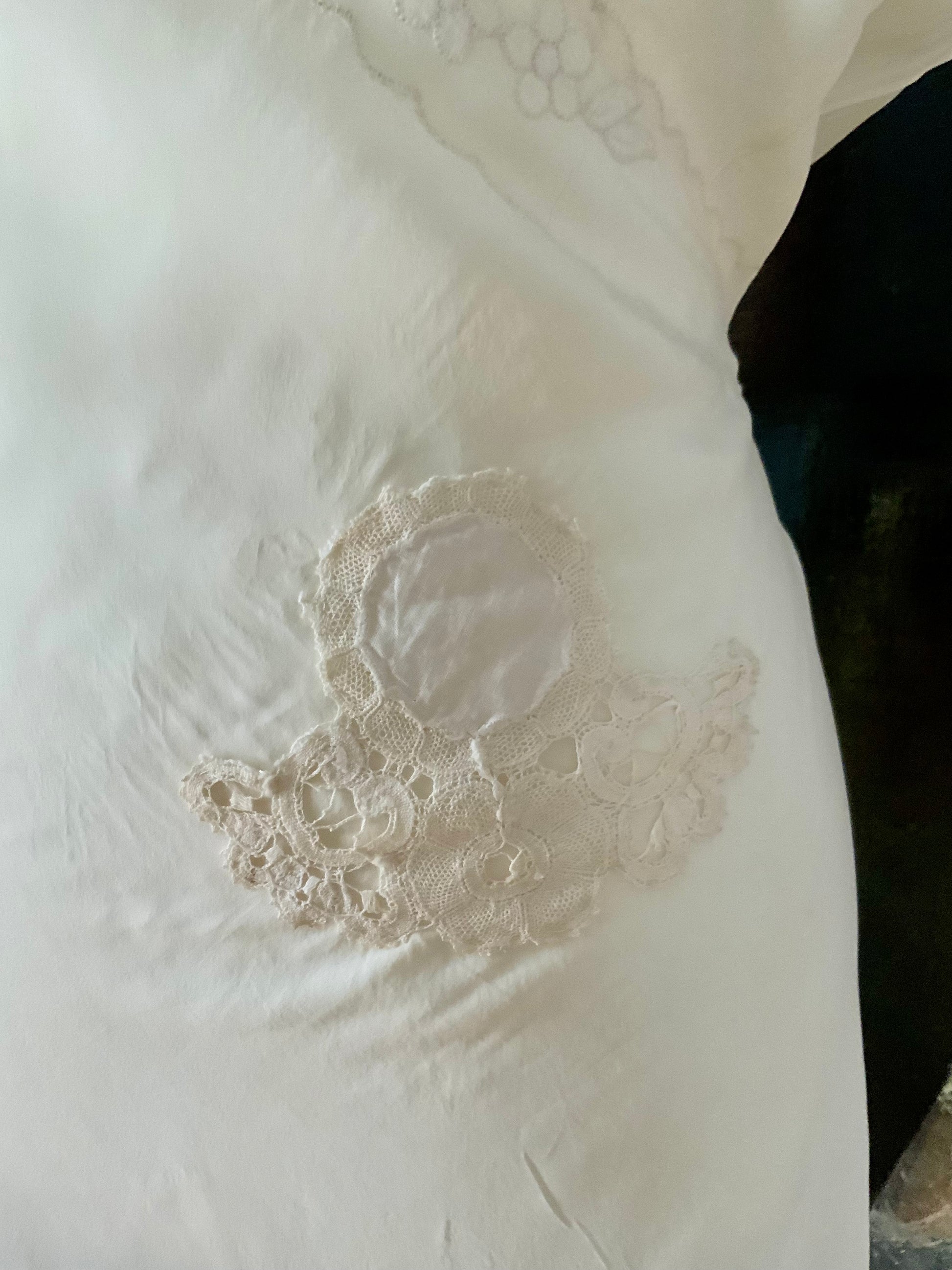 Two small areas of wear have been carefully stabilized with sympathetic antique lace appliqué, preserving both integrity and visual harmony. There is also faint age-related discoloration near the hem, consistent with antique silk garments. The fabric remains structurally sound and fully wearable with mindful care.
