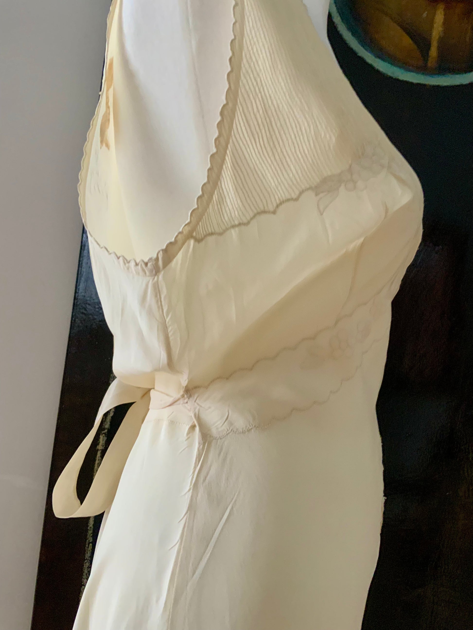 An exquisite antique nightgown dating to the late 1930s to early 1940s, crafted from pure silk in a soft ivory tone.