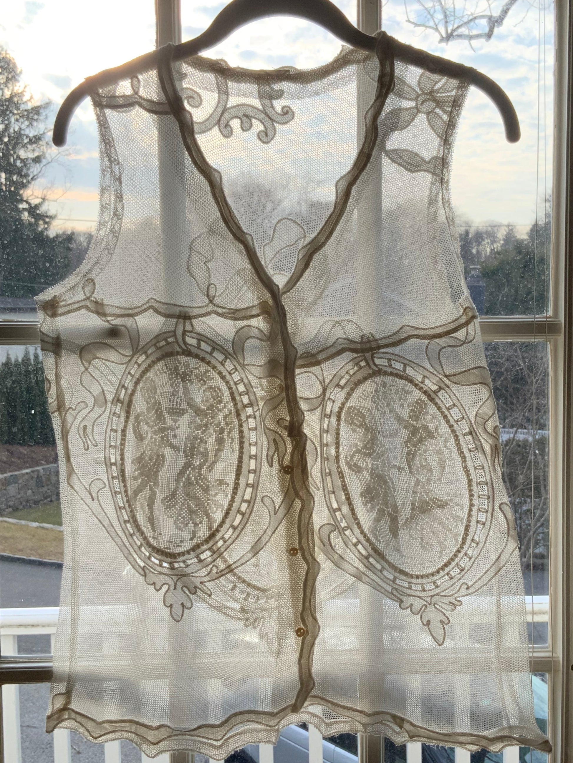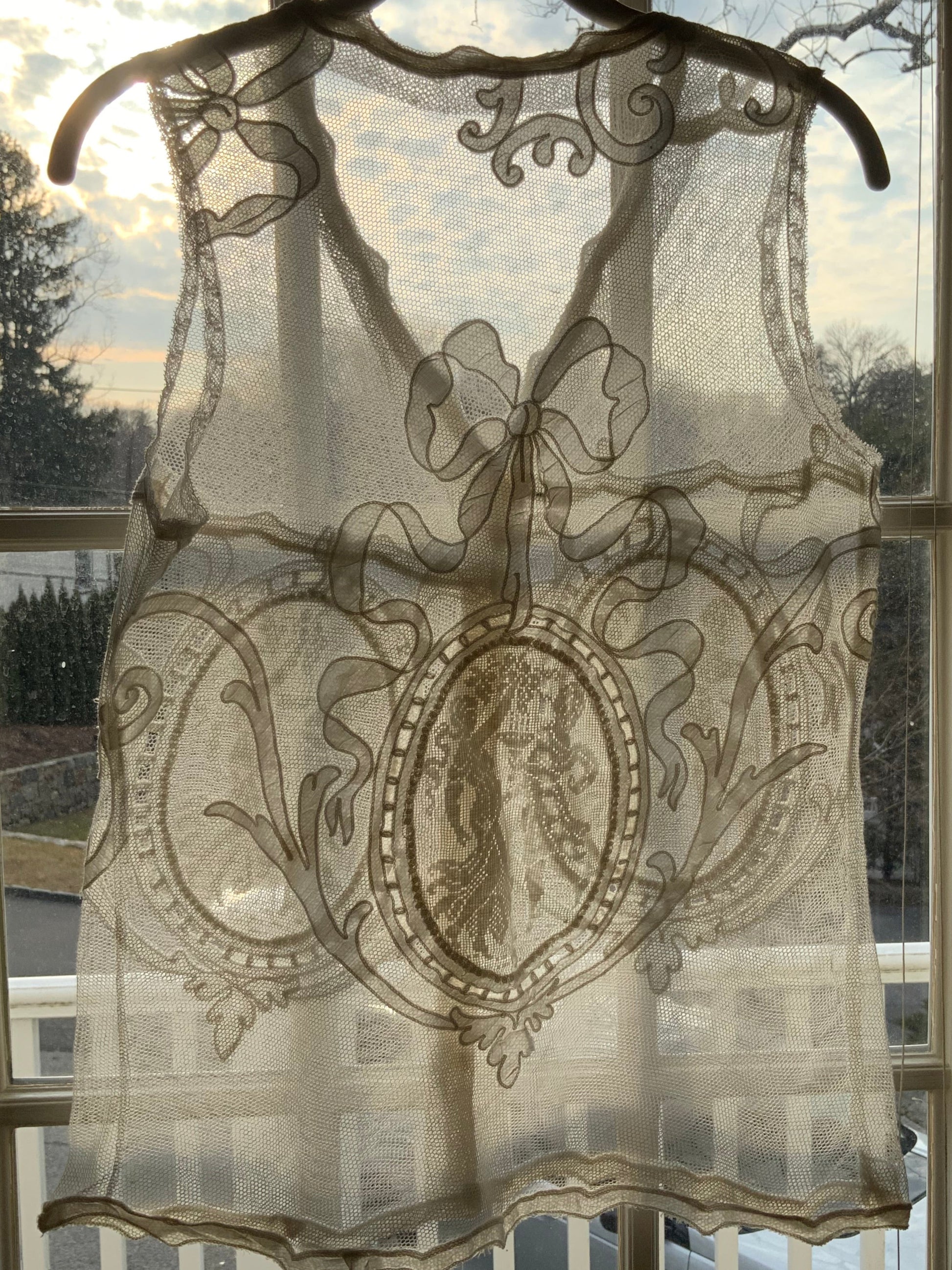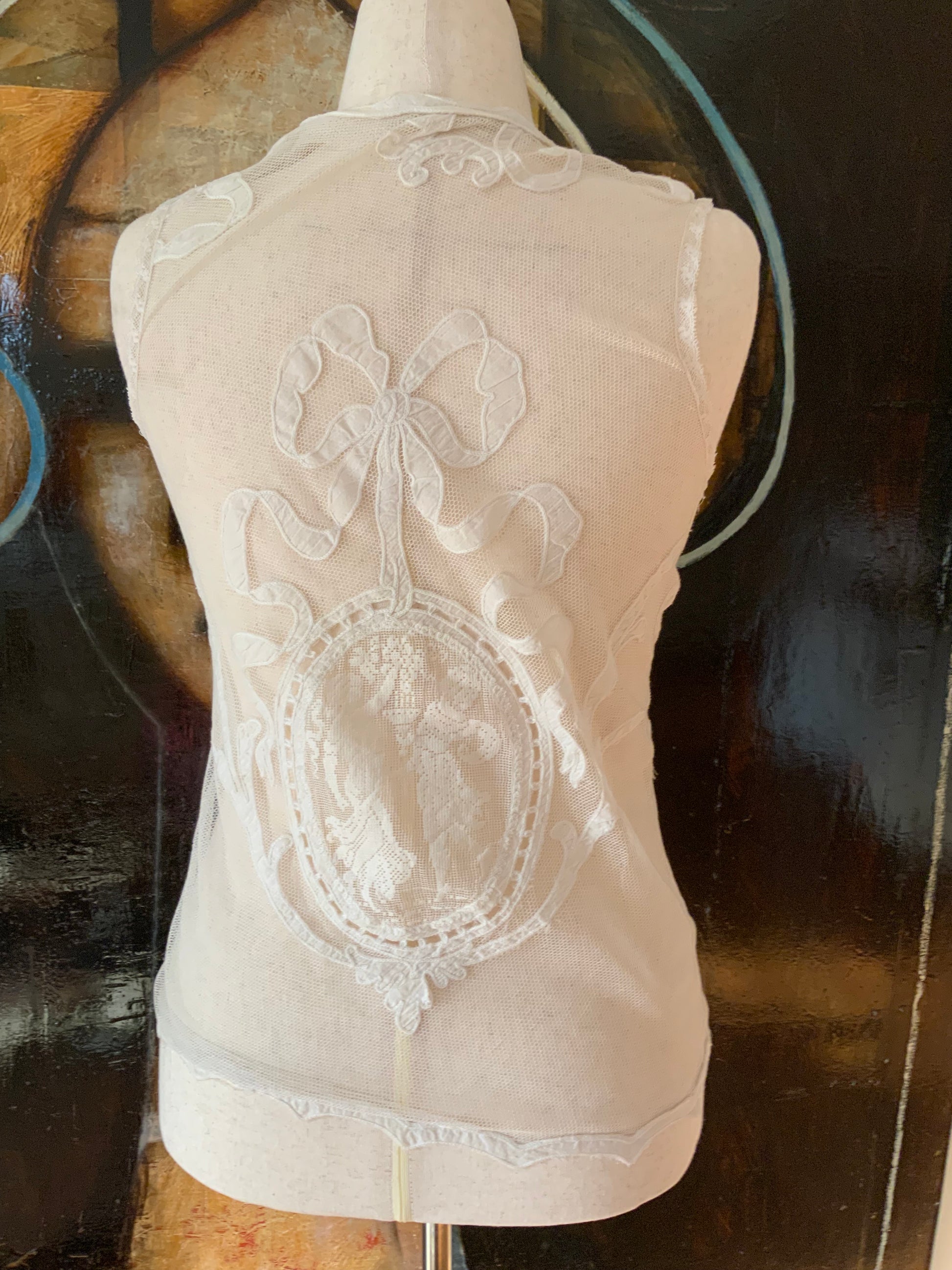 This breathtaking blouse, entirely made with antique filet lace, is a true work of art. The front features two  figures of two women, elegantly framed in an oval shape, showcasing the intricate craftsmanship of the lace. The back mirrors this design with the same oval-shaped figures, accented by a stunning bow at the top—adding a beautiful finishing touch.