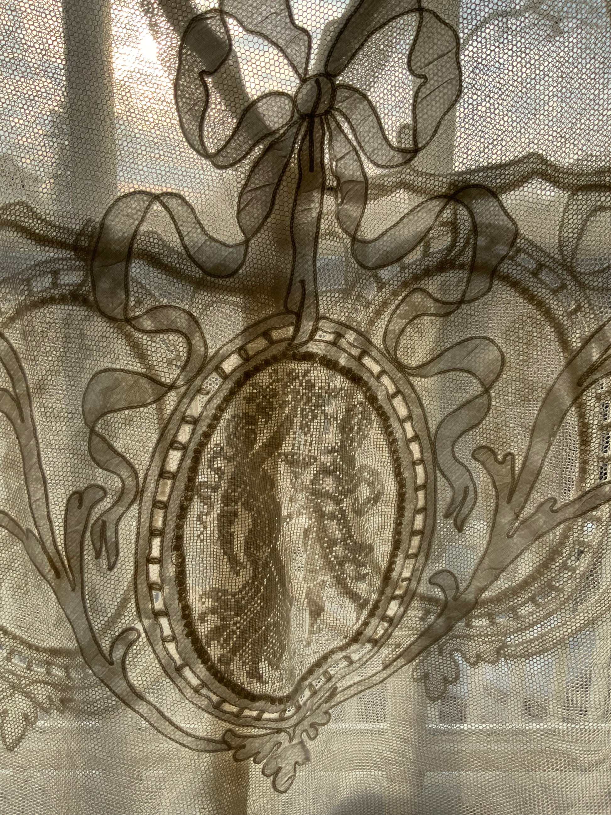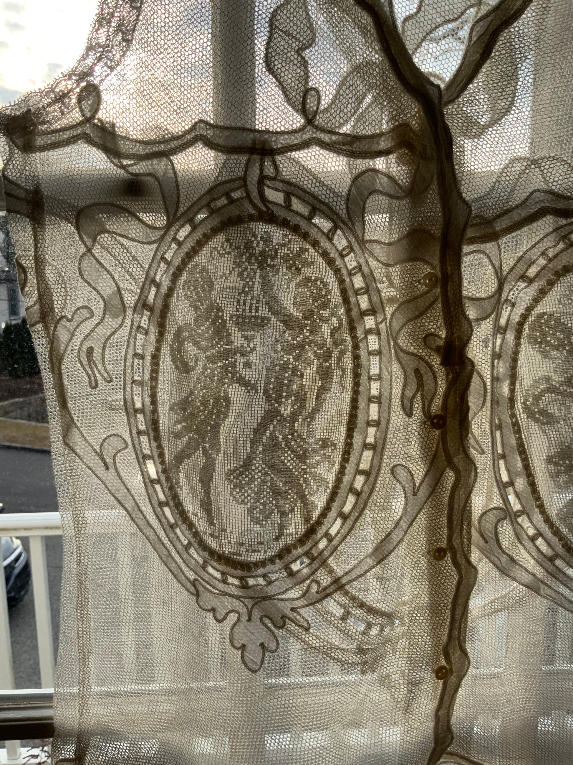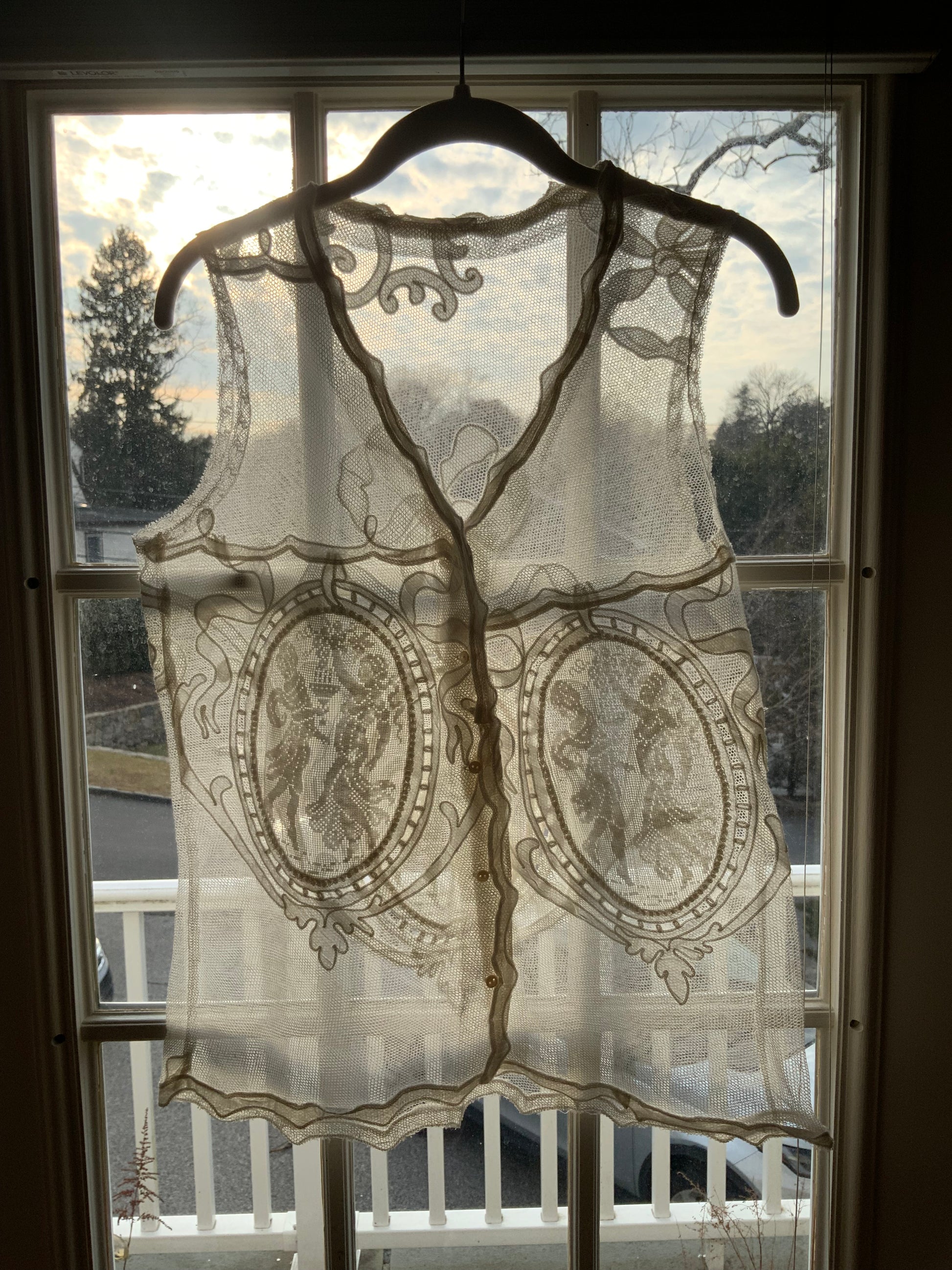 This breathtaking blouse, entirely made with antique filet lace, is a true work of art. The front features two  figures of two women, elegantly framed in an oval shape, showcasing the intricate craftsmanship of the lace. The back mirrors this design with the same oval-shaped figures, accented by a stunning bow at the top—adding a beautiful finishing touch.