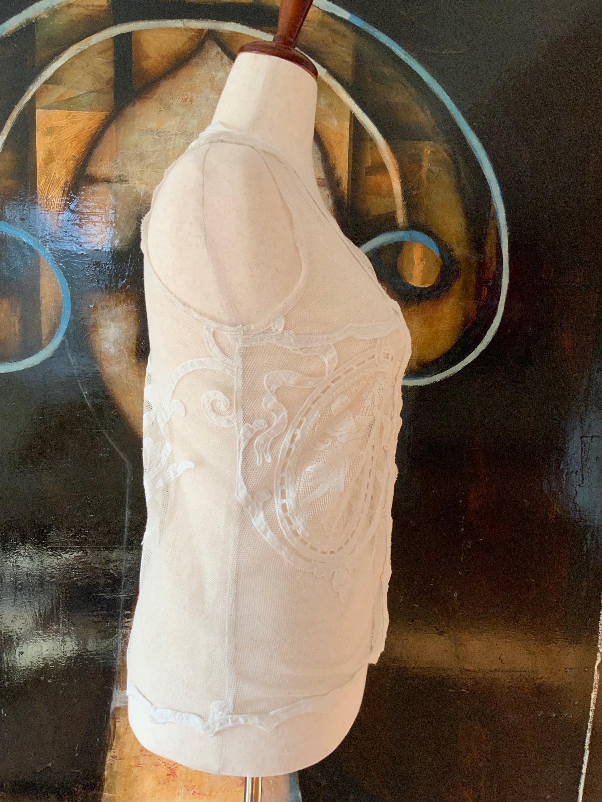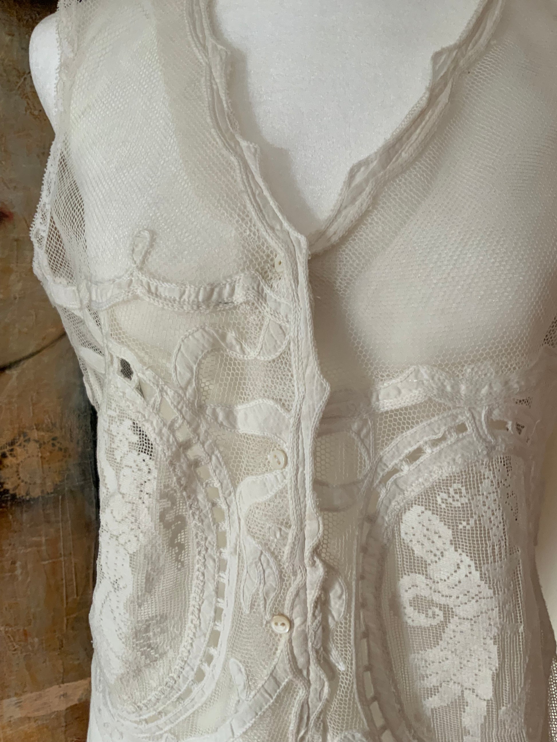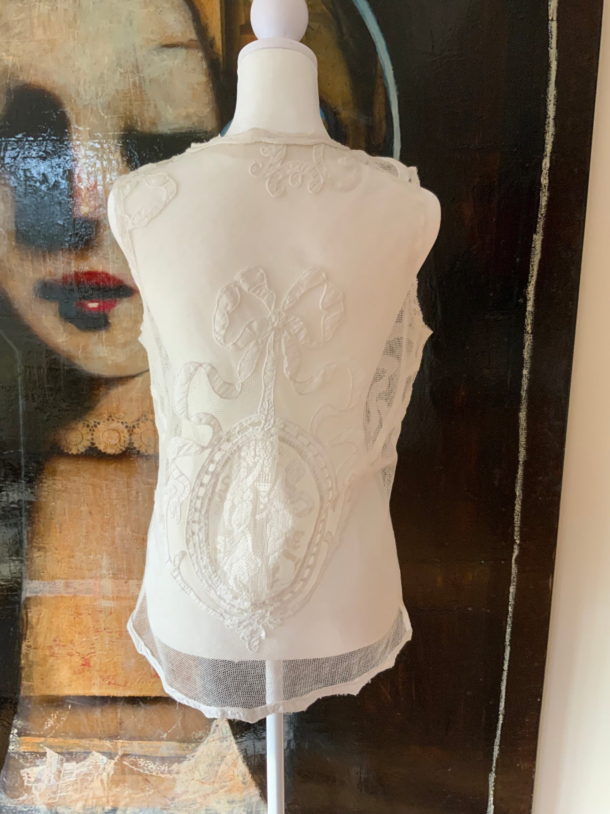 This piece is from the last collection from an incredible Argentinian seamstress who dedicated her life to creating unique pieces using antique fabrics , some present, but all adorned with antique lace, trims, and appliqués. I was fortunate enough to acquire her final collection, making this a truly special find.