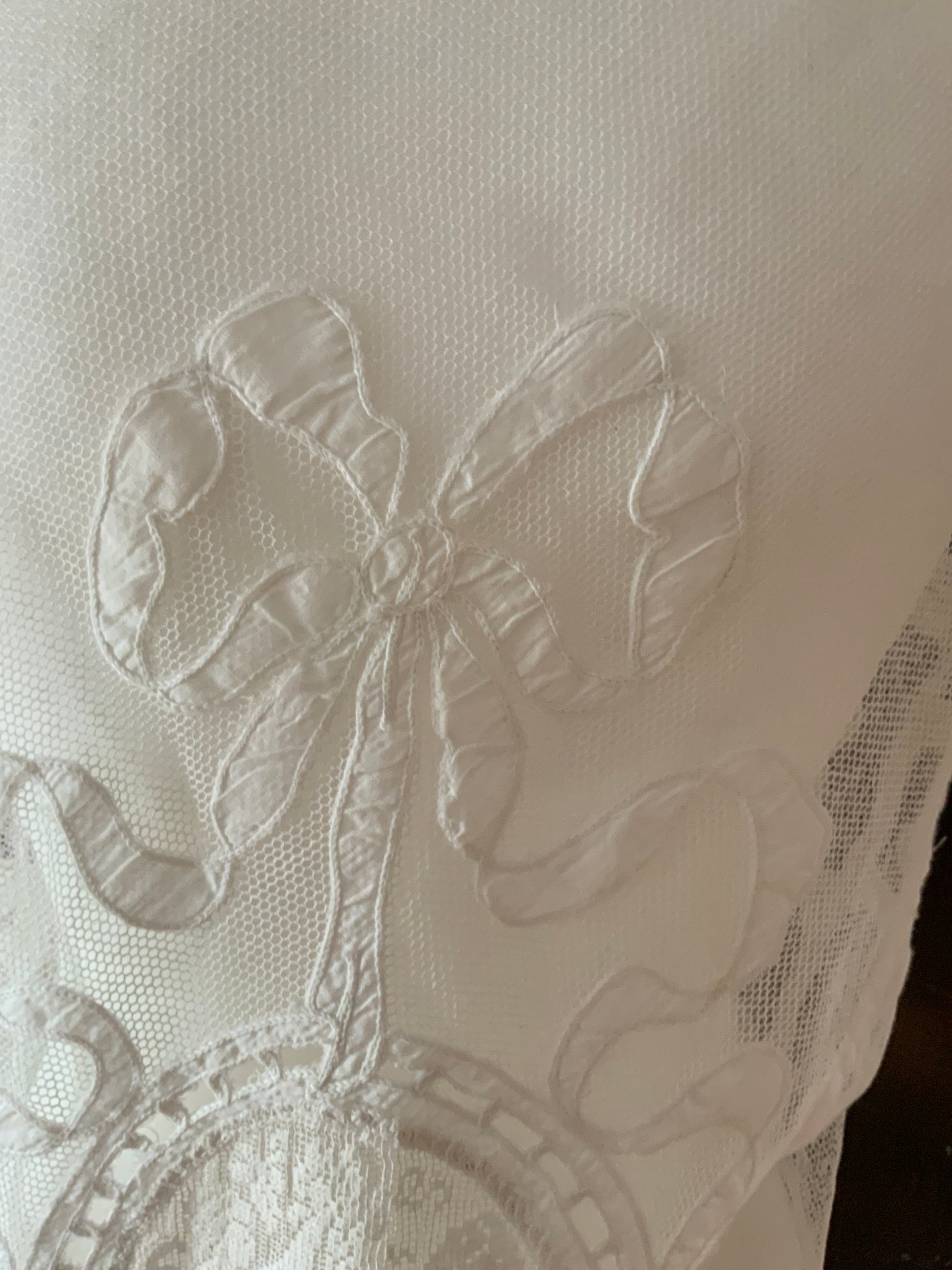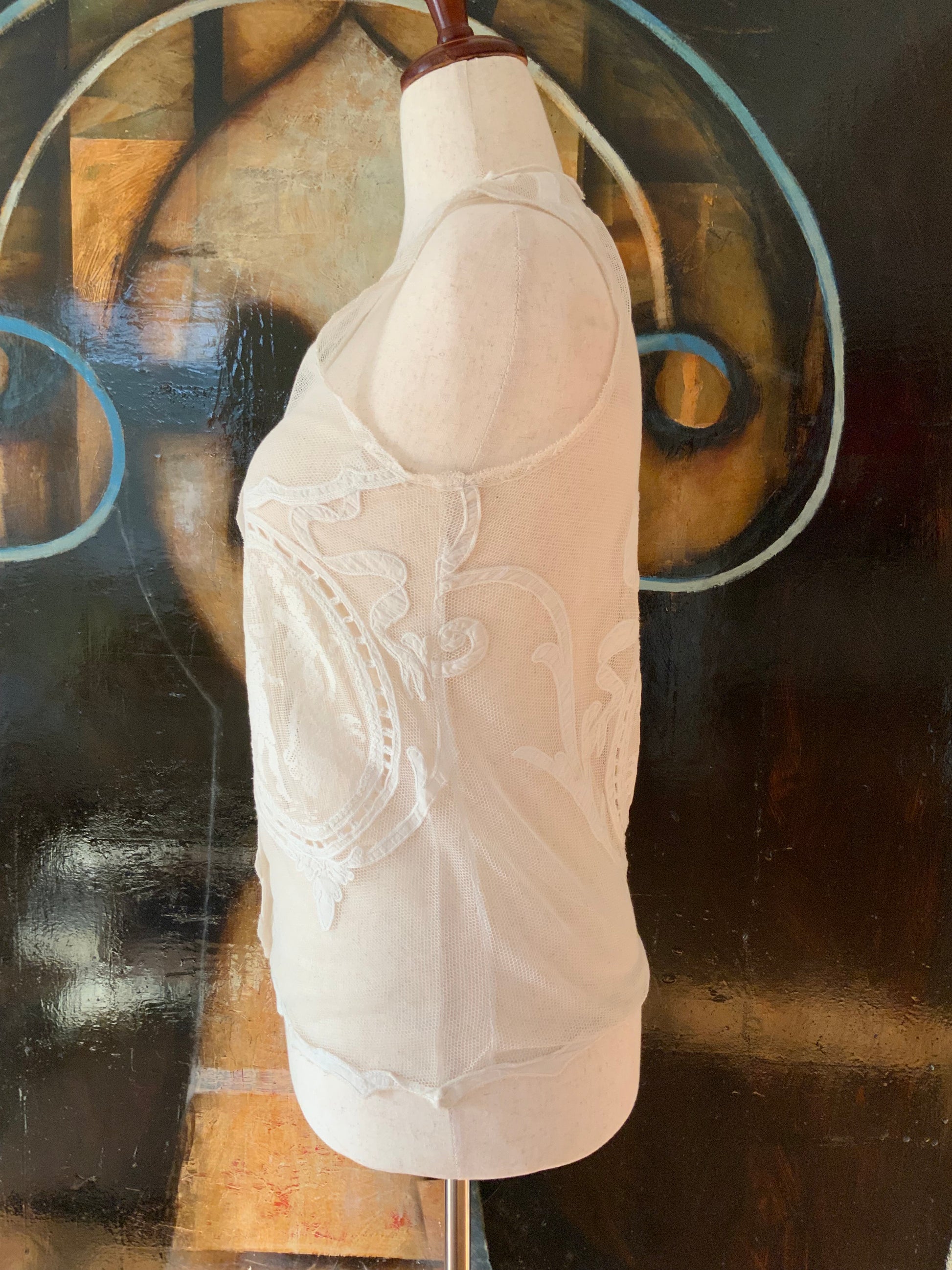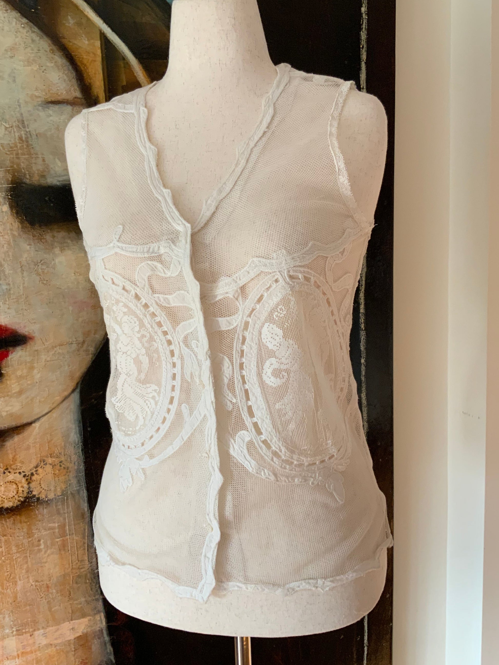 This piece is from the last collection from an incredible Argentinian seamstress who dedicated her life to creating unique pieces using antique fabrics , some present, but all adorned with antique lace, trims, and appliqués. I was fortunate enough to acquire her final collection, making this a truly special find.