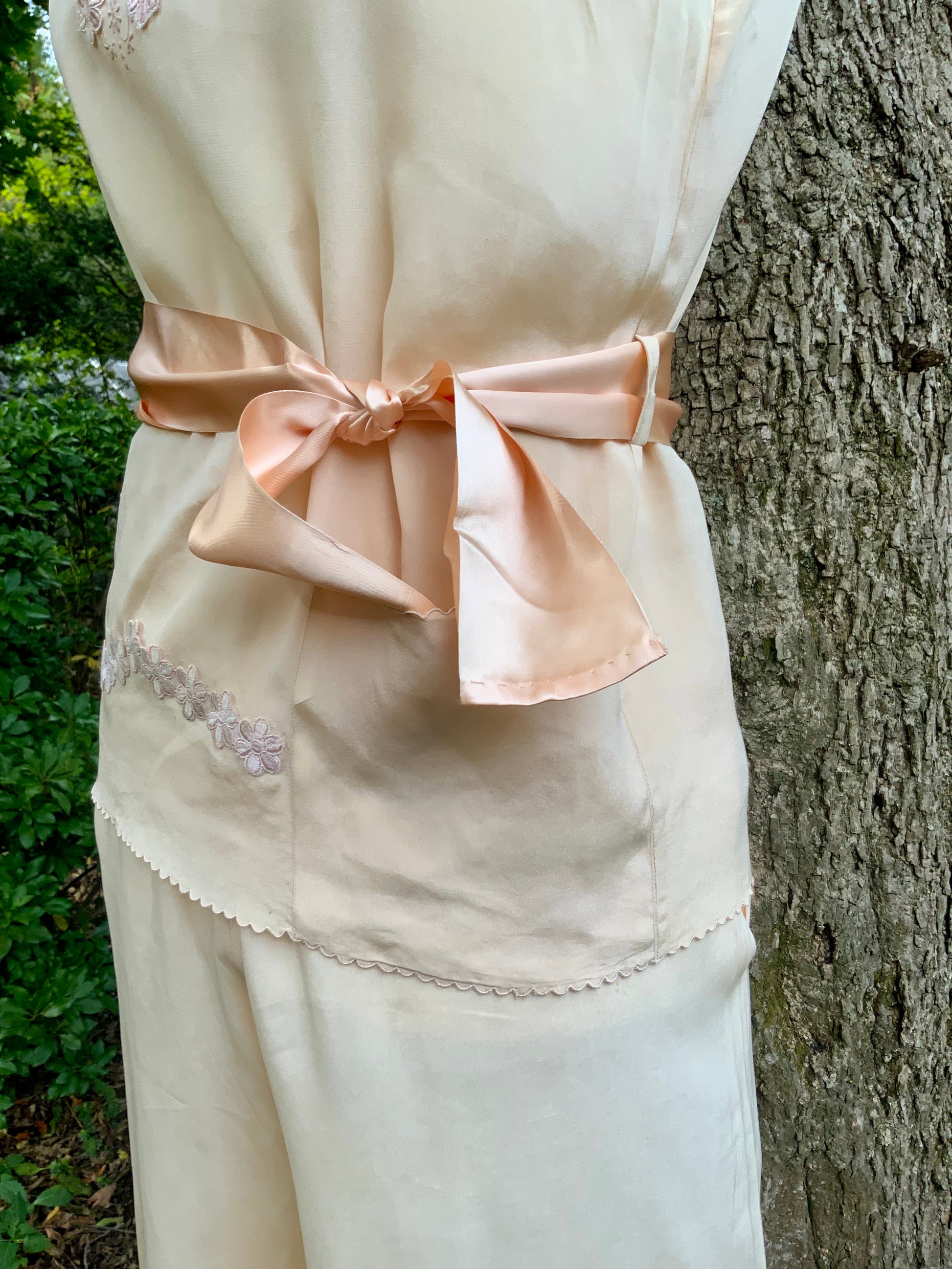 1920s–1930s Pure Silk Pajama in Peach with Vintage Floral Appliqués