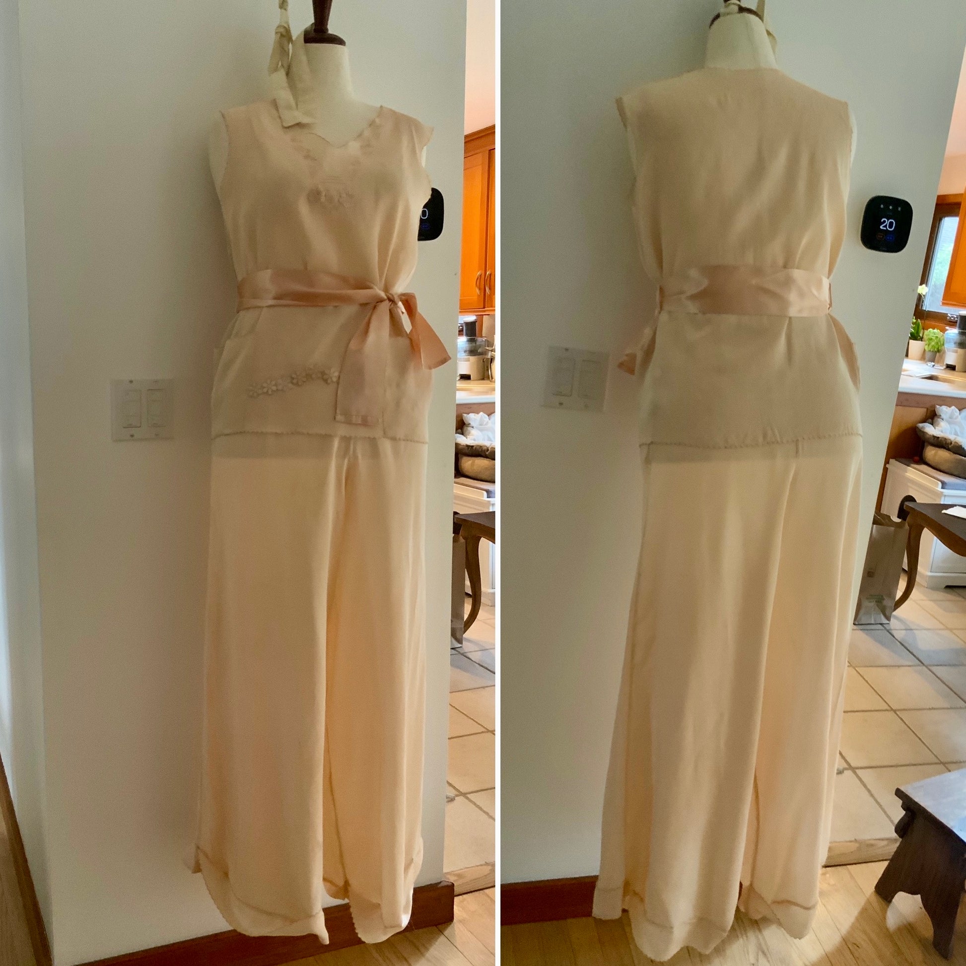 1920s–1930s Pure Silk Peach Pajama | Hand Restored with Vintage Floral Appliqués & Satin Ribbon | One-of-a-Kind Collectible Loungewear- 20AJ