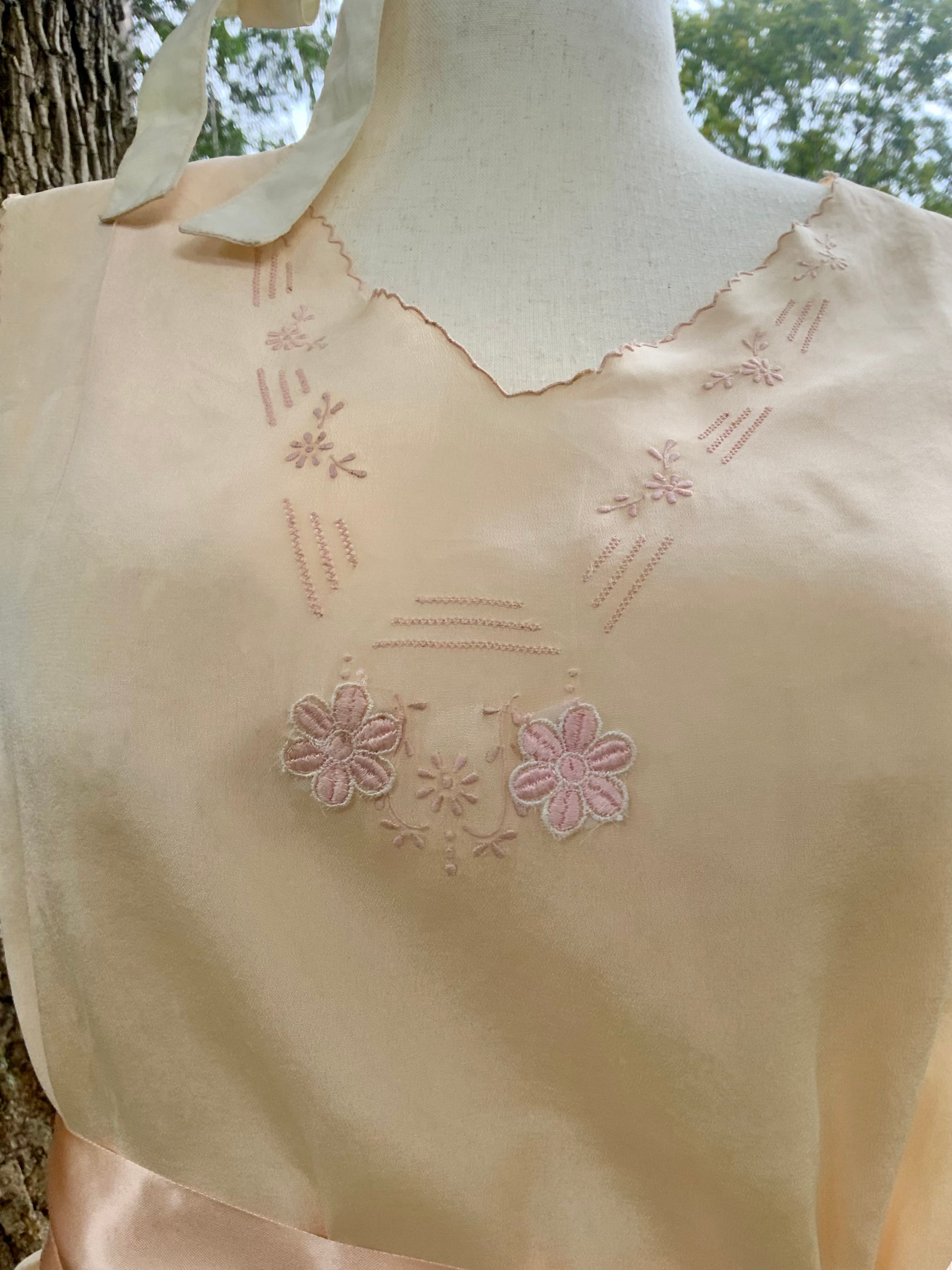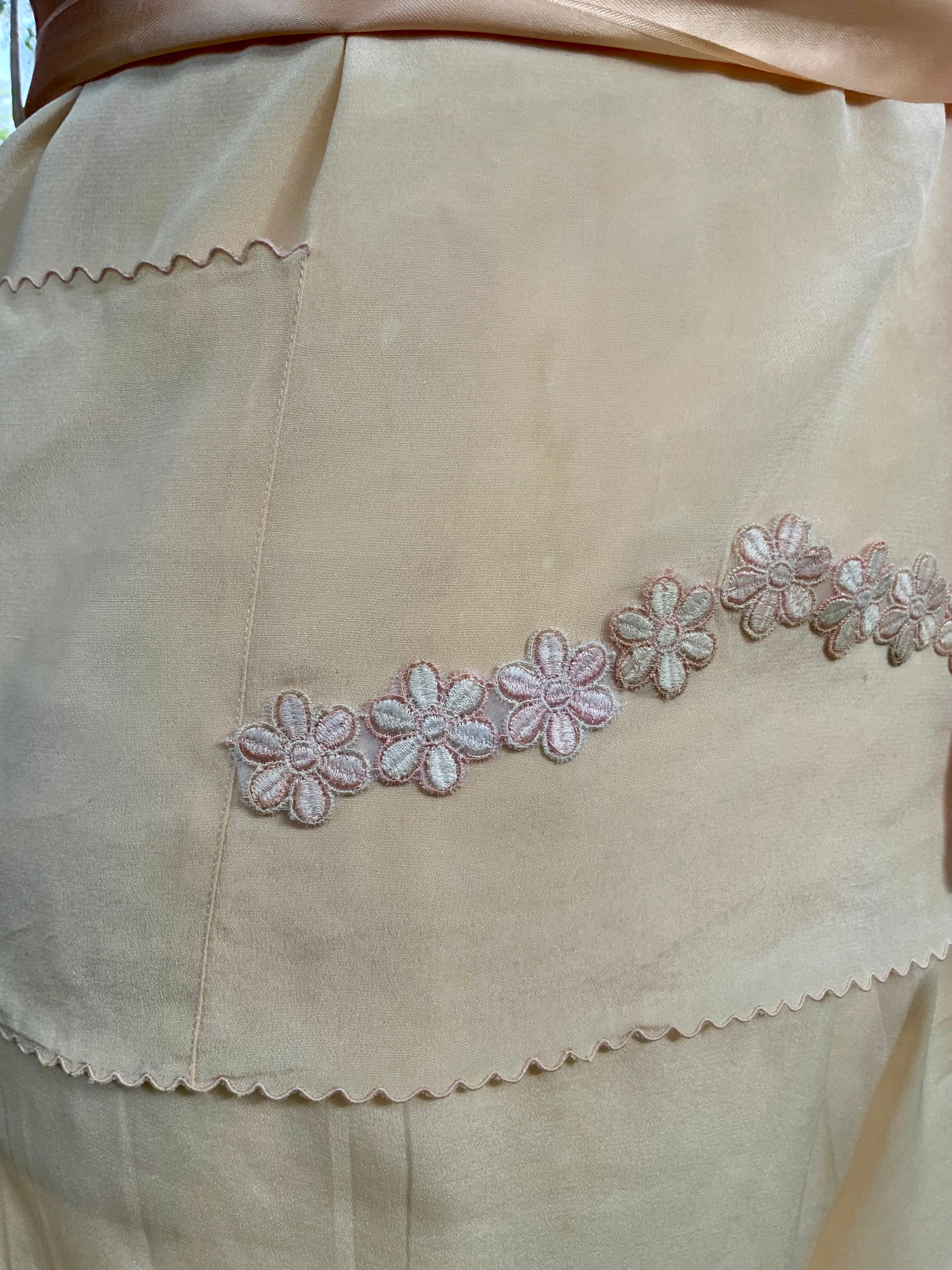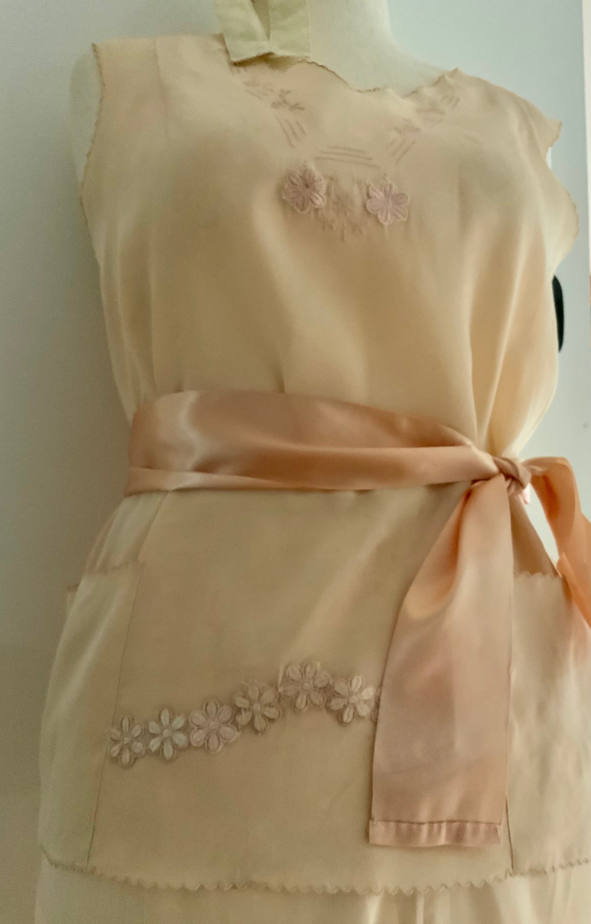 Restored with care by hand, tiny imperfections were covered using vintage floral appliqués in matching peach silk, blending seamlessly into the original fabric. A soft satin ribbon is incluyen to Replace original belt that is missing.