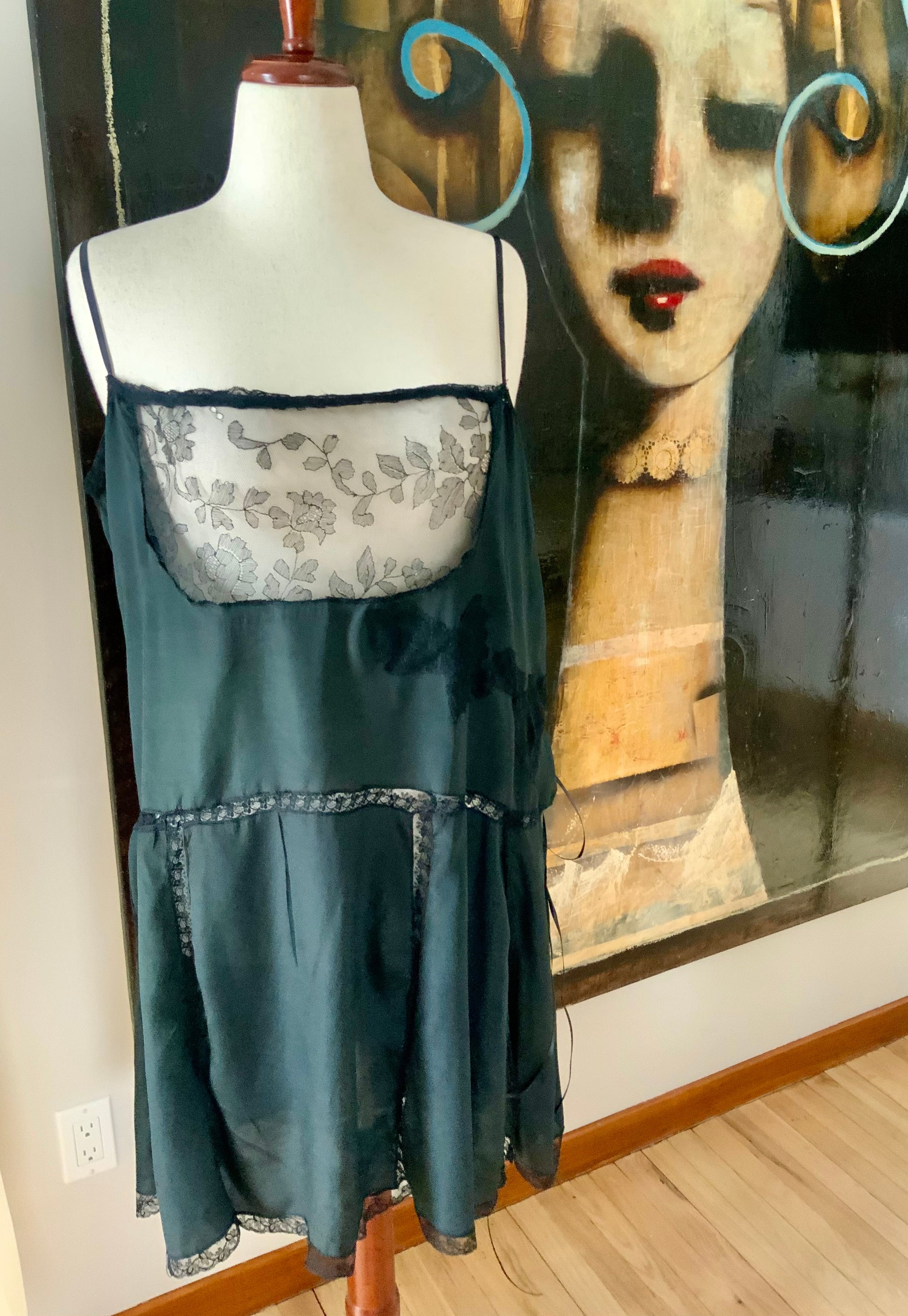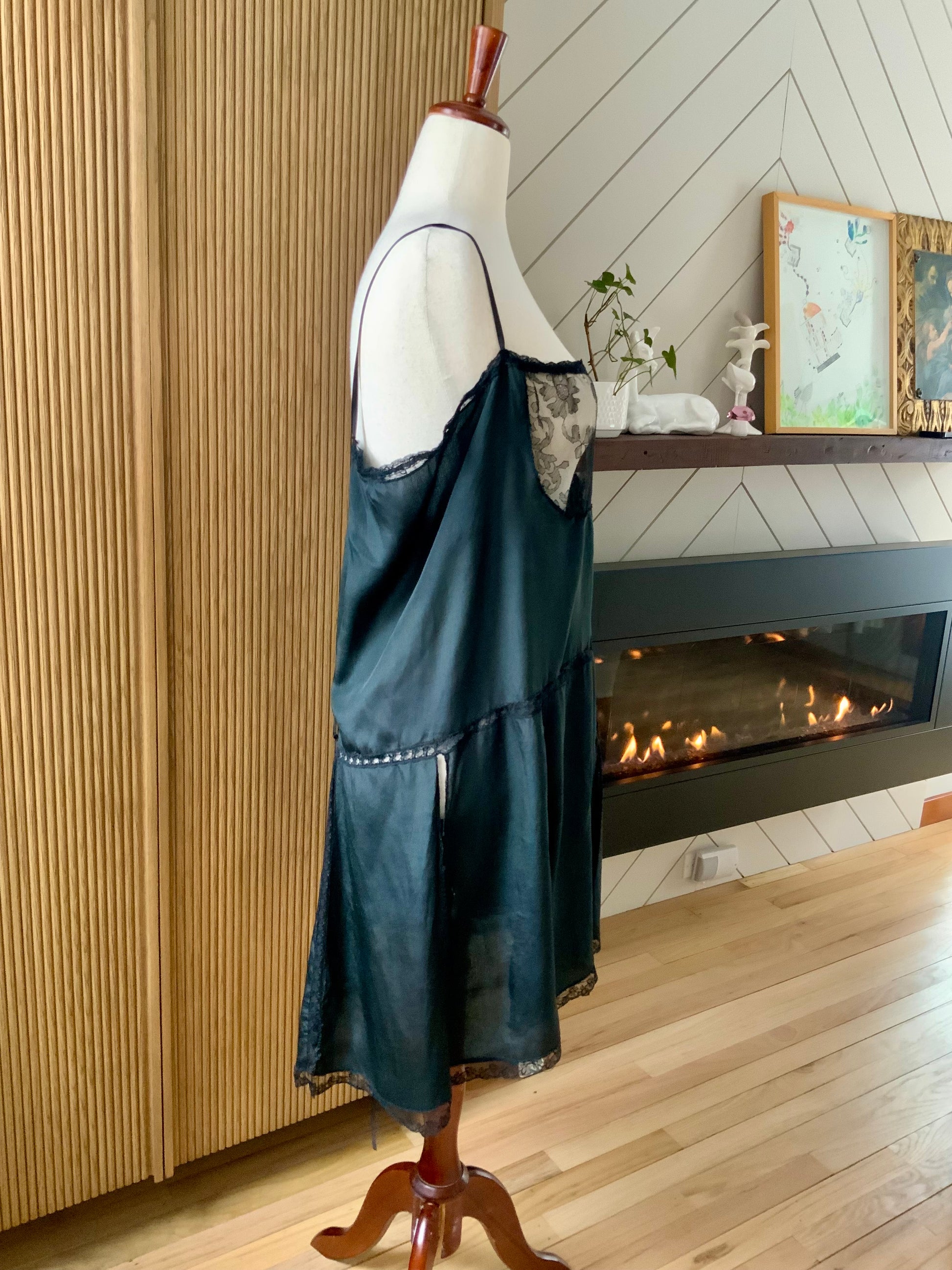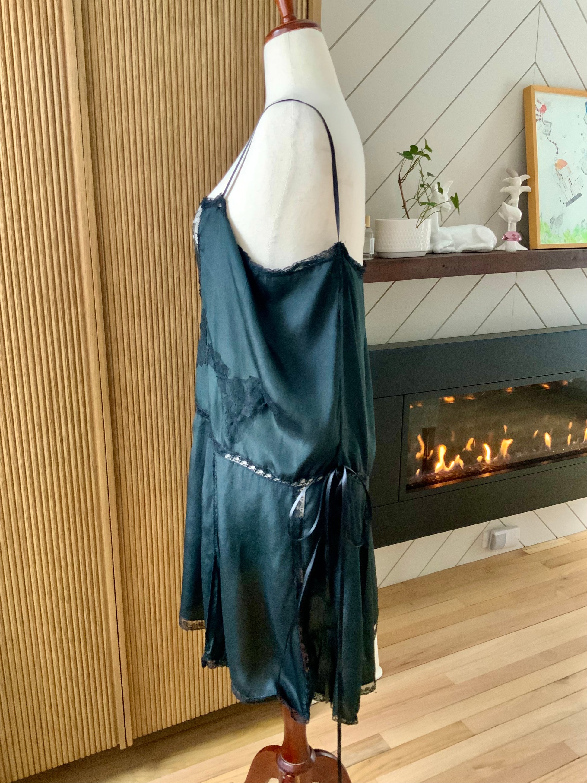 1920s–30s Pure Silk Boudoir Slip Dress — Black with Antique Lace Inset-XL-20AK
