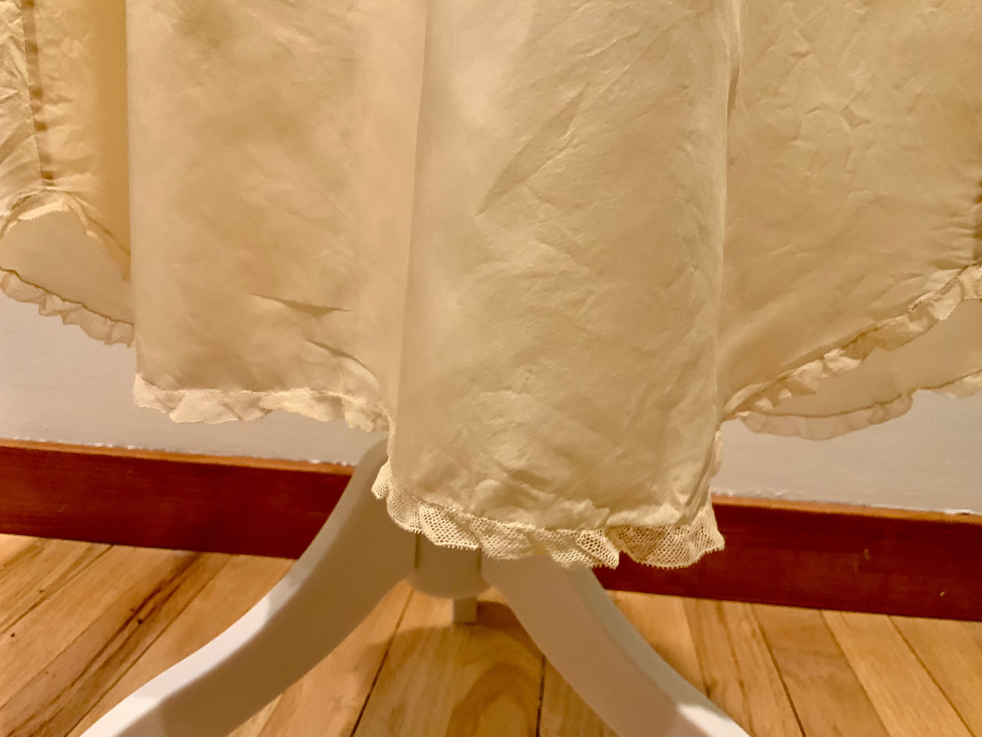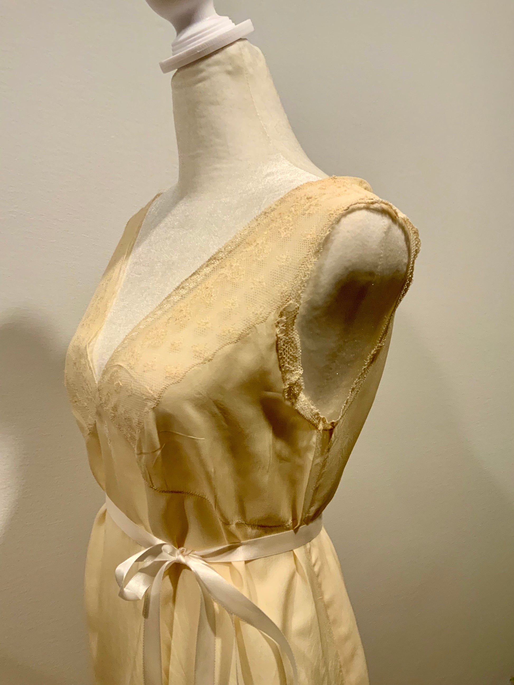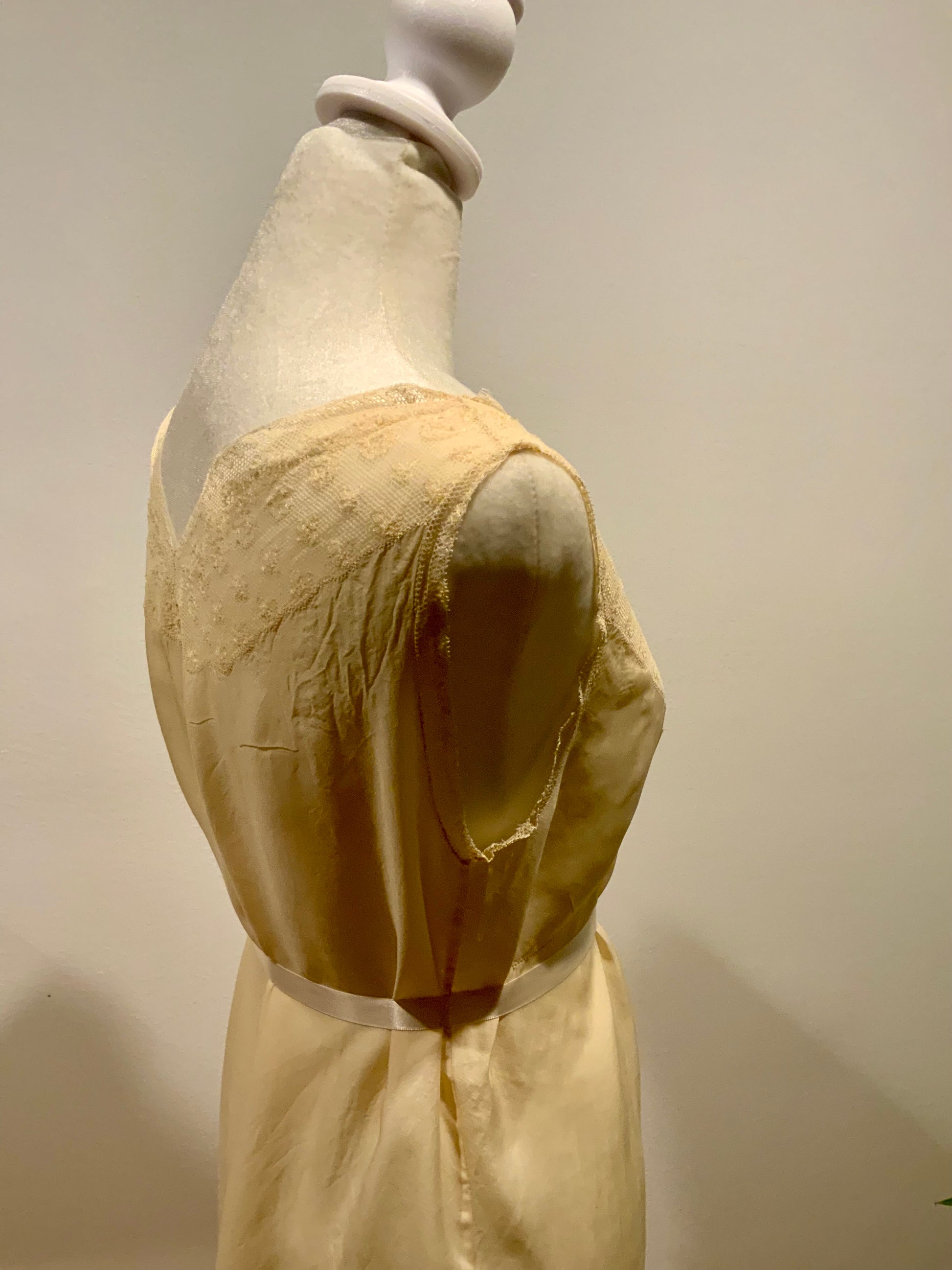 Exquisite original late 1920s–early 1930s silk lingerie dress, handcrafted in luminous champagne-toned silk with antique lace detailing.