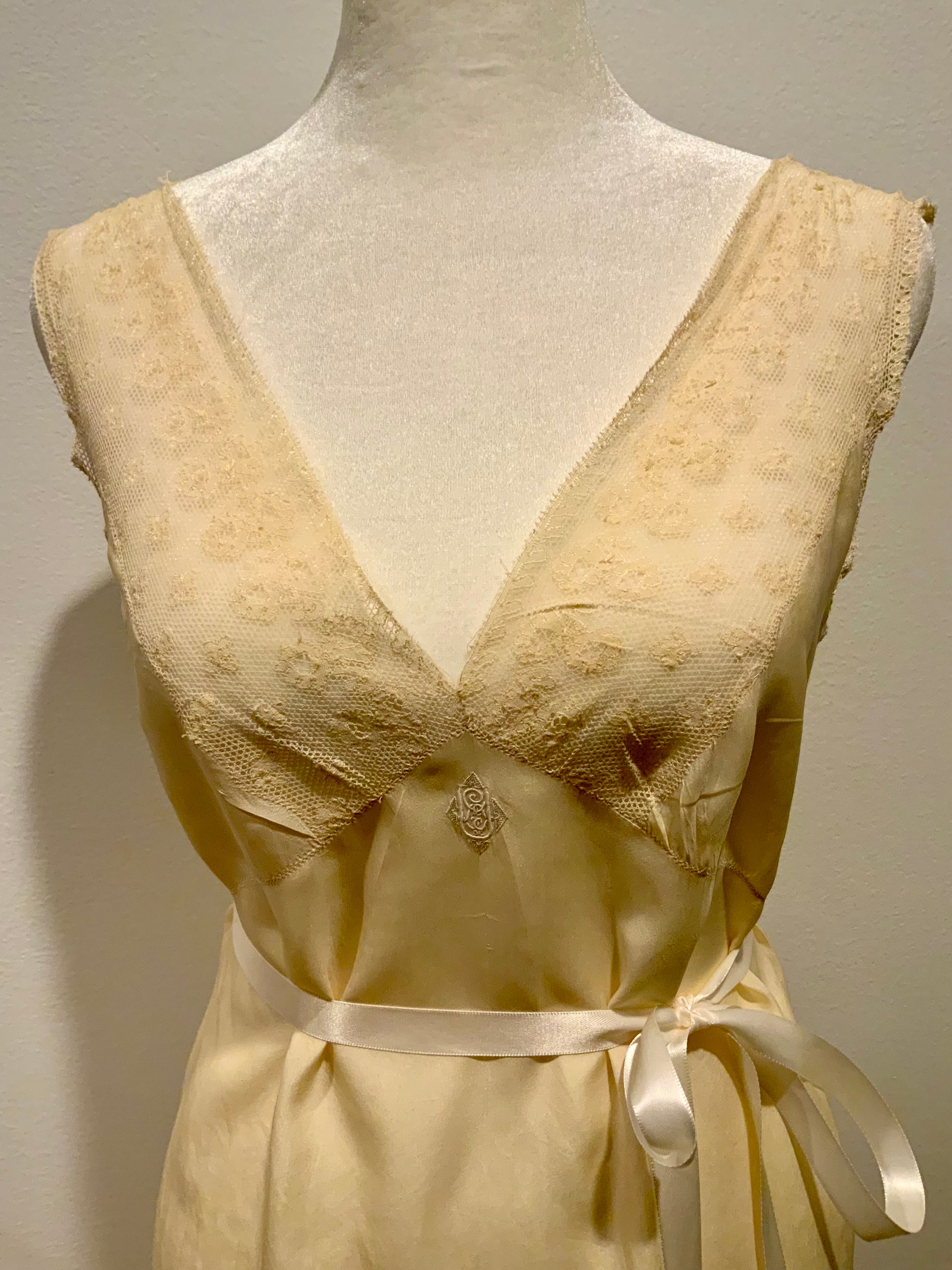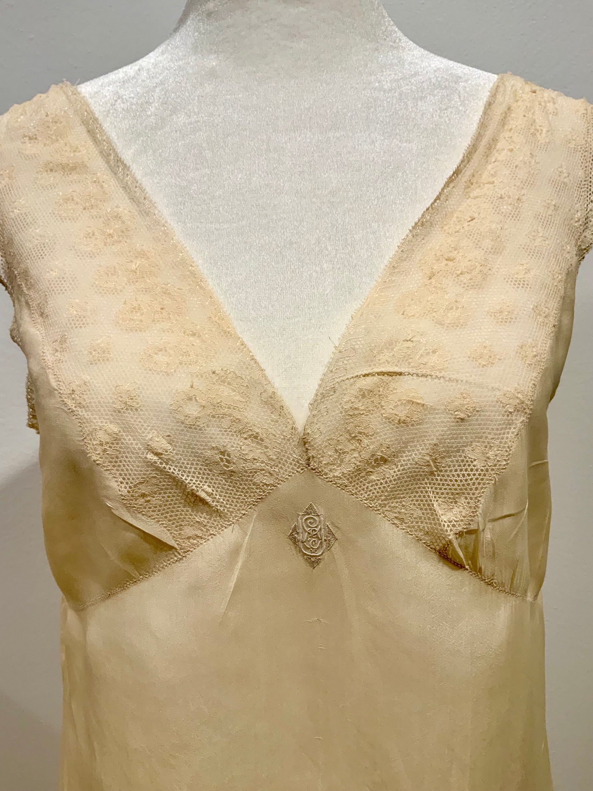This rare piece features a deep V neckline framed in delicate floral lace, a fluid bias-cut skirt, and a beautifully embroidered original monogram at the center front—indicative of a custom-made trousseau garment.