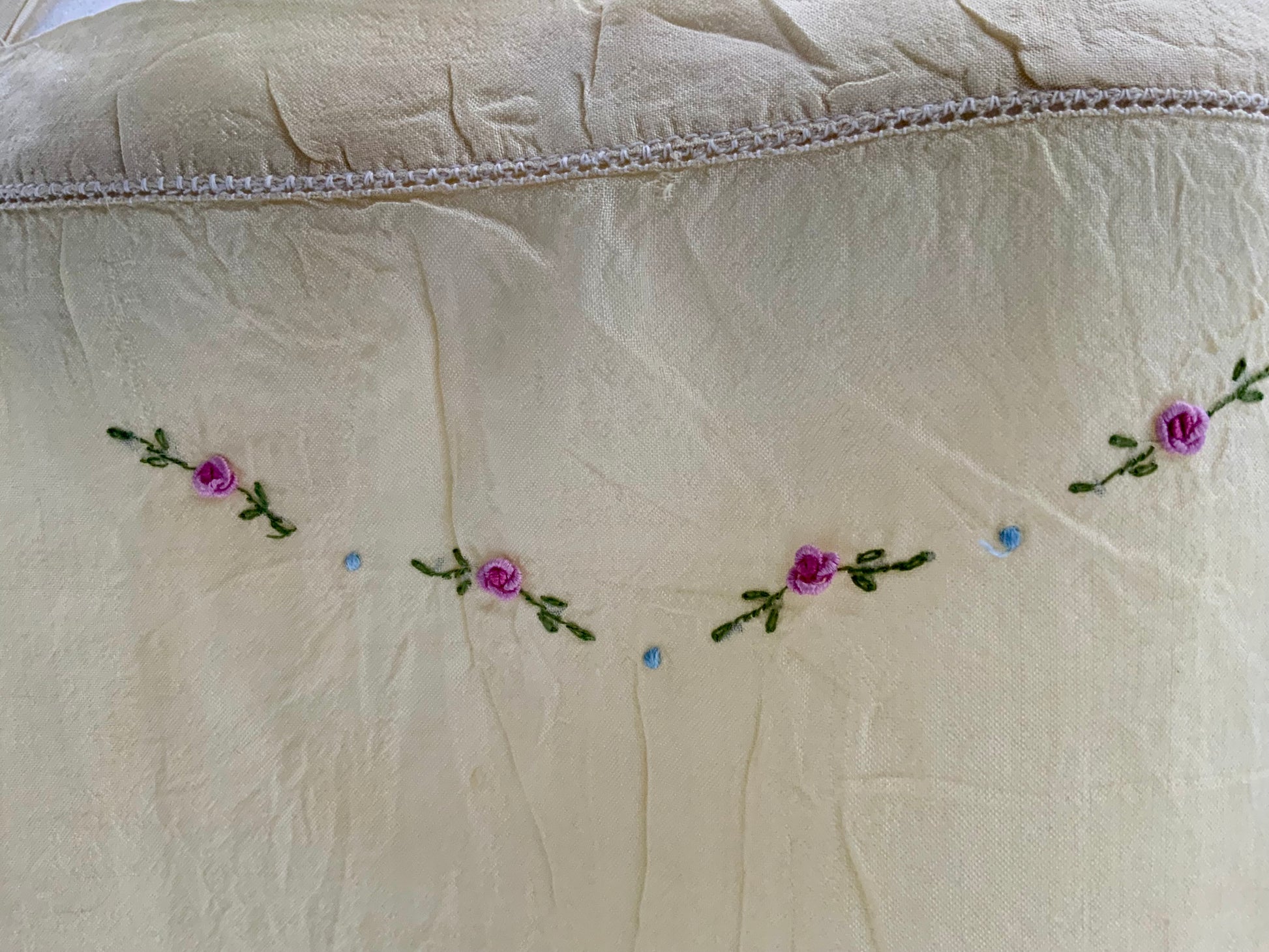 Made of whisper-light buttery silk chiffon, this piece features a softly squared neckline adorned with hand-embroidered miniature roses and floral sprigs, a signature detail of fine lingerie from the flapper era. The silhouette is intentionally loose and fluid, with a dropped waist seam and gently gathered hips — designed to skim the body rather than shape it.
