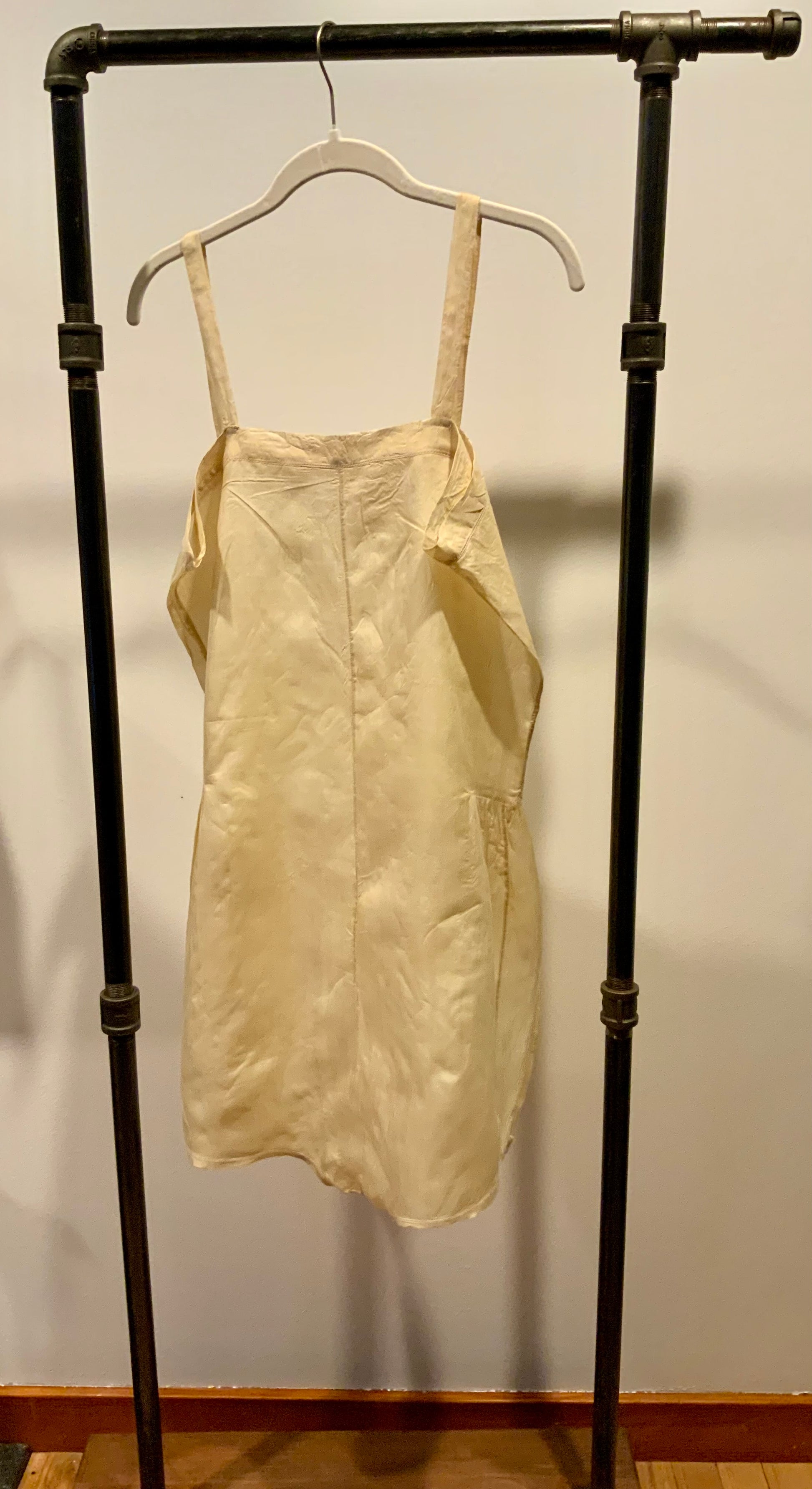 This teddy would have been stepped into and worn directly against the skin, replacing the earlier chemise-and-drawers combination. It allowed women to move freely under the straight, sheer dresses of the 1920s and represents a pivotal moment in lingerie history: when undergarments became lighter, softer, and quietly sensual.