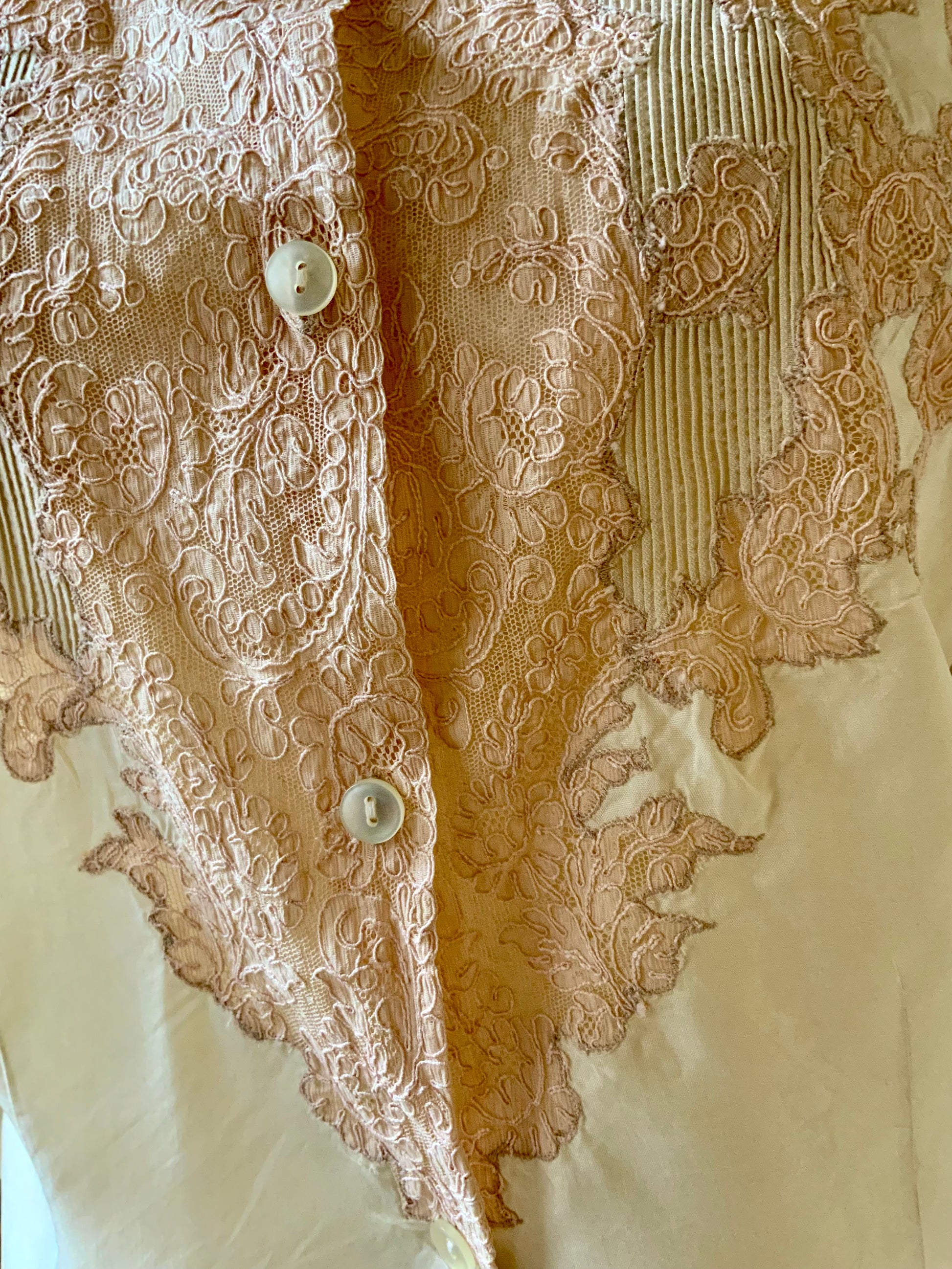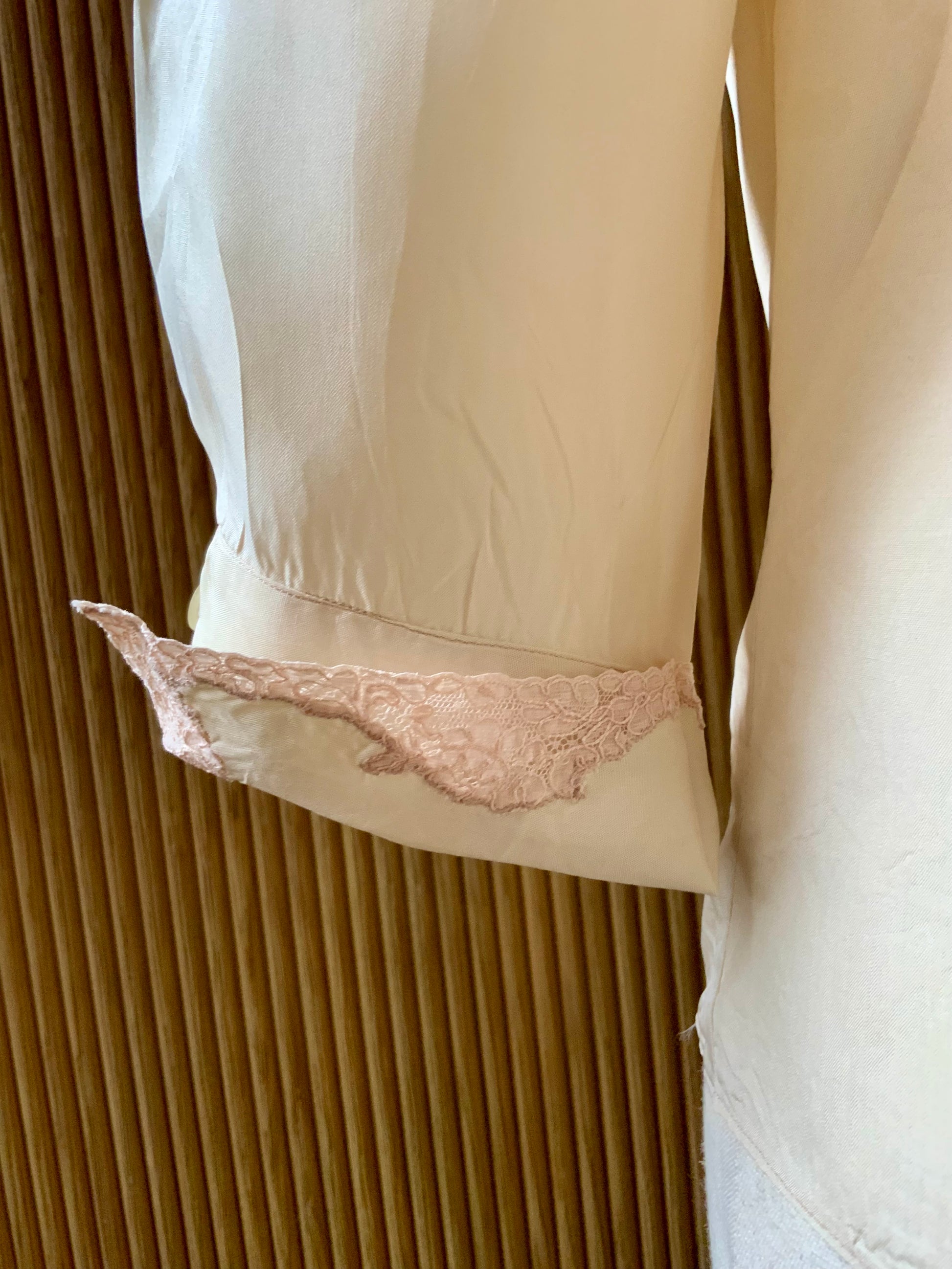 A truly exquisite 1930s silk blouse, crafted in the most delicate sheer ivory silk satin and adorned with an extraordinary blush lace appliqué panel.