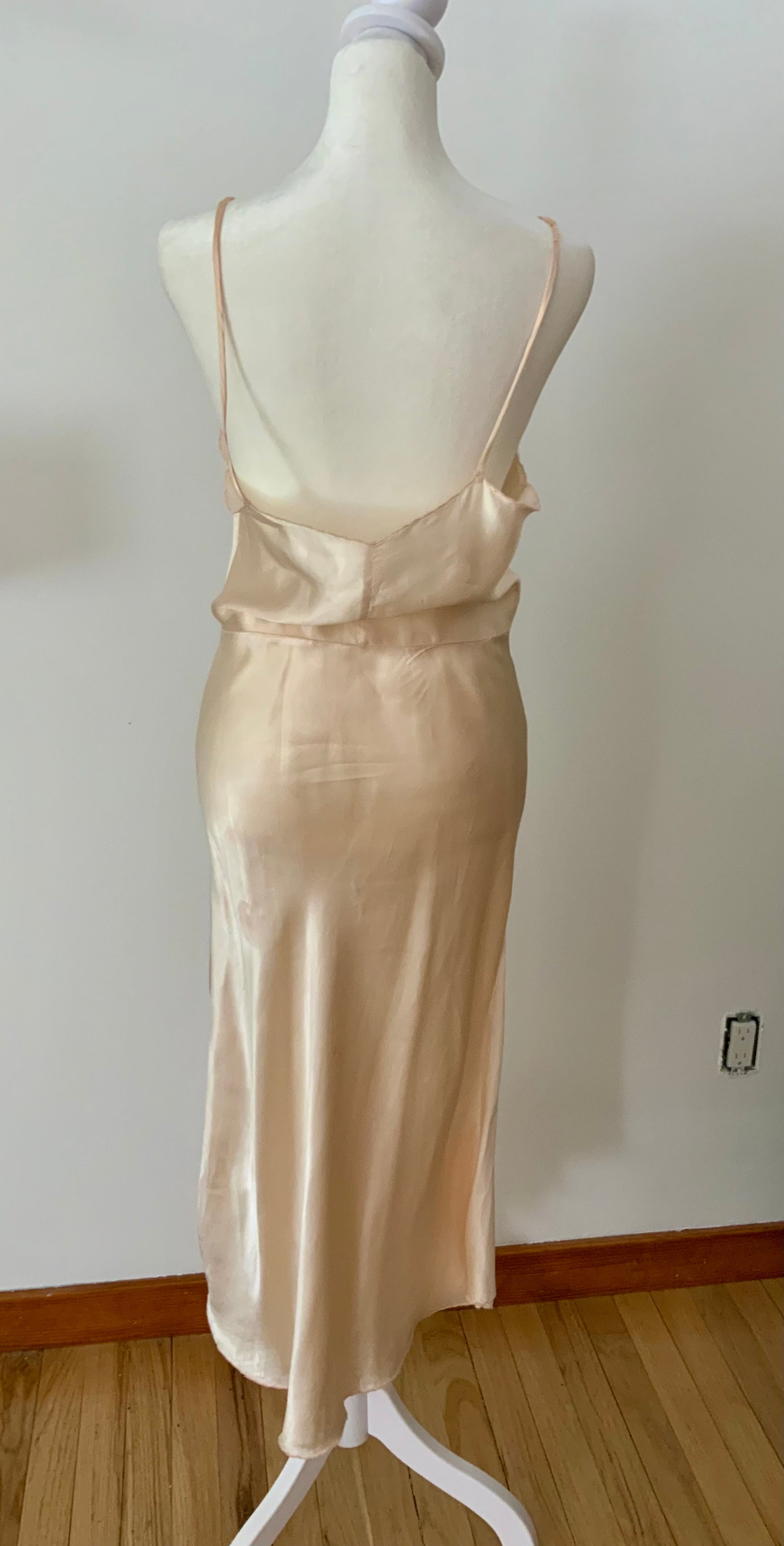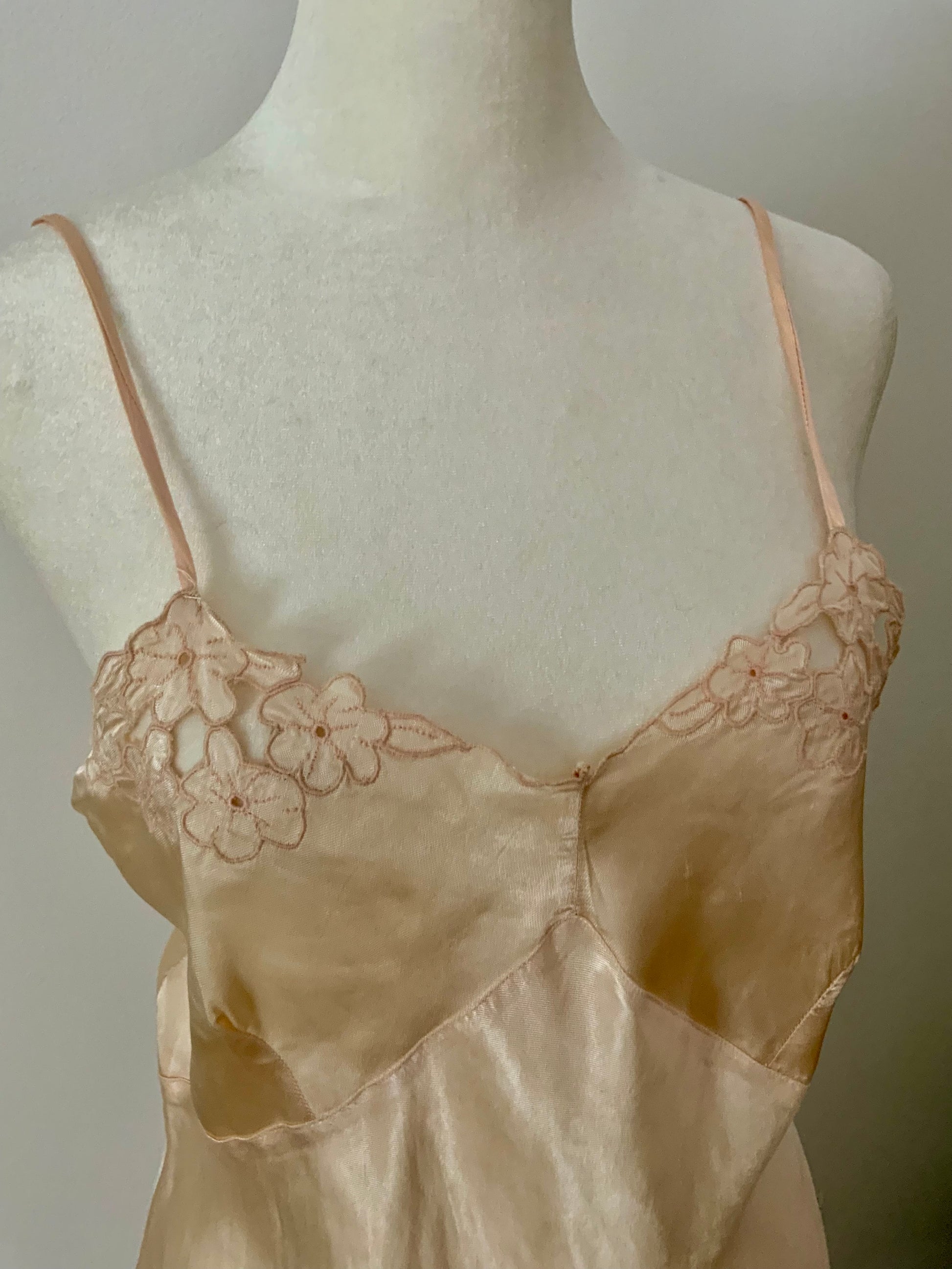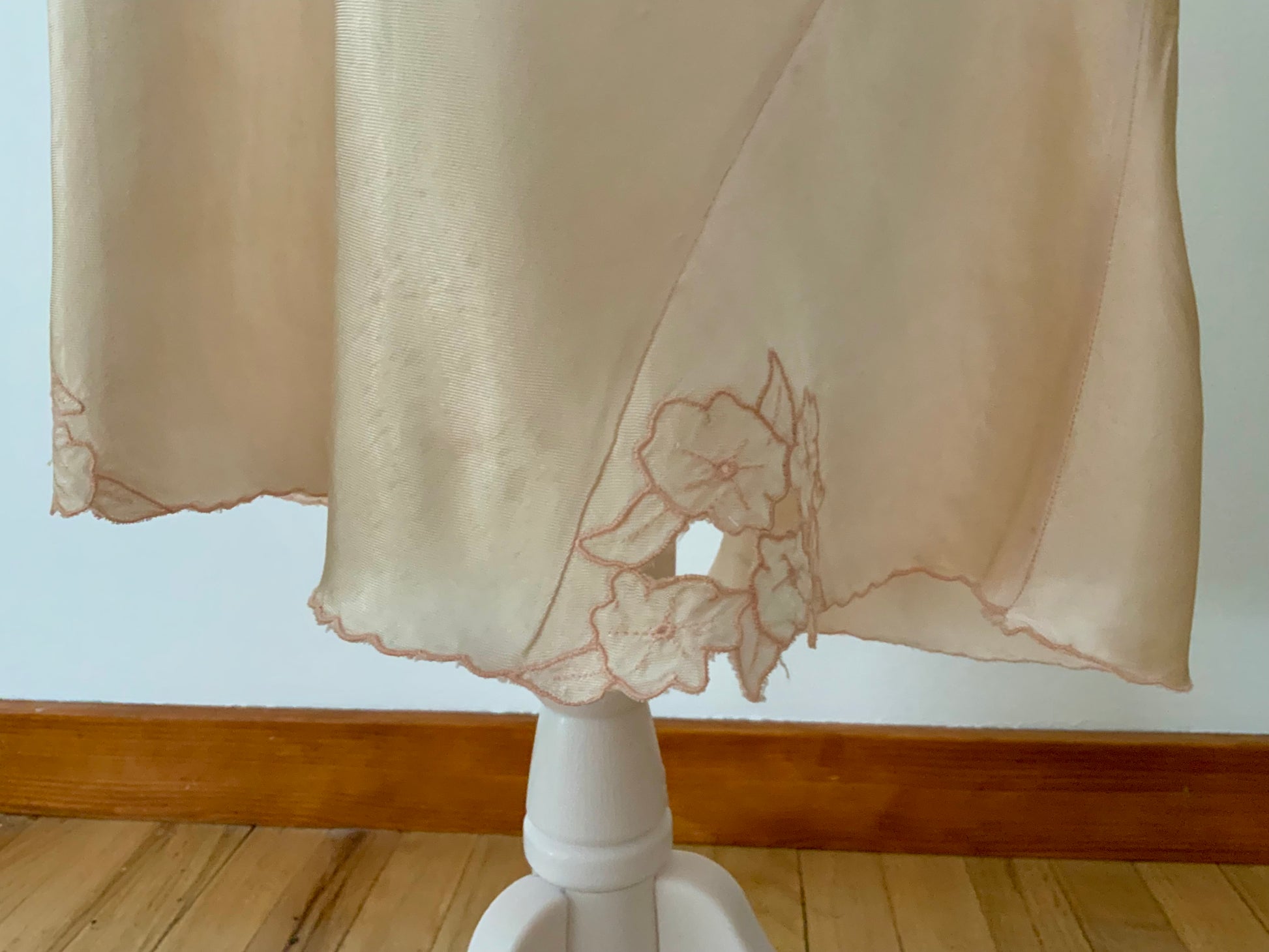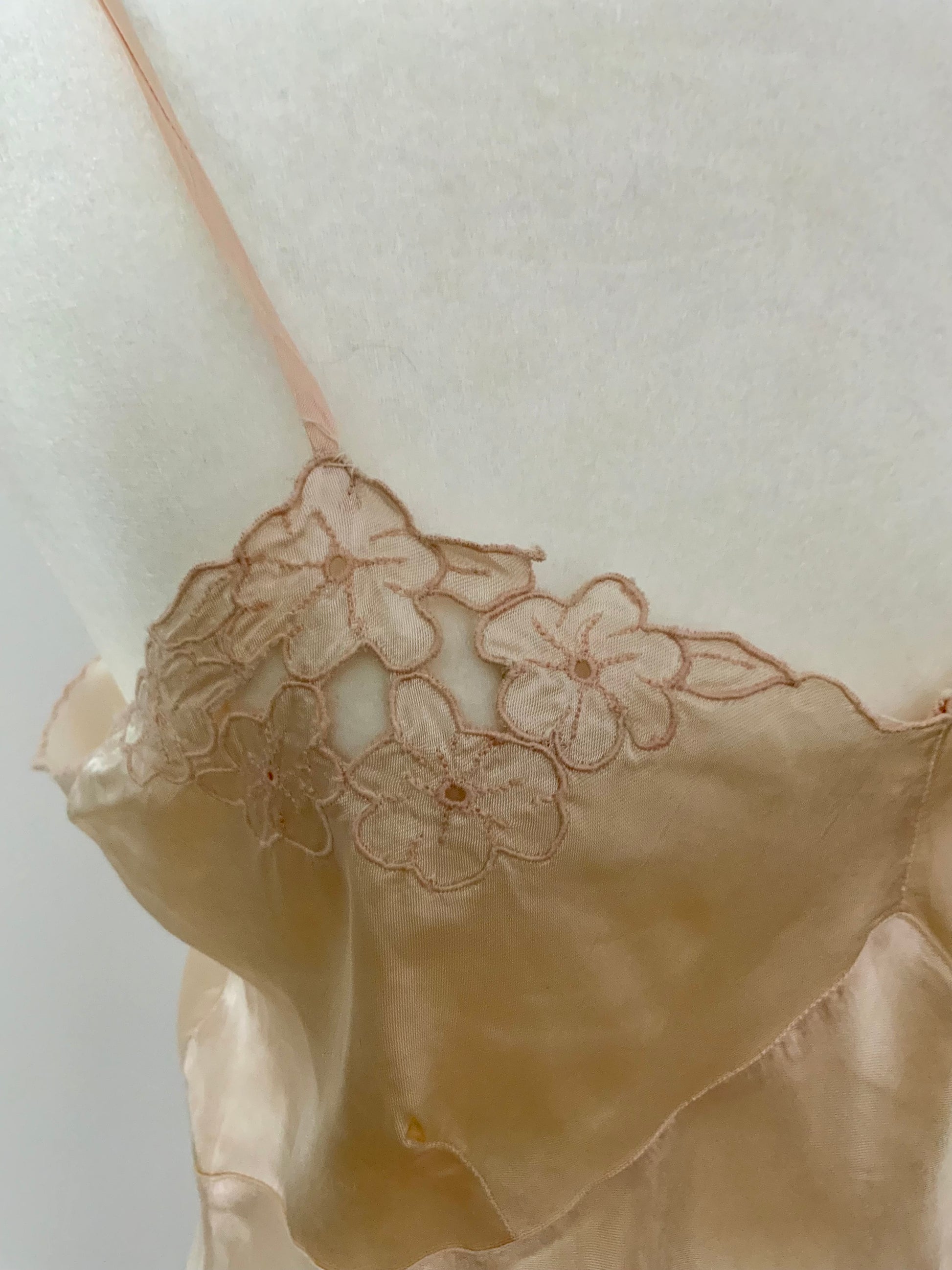 Exquisite original late 1930s–early 1940s silk satin slip dress in a soft champagne tone. Crafted in fluid bias-cut silk, this rare lingerie gown features delicate hand-applied floral lace along the neckline and hem, fine silk straps, and a softly scooped back.