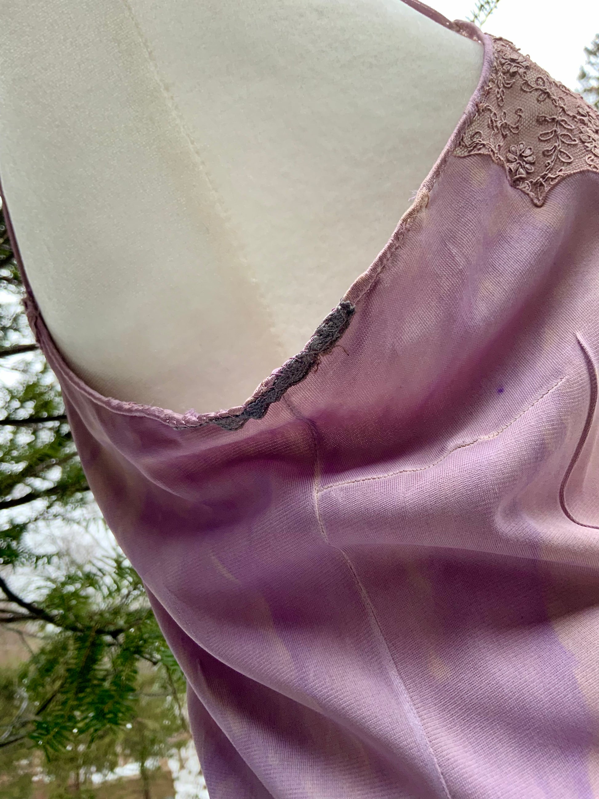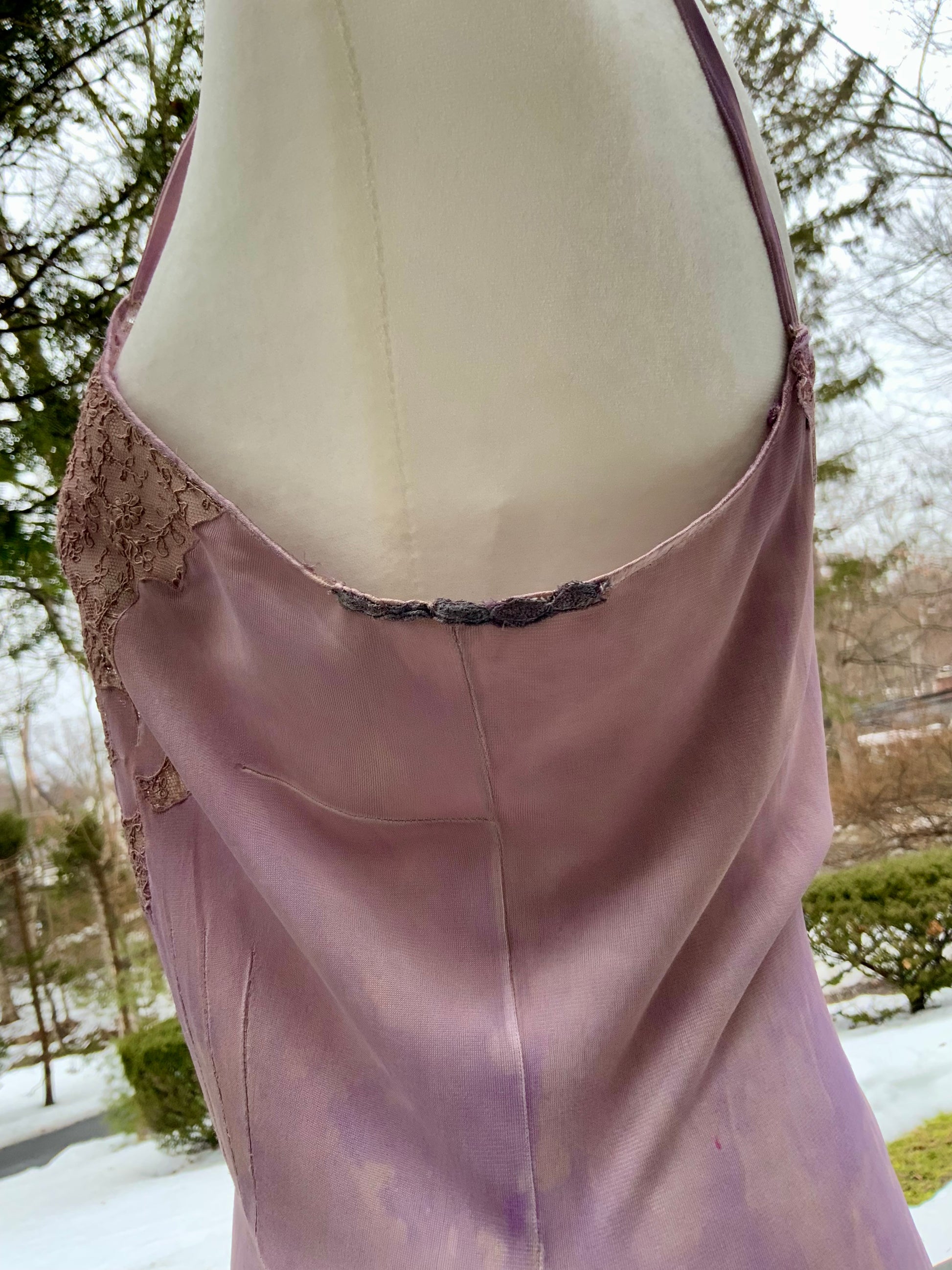 Vintage late 1980s to 1990s slip dress crafted from soft stretch fabric composed of polyester with elastane, hand-dyed to a romantic lilac tone with subtle tonal variations that create depth and a one-of-a-kind