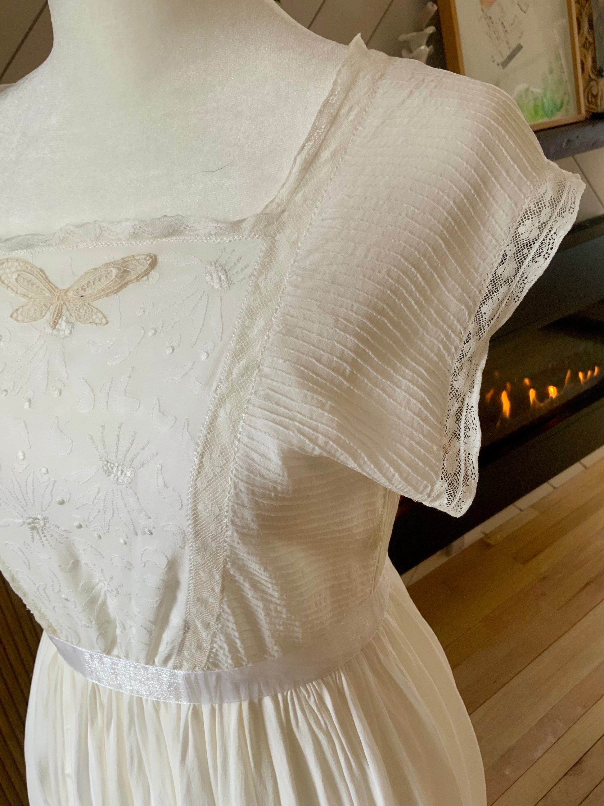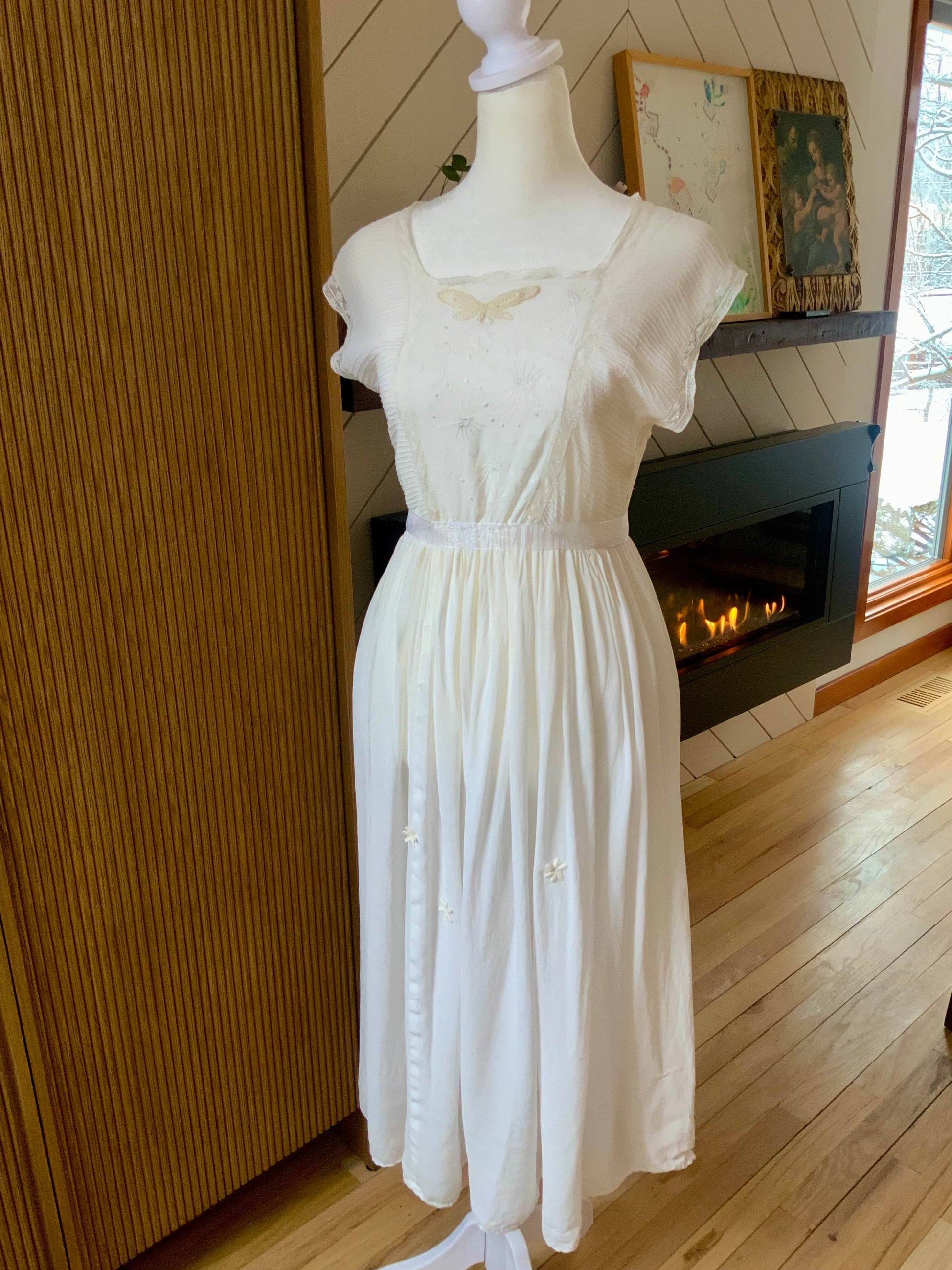 A rare and exquisitely romantic late-1930s silk lingerie dress in soft antique ivory, featuring delicate hand embroidery and an ethereal butterfly motif across the bodice.