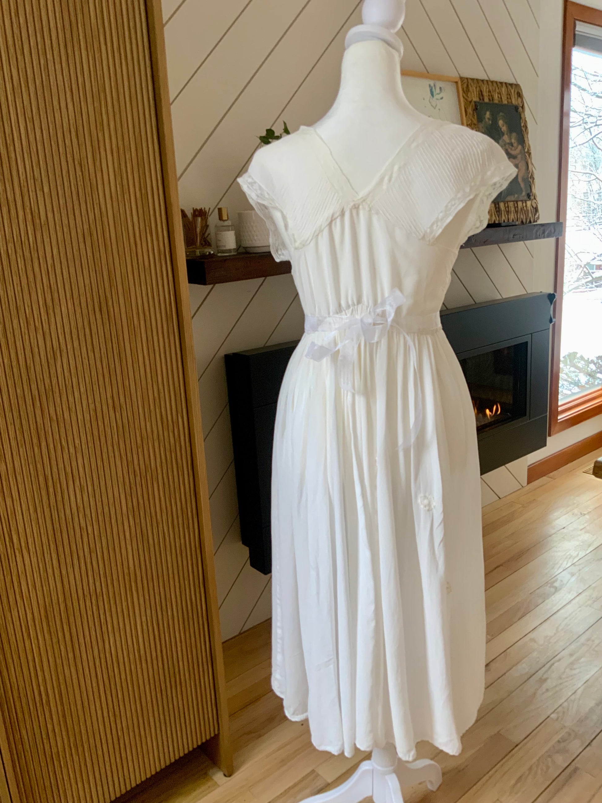 This dress embodies the quiet luxury of intimate pre-1940s fashion — delicate, refined, and deeply romantic.