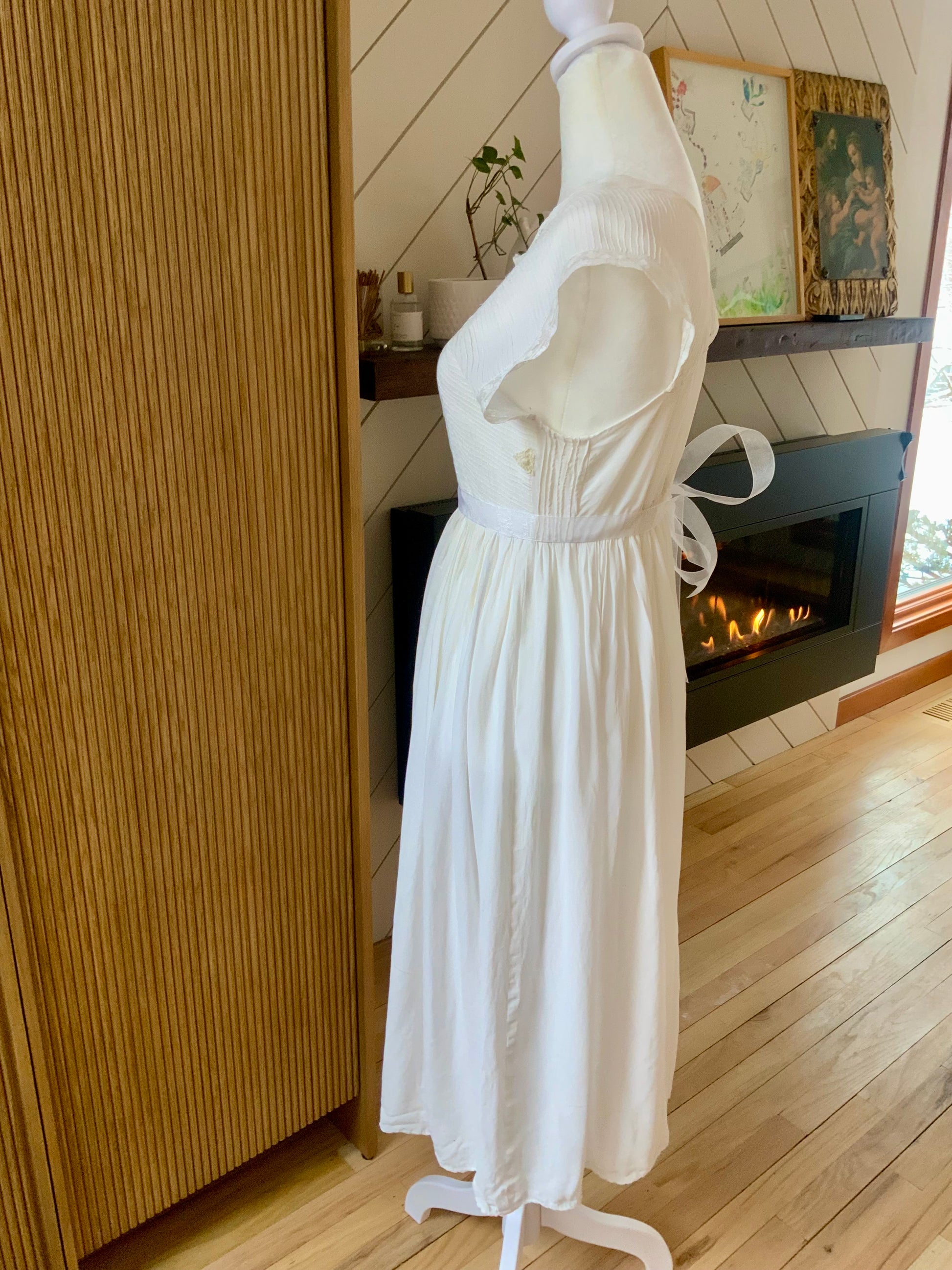 Cut from feather-light silk chiffon or crepe, the gown drapes fluidly from softly gathered shoulders into a flowing skirt that moves beautifully with the body. Fine pintucking shapes the bodice and sleeves, while lace edging frames the neckline with understated elegance. The deep V-back adds a graceful, feminine silhouette typical of pre-war boudoir pieces.