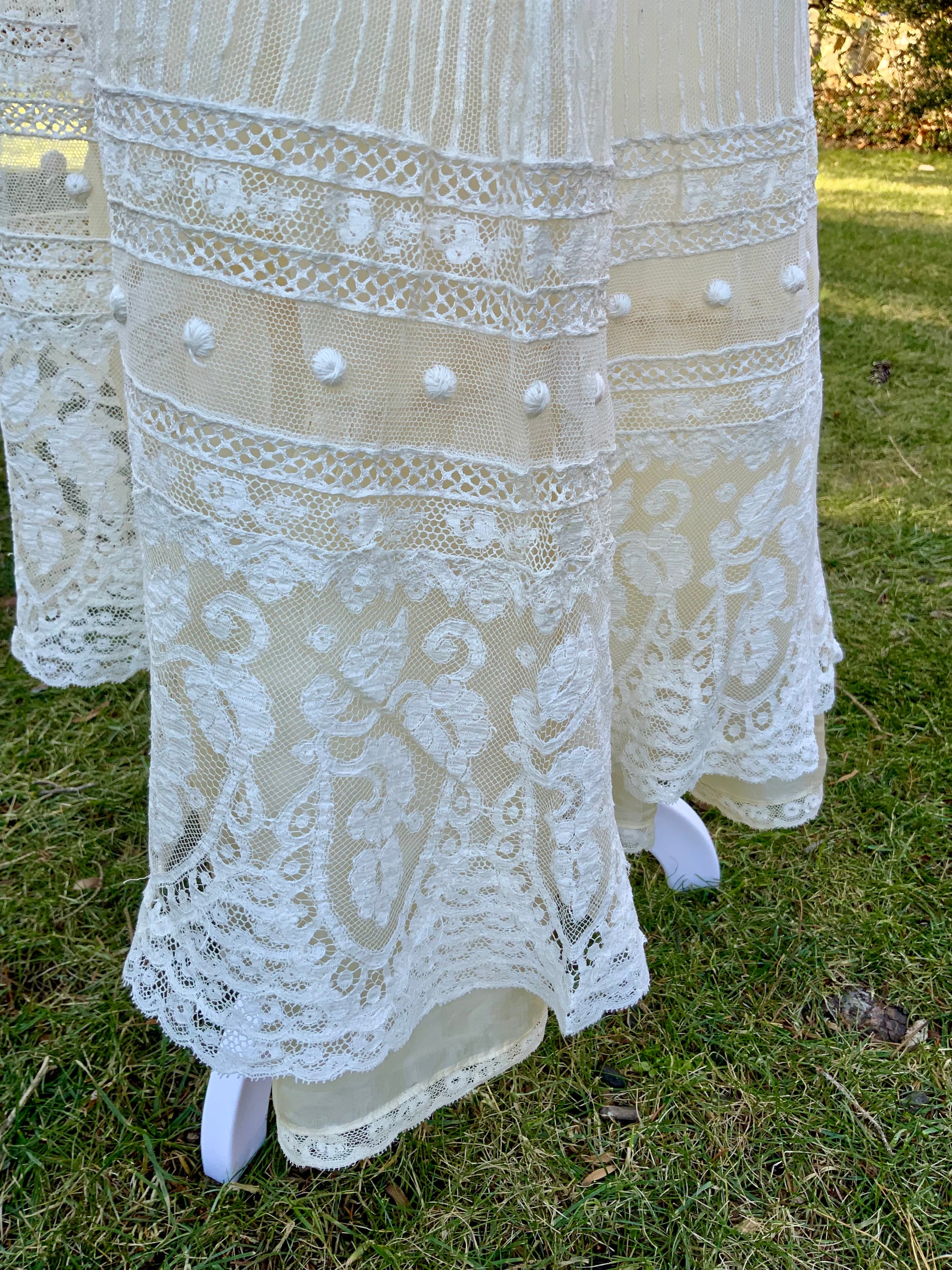 The skirt is finished with layered horizontal lace bands, plumetis (raised embroidered dots), and a wide floral lace border at the hem — details that are emblematic of luxury Edwardian lingerie dresses and increasingly rare today.